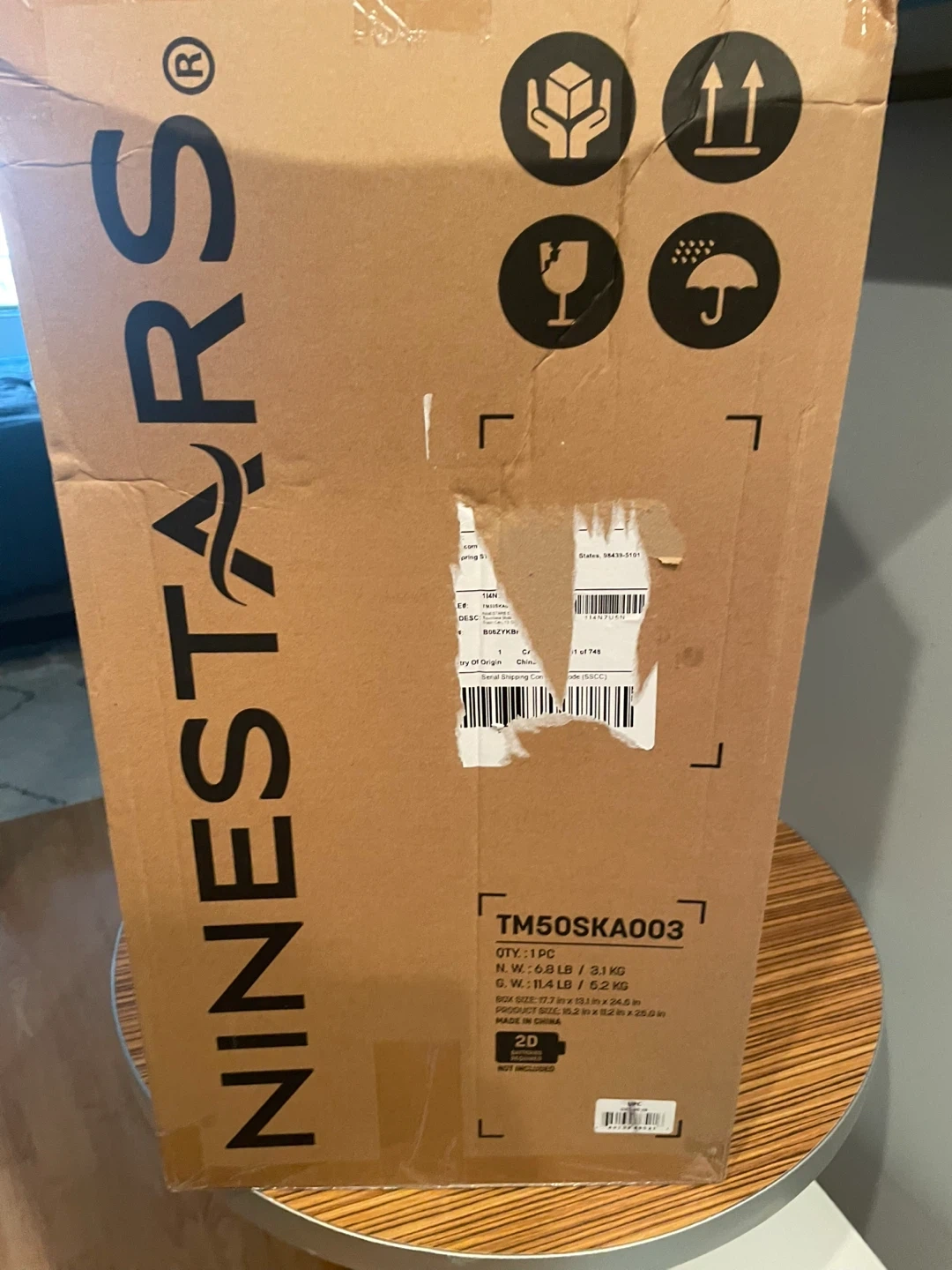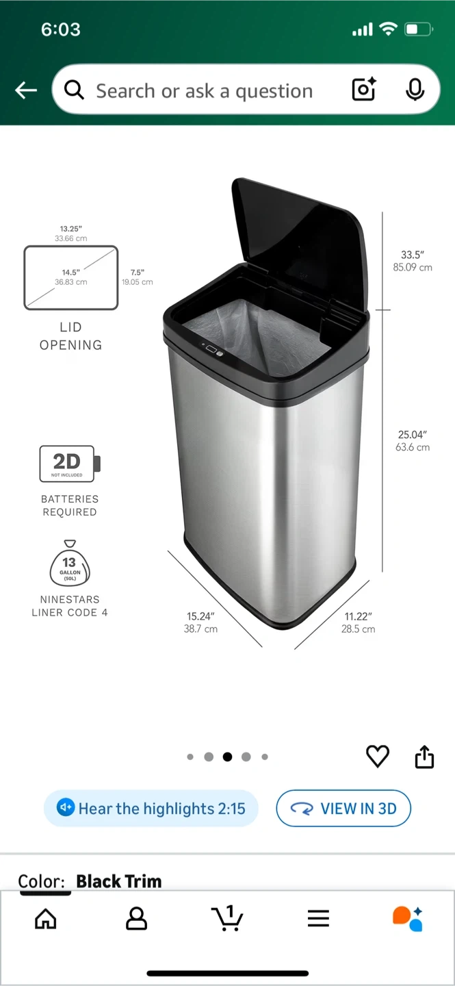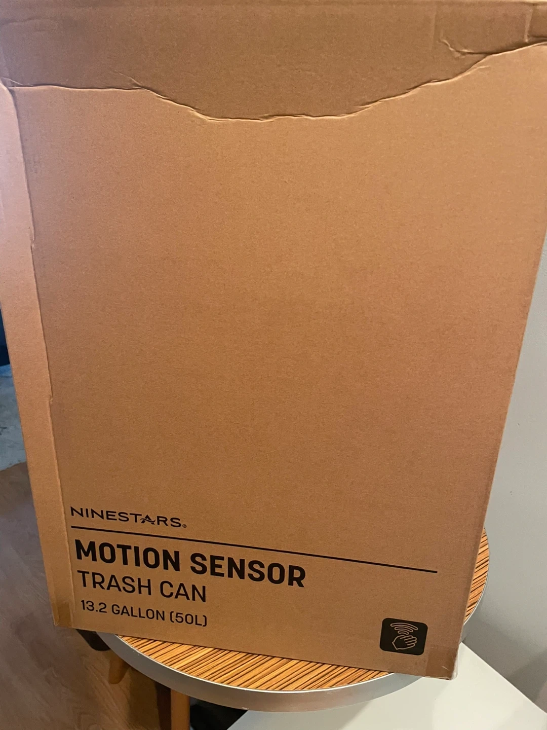 60Selling a Brand New NINESTARS motion sensor trash can. It has a 13.2 gallon (50L) capacity. - QTY: 1 PC - N. W.: 6.8 LB / 3.1 KG - G. W.: 11.4 LB / 5.2 KG - PRODUCT SIZE: 15.2 in x 11.2 in x 25.0 in Batteries are not included. Box is included