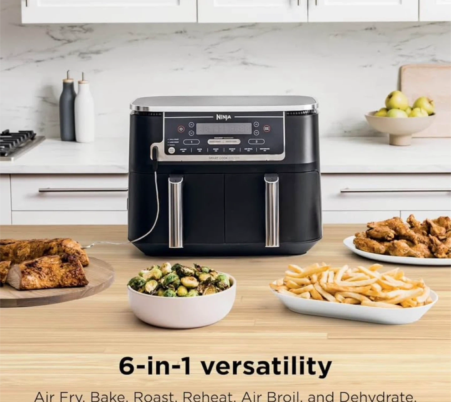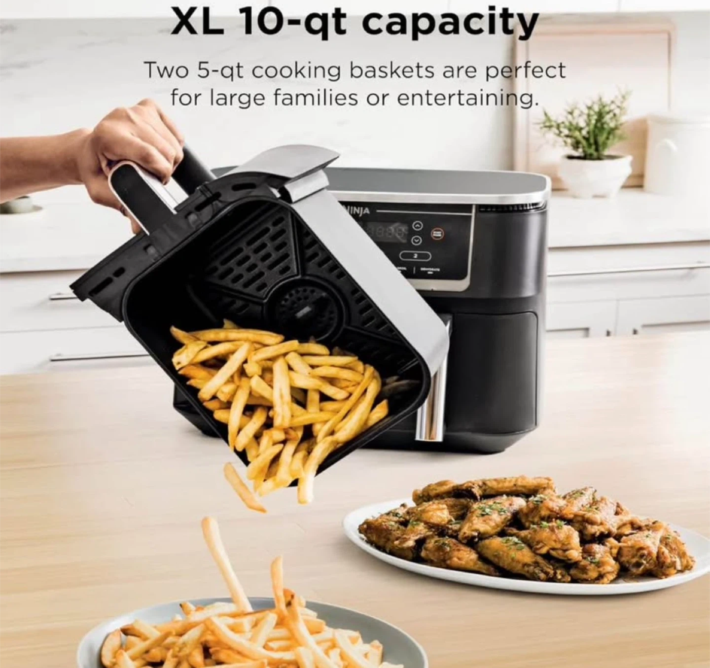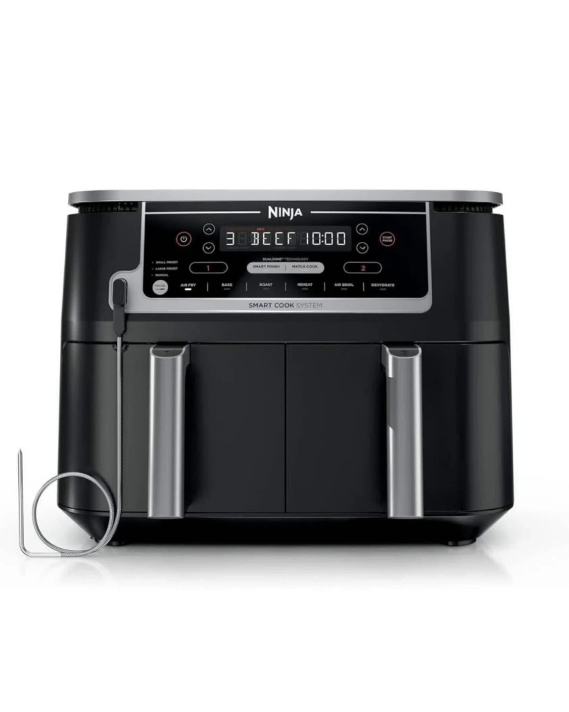 10I'm selling a Ninja Foodi 6-in-1 DualZone Air Fryer. This XL 10-qt capacity air fryer has two 5-qt cooking baskets, perfect for large families. It offers 6-in-1 versatility: Air Fry, Bake, Roast, Reheat, Air Broil, and Dehydrate. It also features an auto shut-off. Top highlights Special Feature 2 Separate Air Frying Baskets, Dishwasher Safe Parts, Foodi Smart Thermometer for Perfect Doneness Product Dimensions 17.1"D x 13.9"W x 12.8"H Color Grey Capacity 10 Quarts Material Plastic, Stainless Steel Recommended Uses For Product Bake, Broil, Defrost, Dehydrate, Reheat, Roast WHAT'S INCLUDED: Ninja Foodi Dual Zone Air Fryer, Foodi Smart Thermometer, (2) 5 Quart Baskets, (2) Nonstick Crisper Plates & 15-Recipe Guide. 6 VERSATILE COOKING PROGRAMS: Air Fry, Air Broil, Roast, Bake, Reheat, and Dehydrate. 2 INDEPENDENT 5-QT. XL ZONES: They have their own cooking baskets, cyclonic fans, and rapid heaters. SMART COOK SYSTEM: Achieve the perfect doneness, from rare to well-done, at the touch of a button with the integrated Foodi Smart Thermometer—no guesswork required. EASY TO CLEAN: Includes nonstick cooking baskets and dishwasher-safe crisper plates. DUALZONE TECHNOLOGY: The Smart Finish feature, unlocks cooking 2 foods 2 ways that finish at the same time, or the Match Cook feature, easily copies settings across zones for full 10-qt. capacity. IQ BOOST: Optimally distributes power across each basket to cook a 6-lb. whole chicken and side as quickly as possible when Match Cook or Smart Finish is not selected. XL 10-QT. CAPACITY AND 2 BASKETS: Cook a main and a side at the same time for quick, large family meals, or cook up to 8 -lbs. of chicken wings with ease. 2 FOODS, 2 WAYS, AT THE SAME TIME: Eliminating back-to-back cooking like a traditional single-basket air fryer with 2 independent XL air fryer baskets. FASTER COOKING: Cooks two 6-lb. chickens up to 30% faster than a traditional oven. Frozen-to-crispy meals in 30 minutes. Wide temperature range, from: 105°F–450°F.