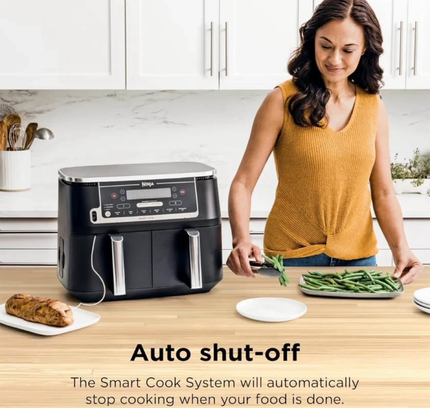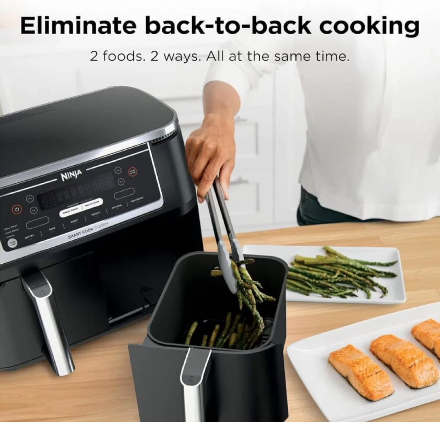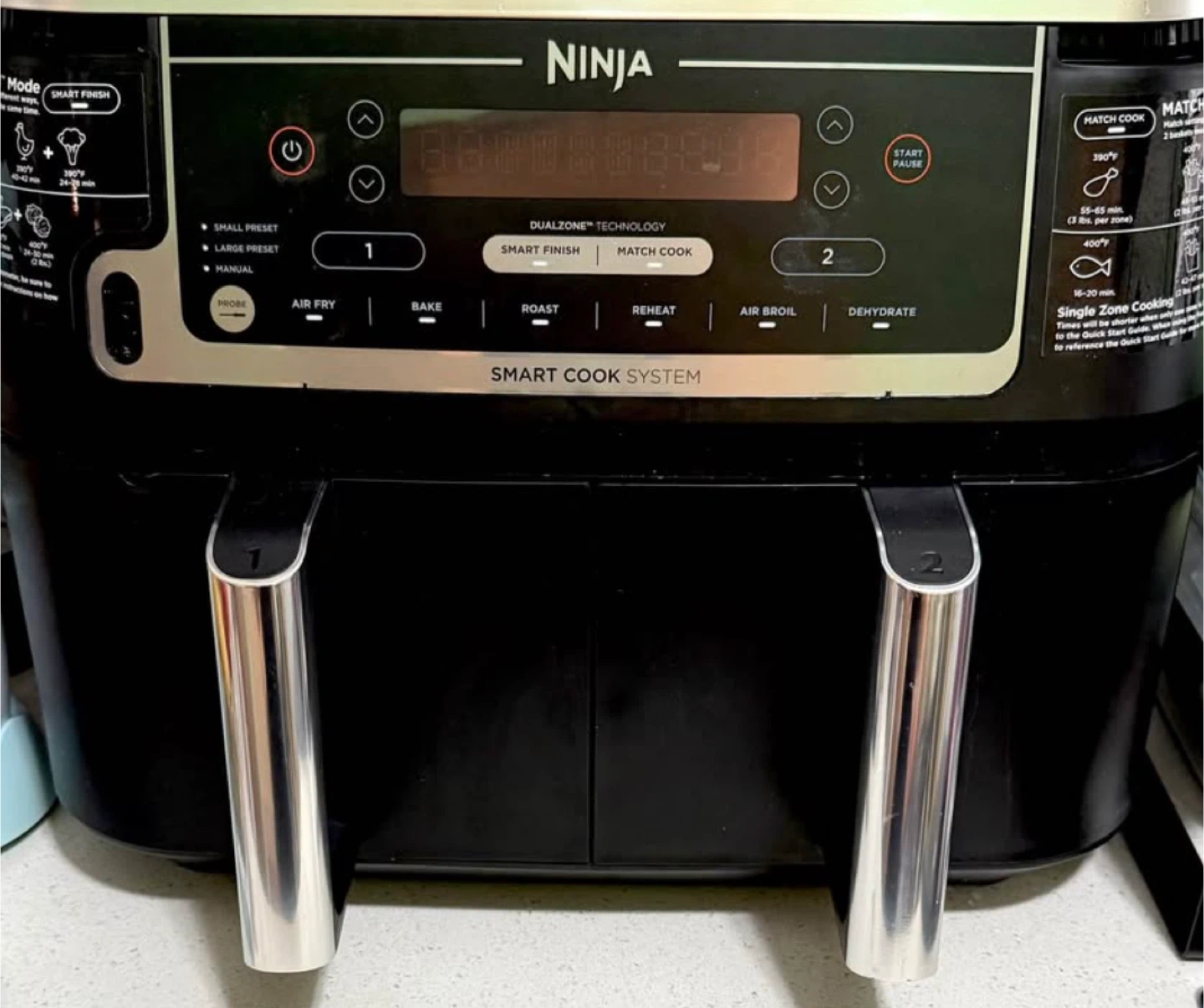 10I'm selling a Ninja Foodi 6-in-1 DualZone Air Fryer. This XL 10-qt capacity air fryer has two 5-qt cooking baskets, perfect for large families. It offers 6-in-1 versatility: Air Fry, Bake, Roast, Reheat, Air Broil, and Dehydrate. It also features an auto shut-off. Top highlights Special Feature 2 Separate Air Frying Baskets, Dishwasher Safe Parts, Foodi Smart Thermometer for Perfect Doneness Product Dimensions 17.1"D x 13.9"W x 12.8"H Color Grey Capacity 10 Quarts Material Plastic, Stainless Steel Recommended Uses For Product Bake, Broil, Defrost, Dehydrate, Reheat, Roast WHAT'S INCLUDED: Ninja Foodi Dual Zone Air Fryer, Foodi Smart Thermometer, (2) 5 Quart Baskets, (2) Nonstick Crisper Plates & 15-Recipe Guide. 6 VERSATILE COOKING PROGRAMS: Air Fry, Air Broil, Roast, Bake, Reheat, and Dehydrate. 2 INDEPENDENT 5-QT. XL ZONES: They have their own cooking baskets, cyclonic fans, and rapid heaters. SMART COOK SYSTEM: Achieve the perfect doneness, from rare to well-done, at the touch of a button with the integrated Foodi Smart Thermometer—no guesswork required. EASY TO CLEAN: Includes nonstick cooking baskets and dishwasher-safe crisper plates. DUALZONE TECHNOLOGY: The Smart Finish feature, unlocks cooking 2 foods 2 ways that finish at the same time, or the Match Cook feature, easily copies settings across zones for full 10-qt. capacity. IQ BOOST: Optimally distributes power across each basket to cook a 6-lb. whole chicken and side as quickly as possible when Match Cook or Smart Finish is not selected. XL 10-QT. CAPACITY AND 2 BASKETS: Cook a main and a side at the same time for quick, large family meals, or cook up to 8 -lbs. of chicken wings with ease. 2 FOODS, 2 WAYS, AT THE SAME TIME: Eliminating back-to-back cooking like a traditional single-basket air fryer with 2 independent XL air fryer baskets. FASTER COOKING: Cooks two 6-lb. chickens up to 30% faster than a traditional oven. Frozen-to-crispy meals in 30 minutes. Wide temperature range, from: 105°F–450°F.