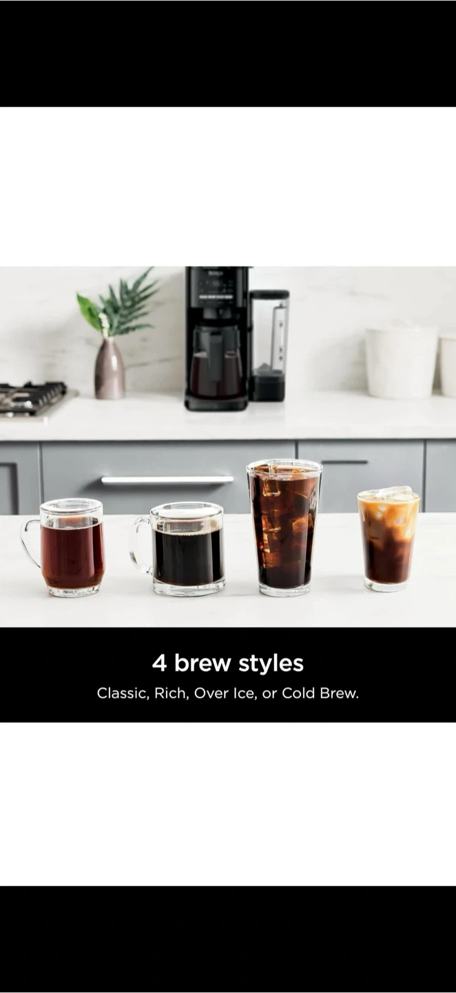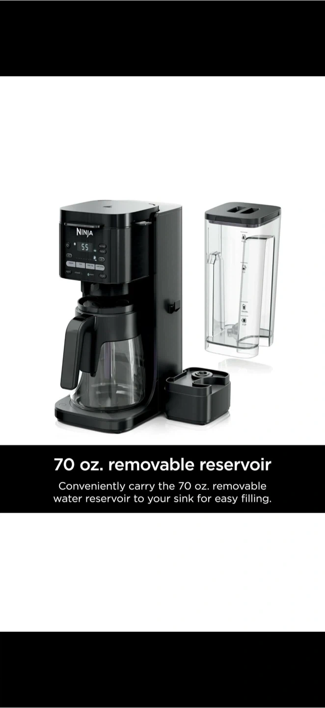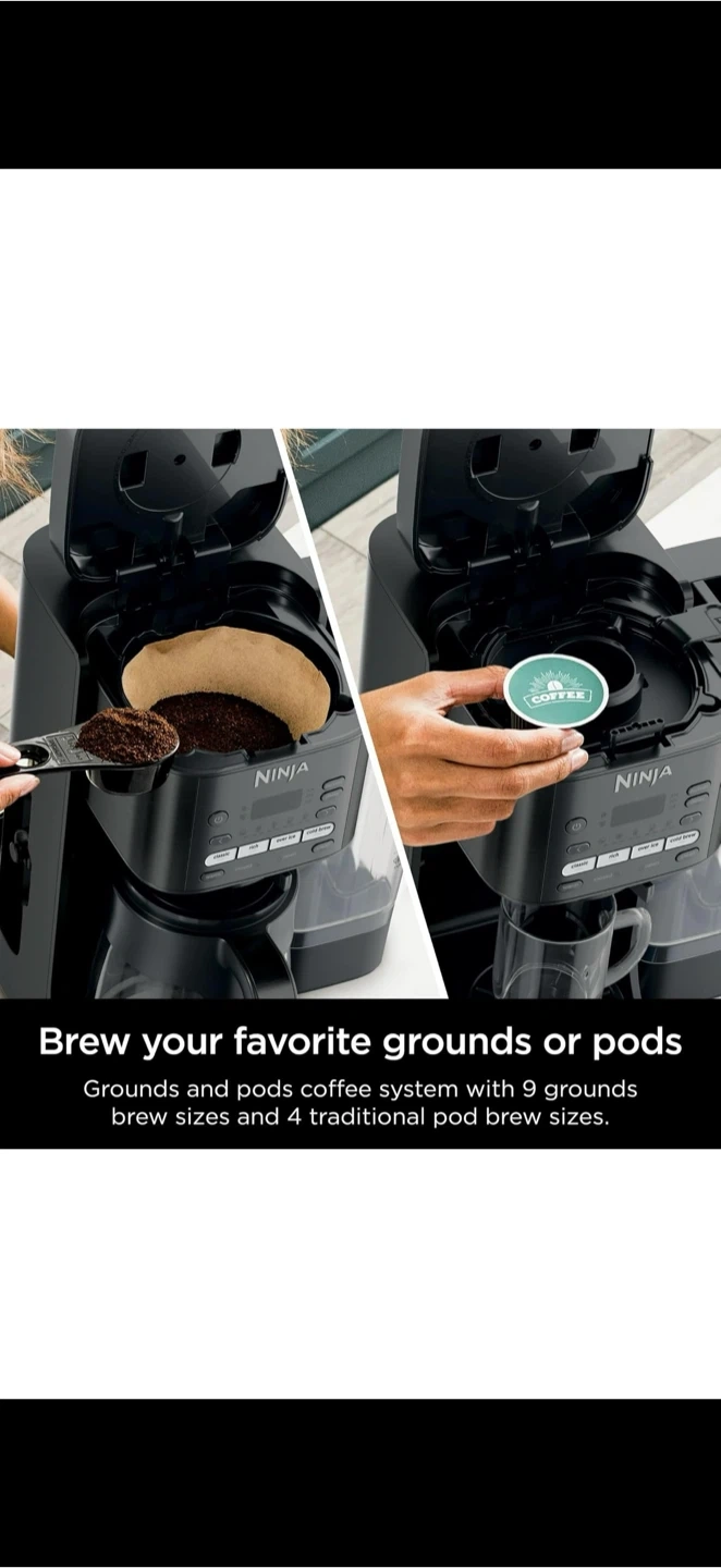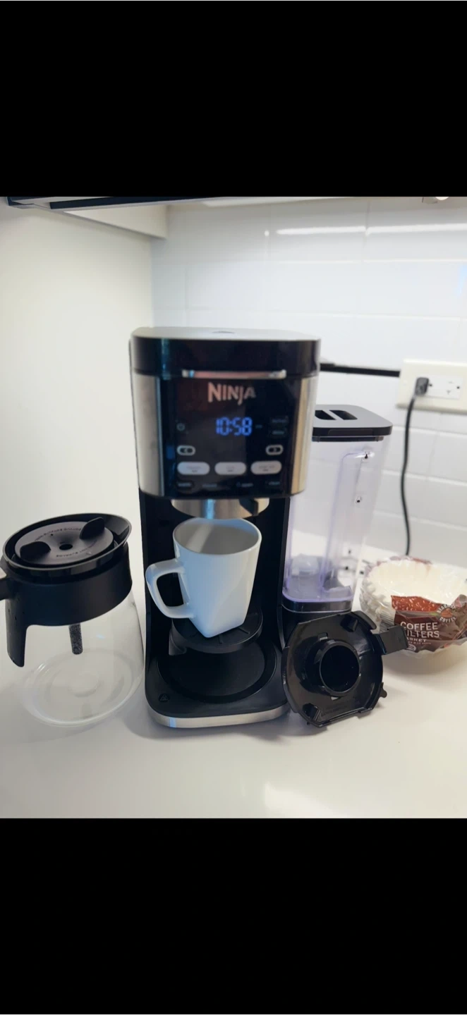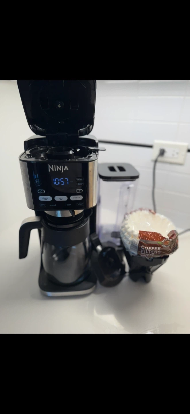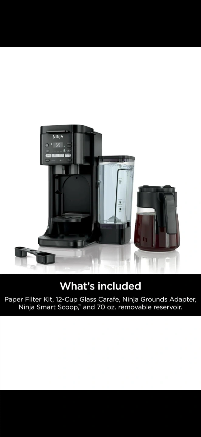Selling a Ninja Coffee Maker in great condition. Makes delicious coffee with multiple brew styles for any mood. ✅ 4 Brew Styles: Classic, Rich, Over Ice, Cold Brew ✅ Brew grounds or pods (flexible system) ✅ 9 brew sizes + 4 pod sizes (single cup to full carafe) ✅ 70 oz. removable water reservoir for easy filling ✅ Keep-warm function (up to 4 hours) ✅ Includes glass carafe, Ninja Grounds Adapter, paper filter kit, and scoop