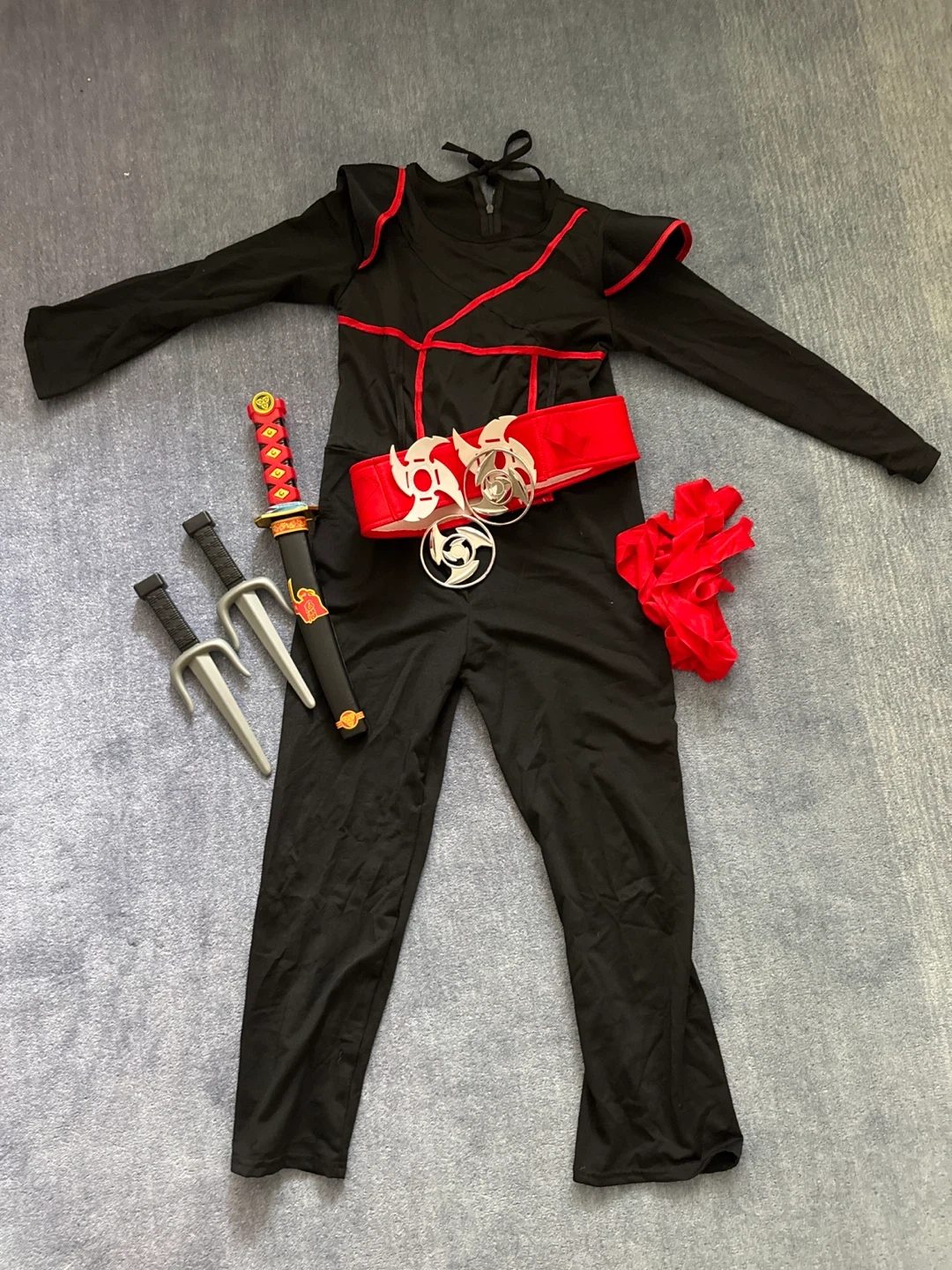 118Selling a ninja costume that includes the full outfit, a sword, and sai daggers! It's perfect for dress-up or Halloween. Not sure the size. Maybe 8-10 years. Worn once.