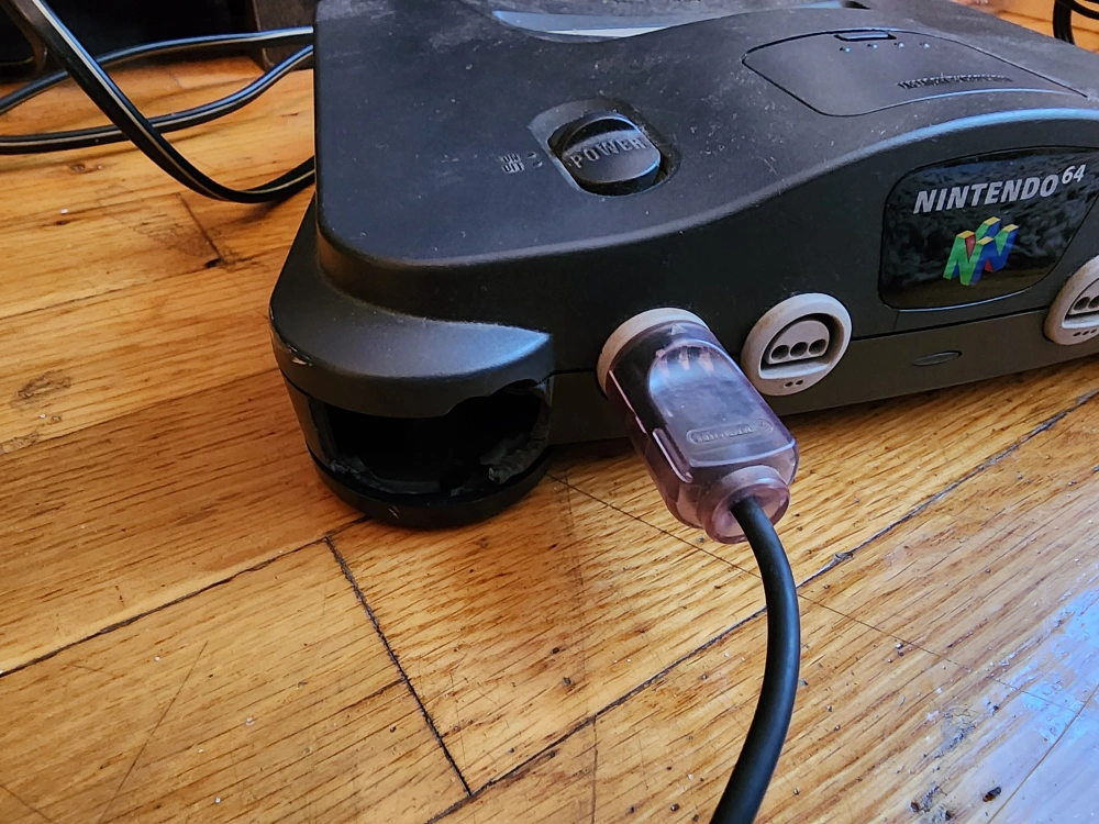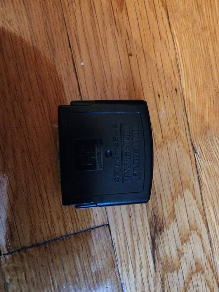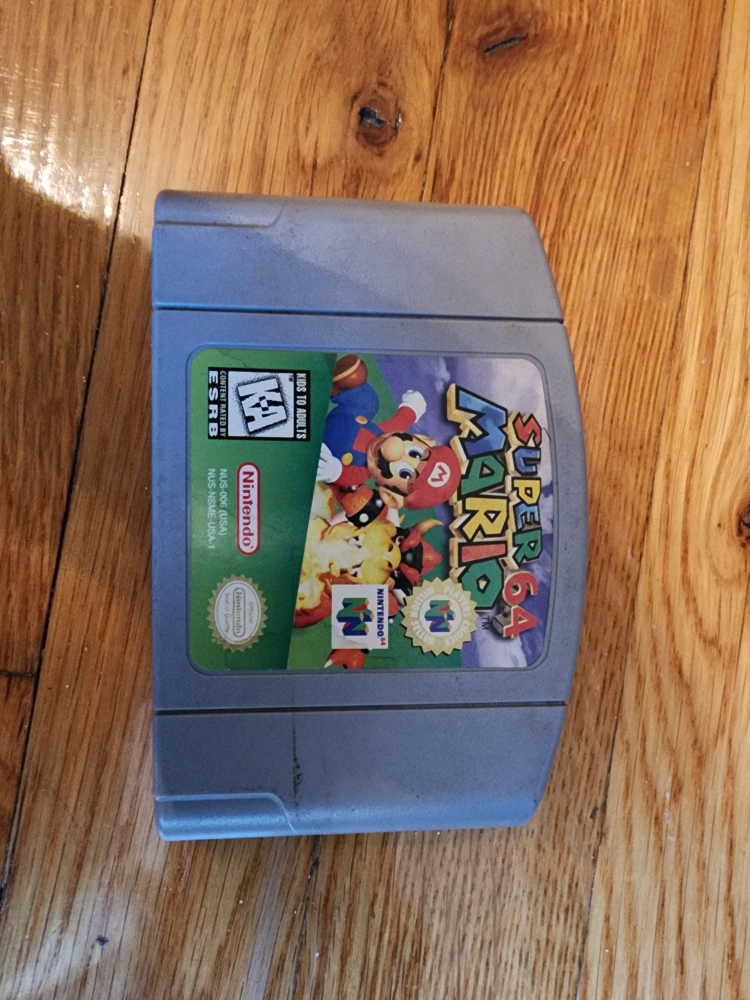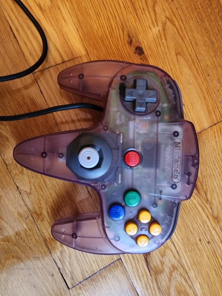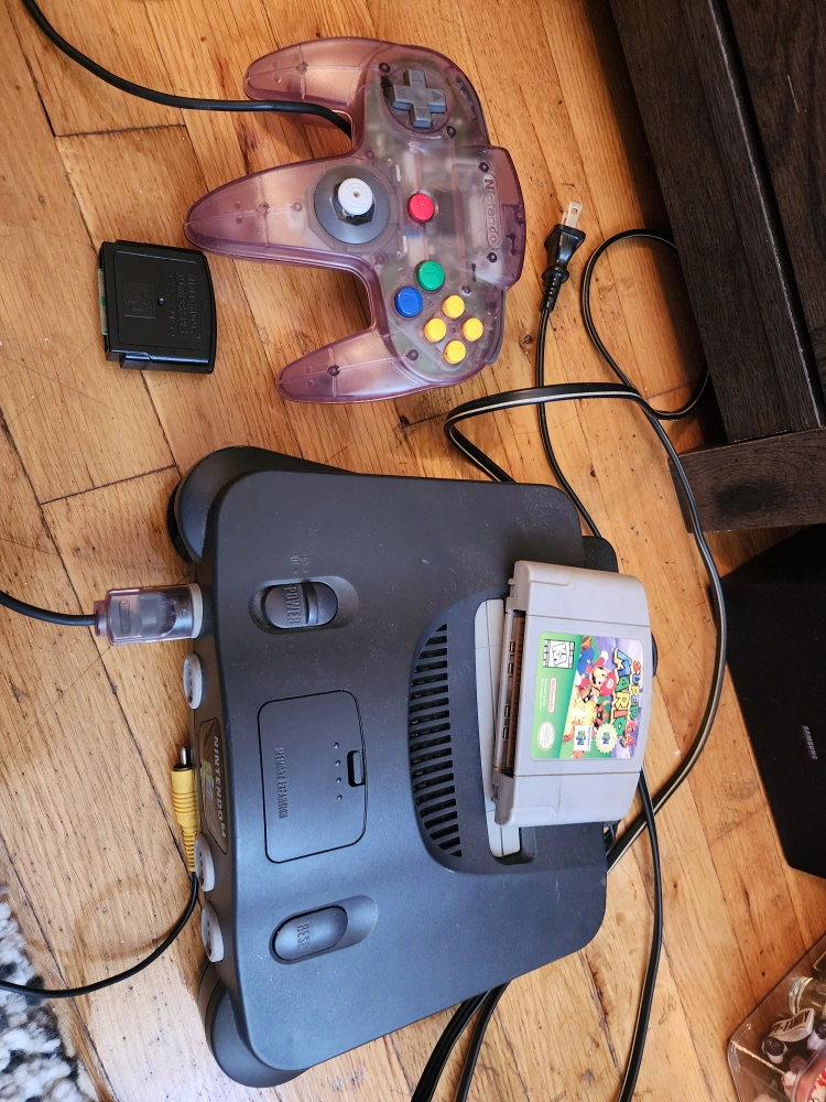 Selling a used Nintendo 64 console with a purple see-through controller, jumper pack, and the game Super Mario 64. Front left corner of the frame has a small chunk broken off. No idea if the console works.