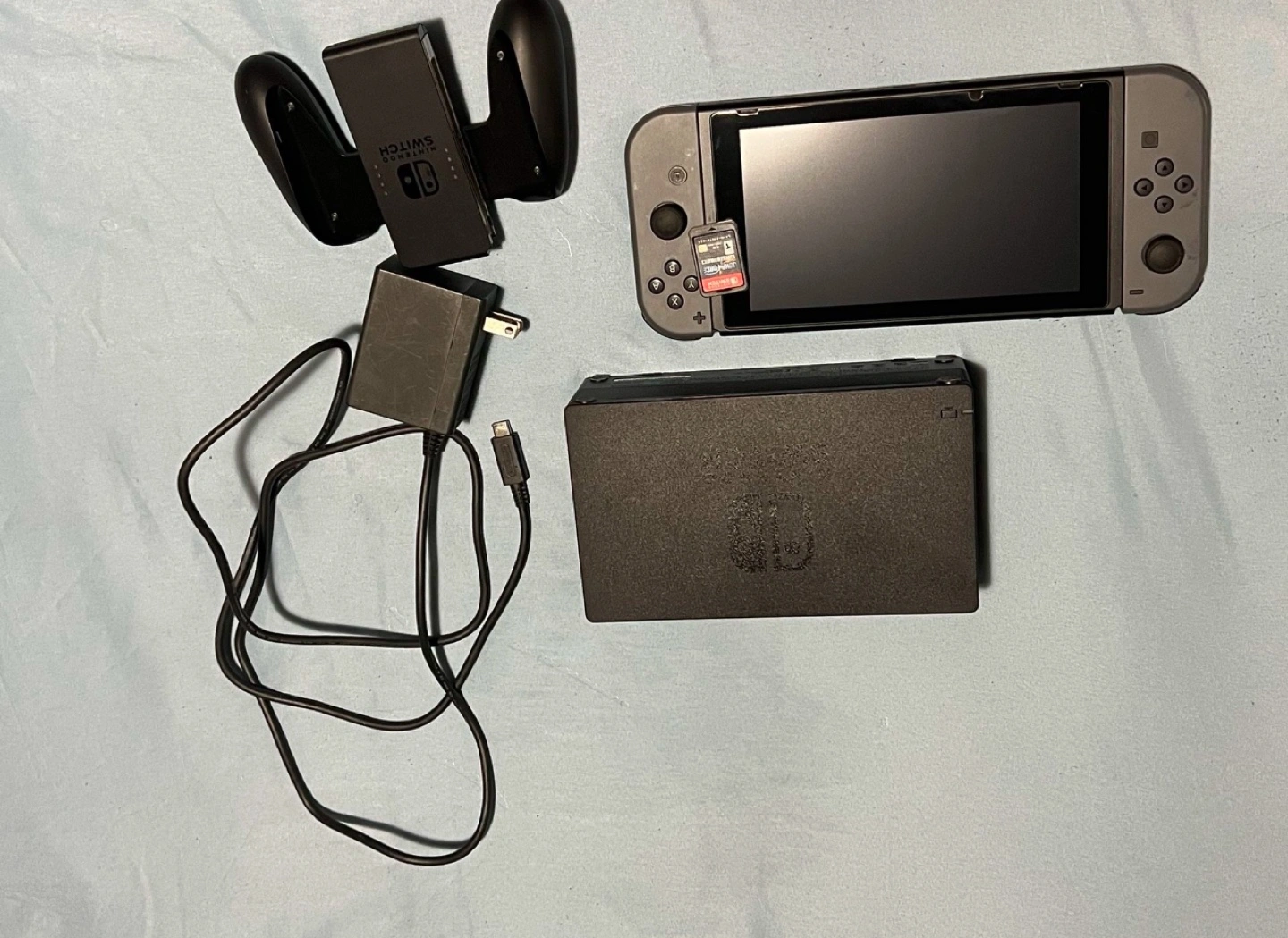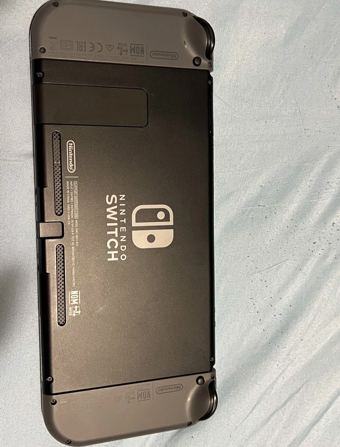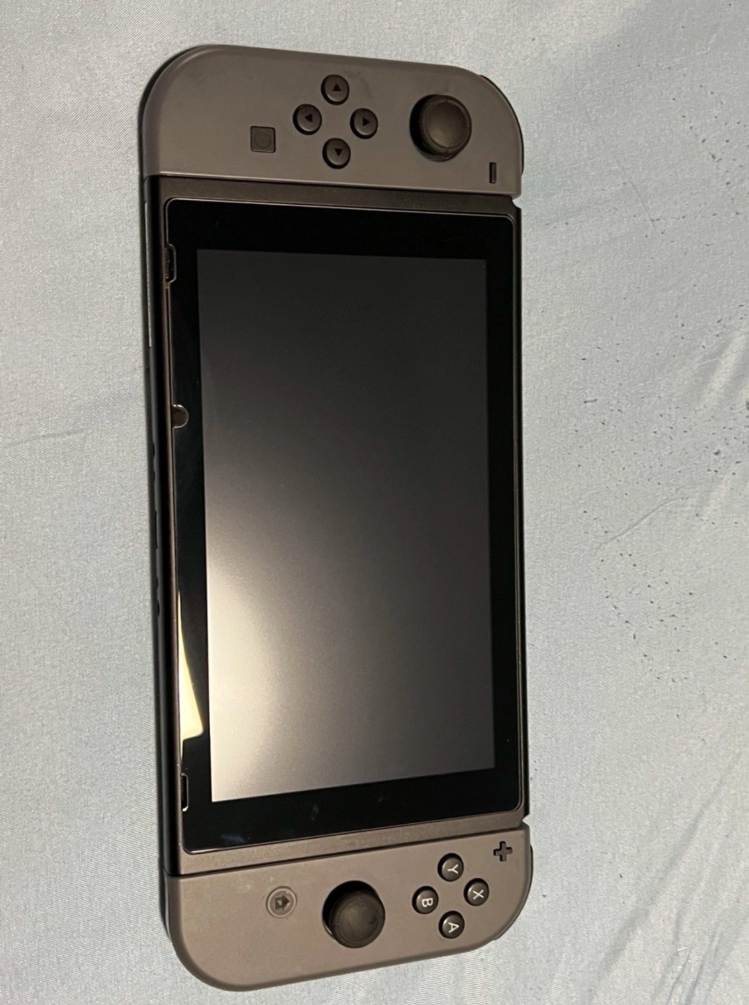 Nintendo Switch console, gray color. Includes console, dock, AC adapter, and Joy-Con grip. Screen protector installed. Used condition.