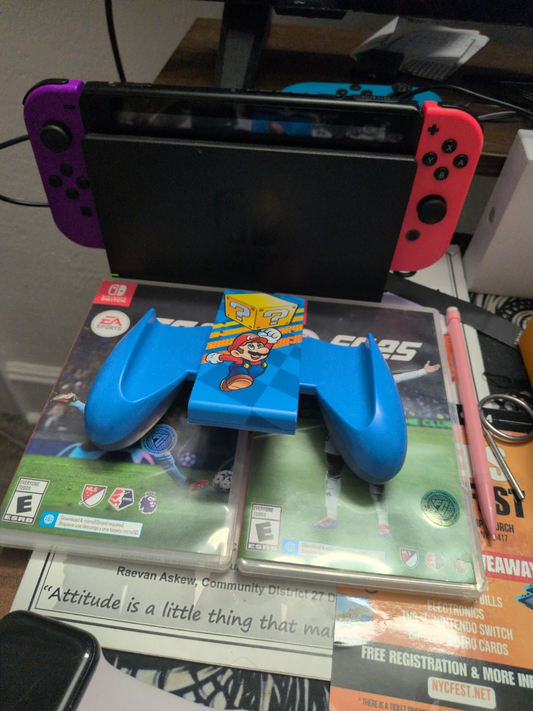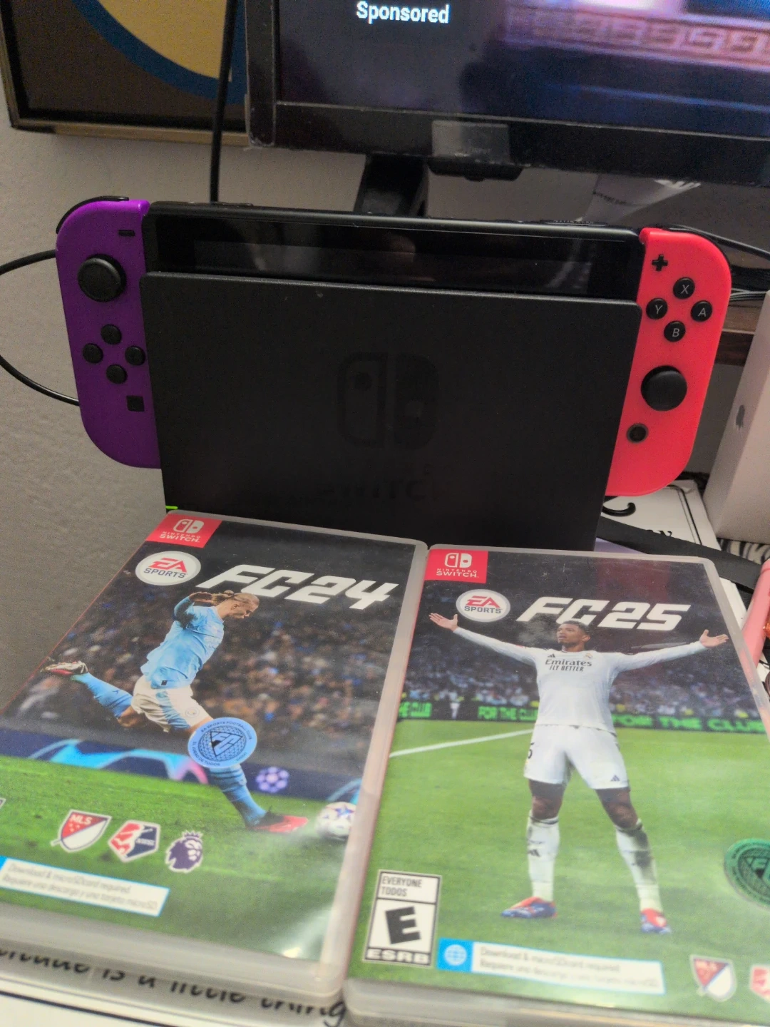 10Selling a Nintendo Switch console along with the games FC 24 and FC 25! It's in great condition and ready for a new home. Perfect for gaming on the go or at home With that extra controller piece and another New Joy-Con