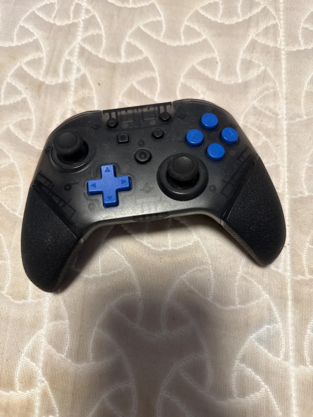 20Selling a used Nintendo Switch controller. It's black with blue accents. It's in good condition and ready for a new home!