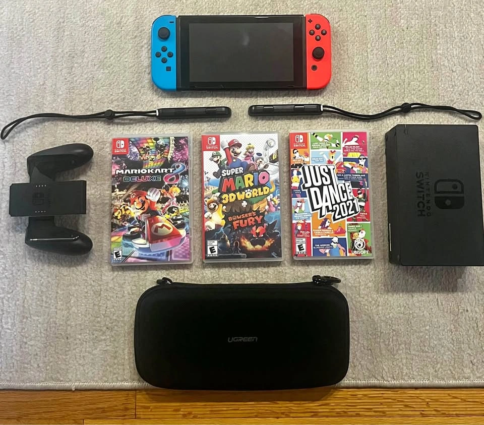 In great condition. Barely used, like new. Battery is still great and holds a charge for a long time. No scratches. Screen protector since day one and always protected in carrying case. Bundle comes with 3 games: Mario Kart 8, Super Mario 3D World + Bowser’s Fury and Just Dance. Also comes with everything original plus authentic controller dock and carry case with pockets for games.