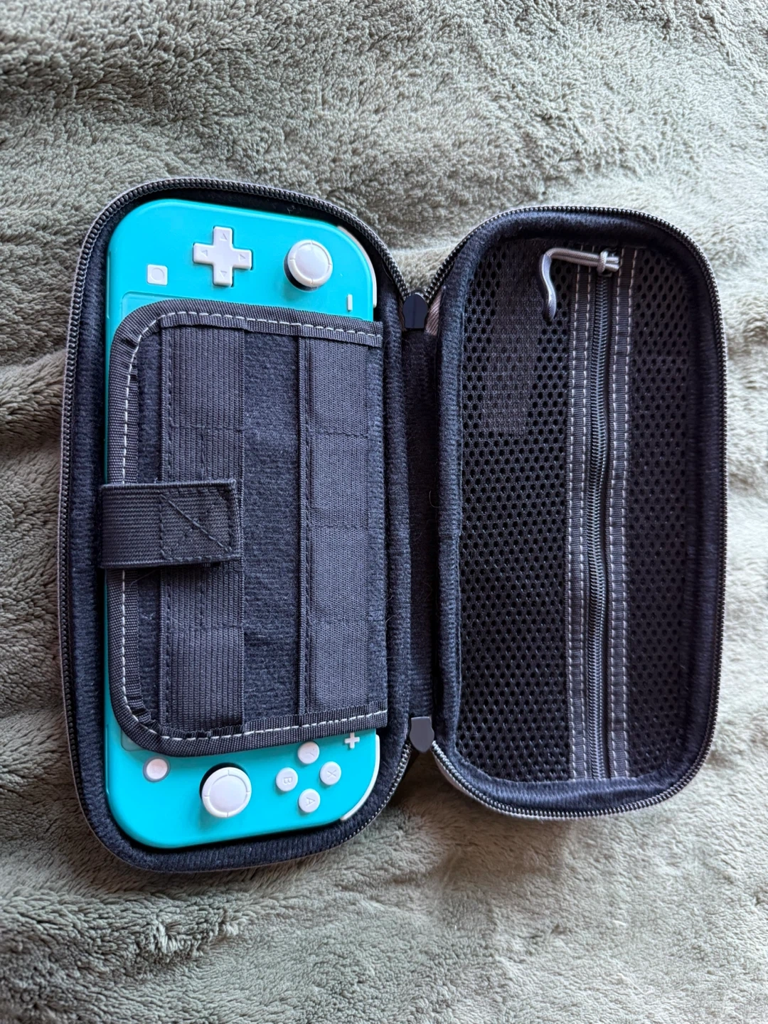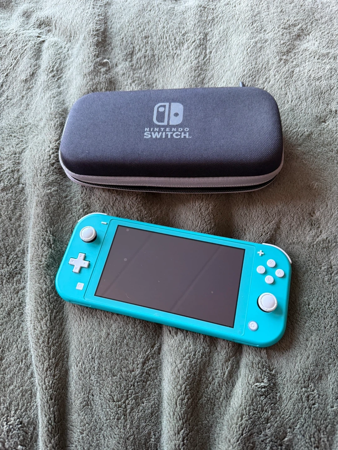 Selling a turquoise Nintendo Switch Lite with a carrying case! It's in great condition and ready for a new home. Perfect for gaming on the go. Also includes a screen protector and a 128gb sd card