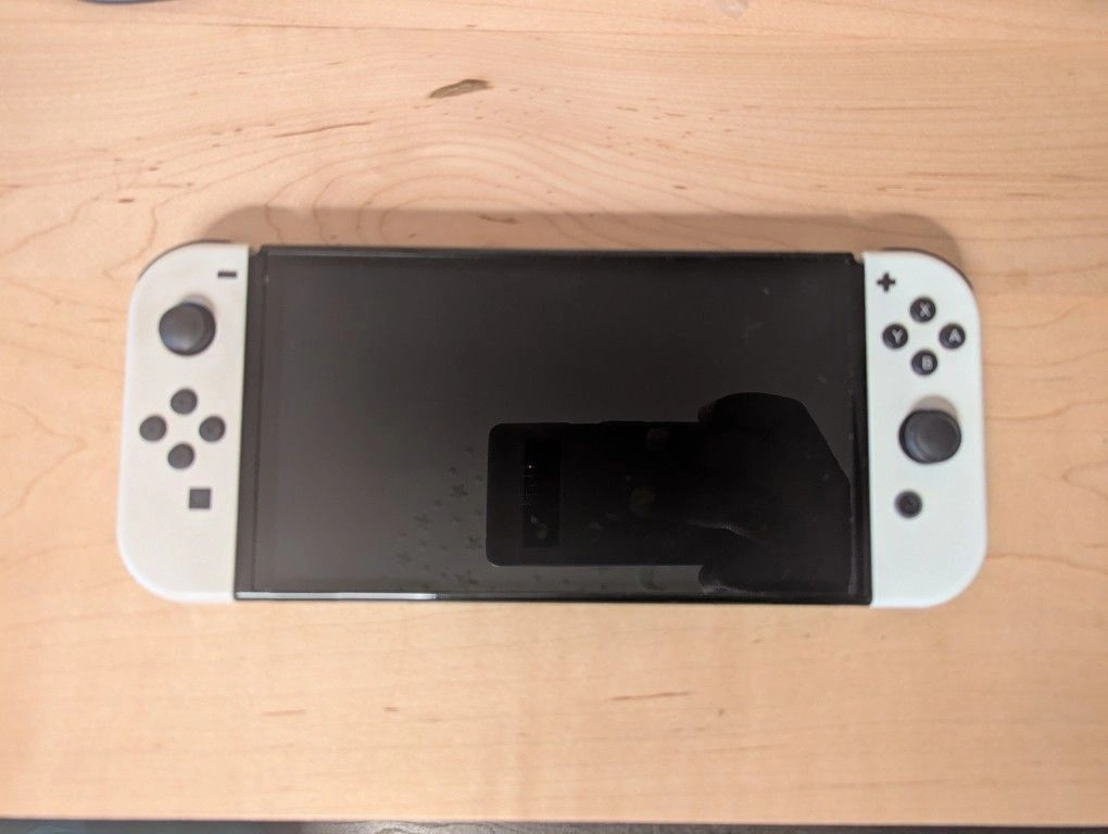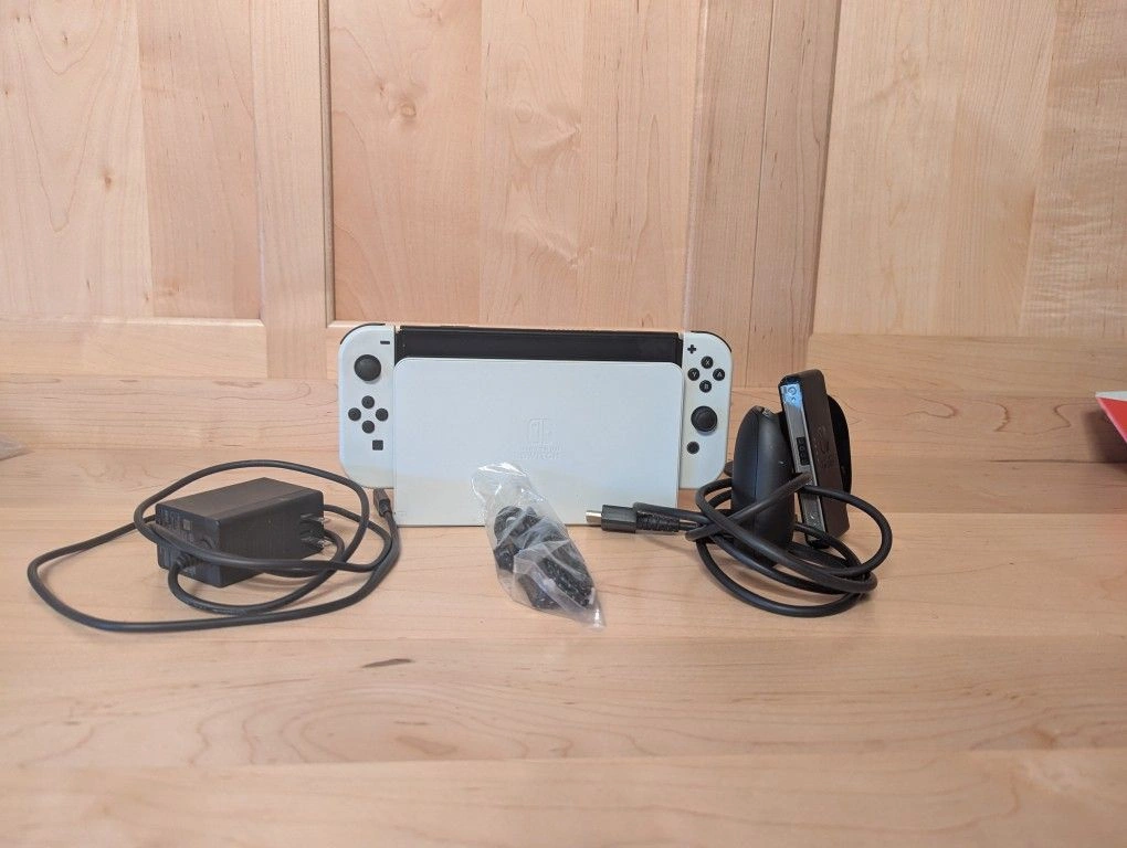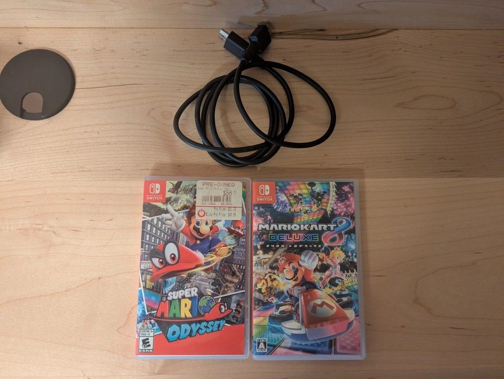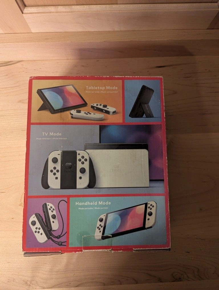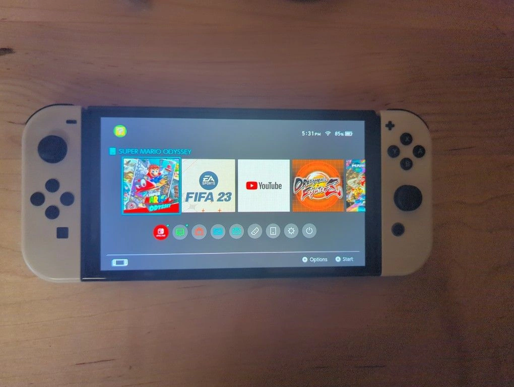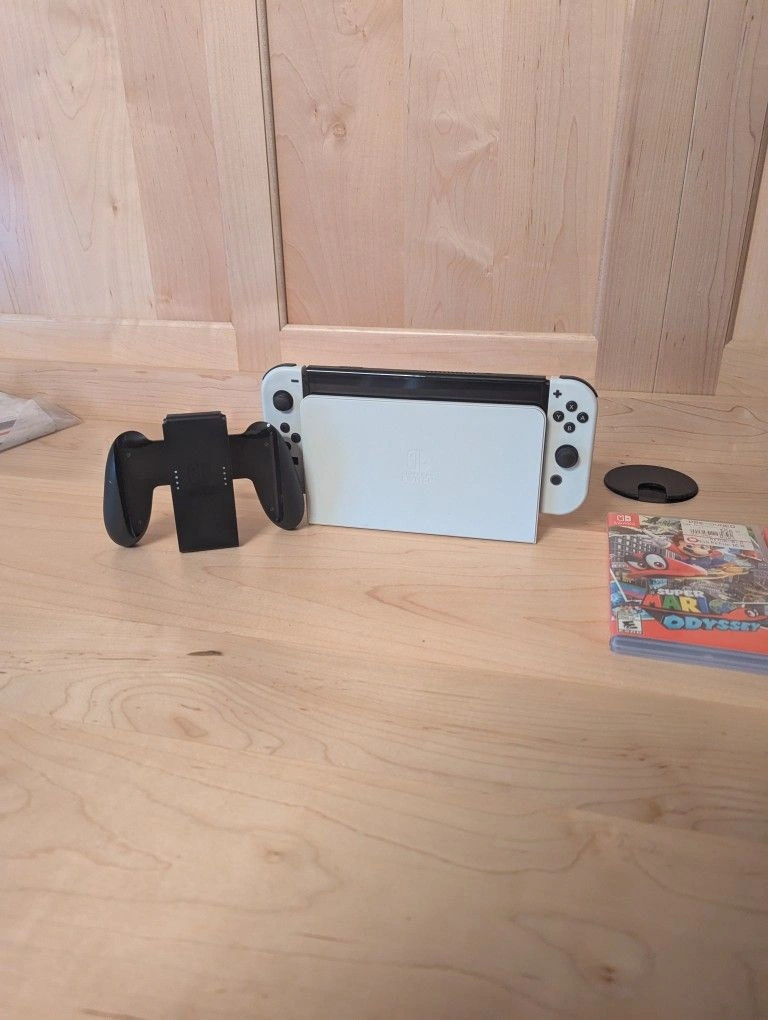Lightly used Nintendo Switch in good condition. Original packaging with two physical games (Super Mario Odyssey and Mario Kart 8 Deluxe) and two digital games (FIFA 23 and Dragon Ball FighterZ). Accessories also included.