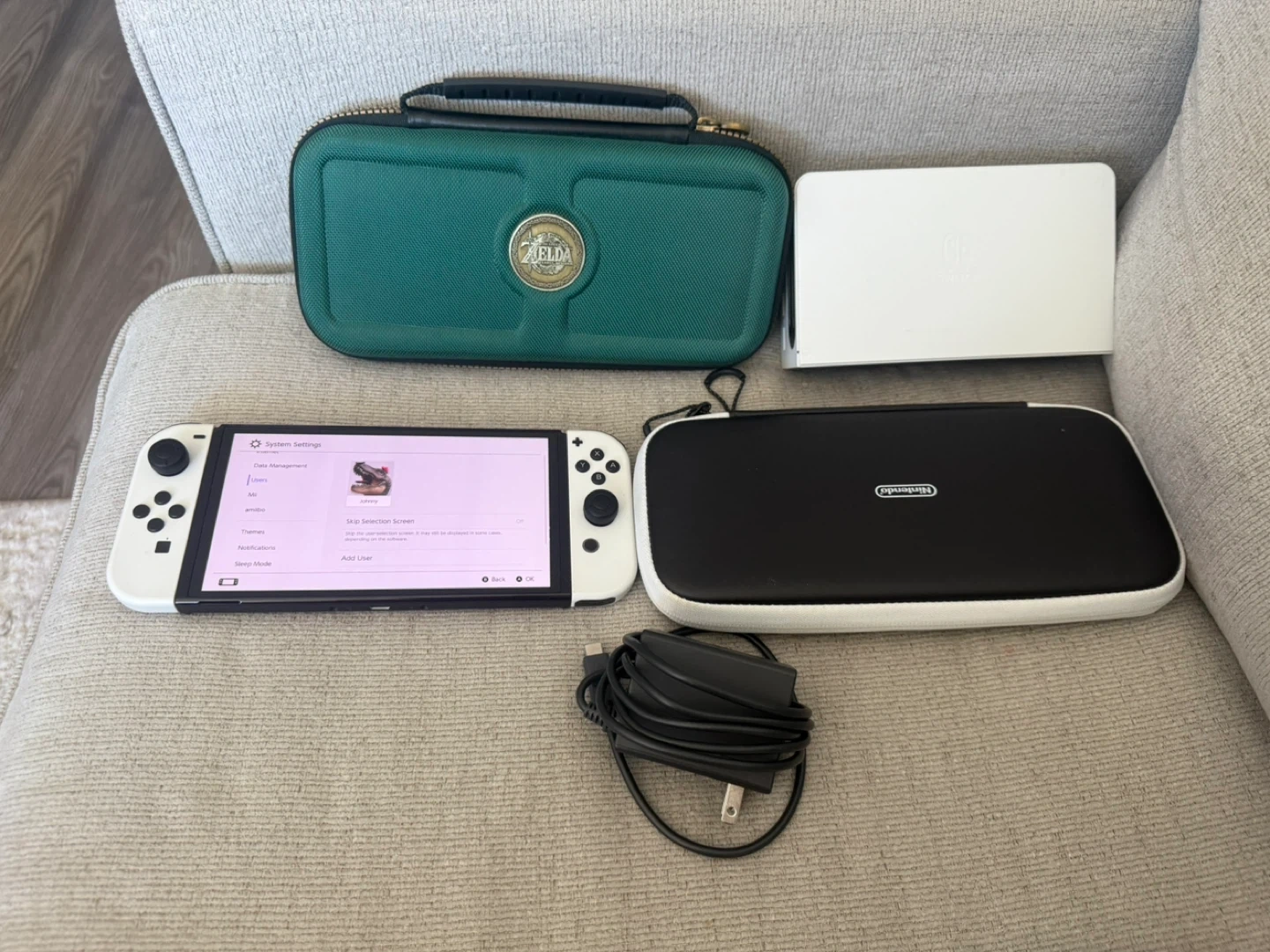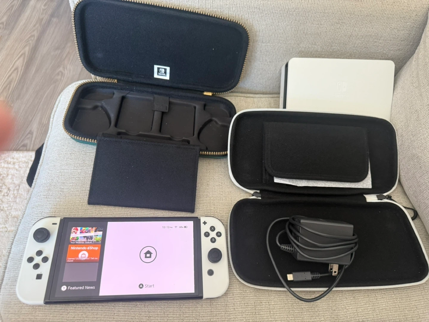 Selling a Nintendo Switch OLED in white, complete with all the accessories you see in the photos! It comes with two carrying cases, the dock, and the charger. Also included is a 256GB Samsung EVO Select MicroSD card for extra storage. Ready for a new home!