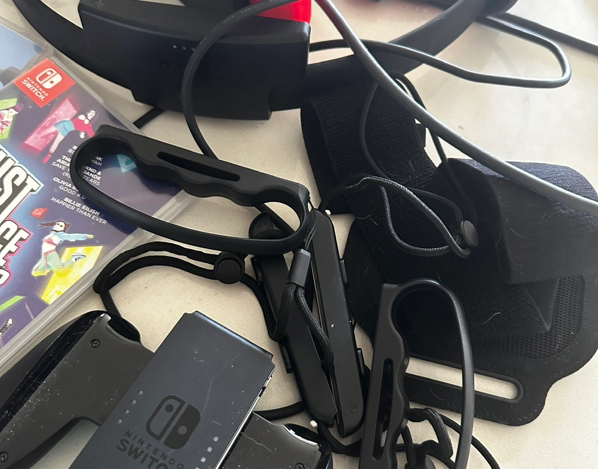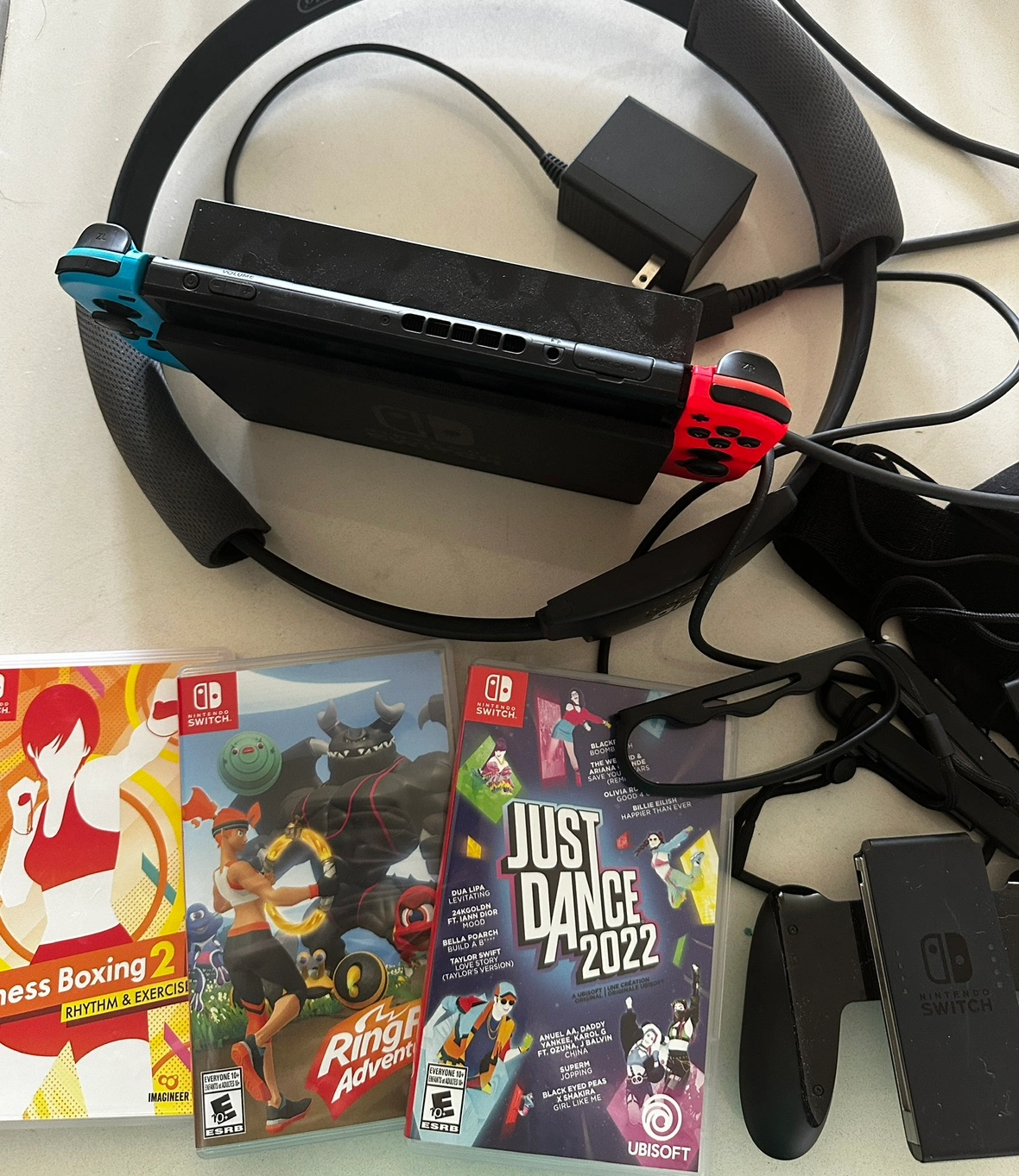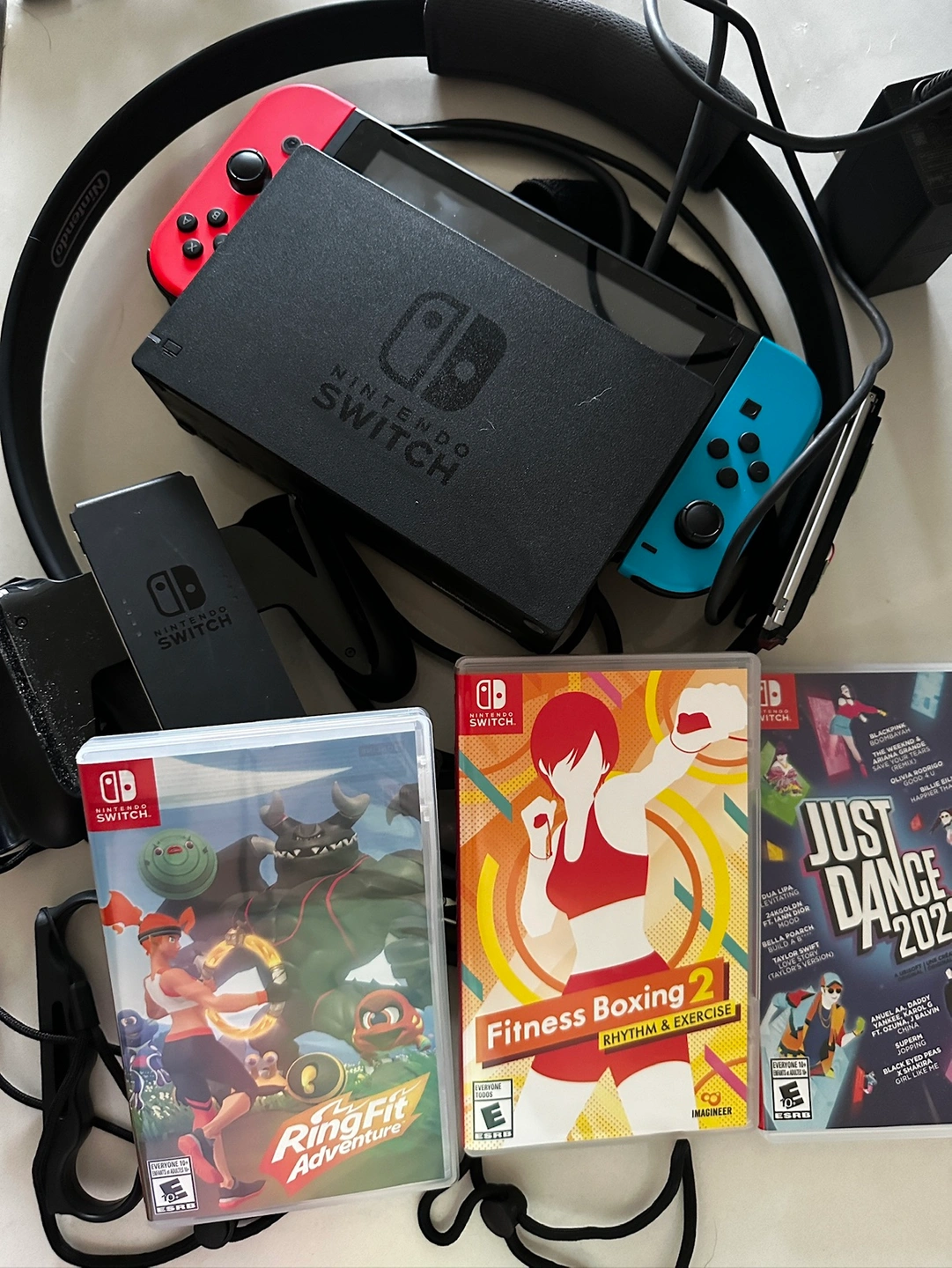 26This listing includes a Nintendo Switch Console, a Ring Fit Adventure Game, a Fitness Boxing 2 Game, and a Just Dance Game. The Switch was barely used. All my prices are negotiable. I’m moving and need to get rid of a lot of stuff.