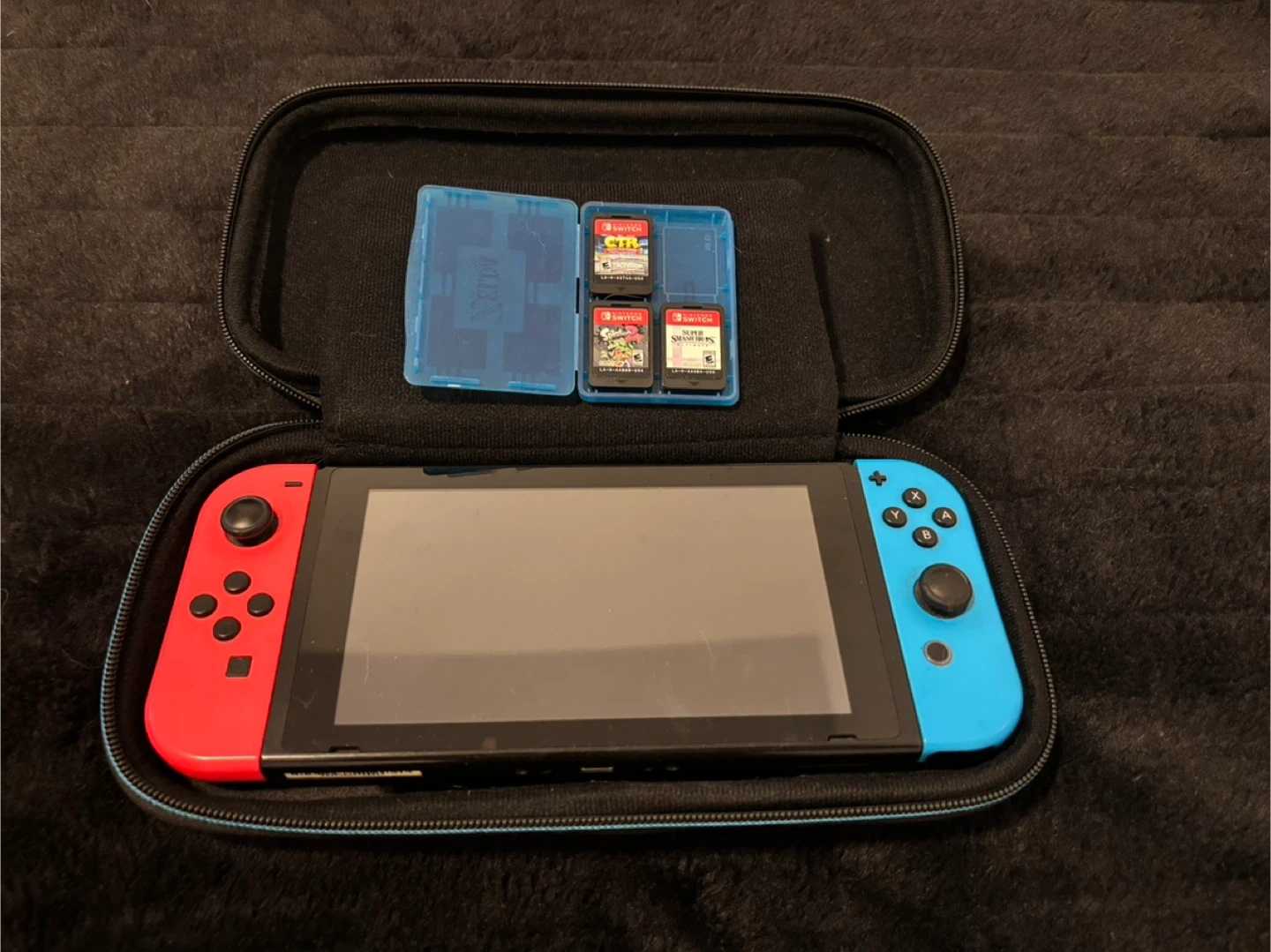 Selling a Nintendo Switch with red and blue joycons. It comes with a Zelda: Breath of the Wild carrying case, charger, and a game cartridge holder with a few games!