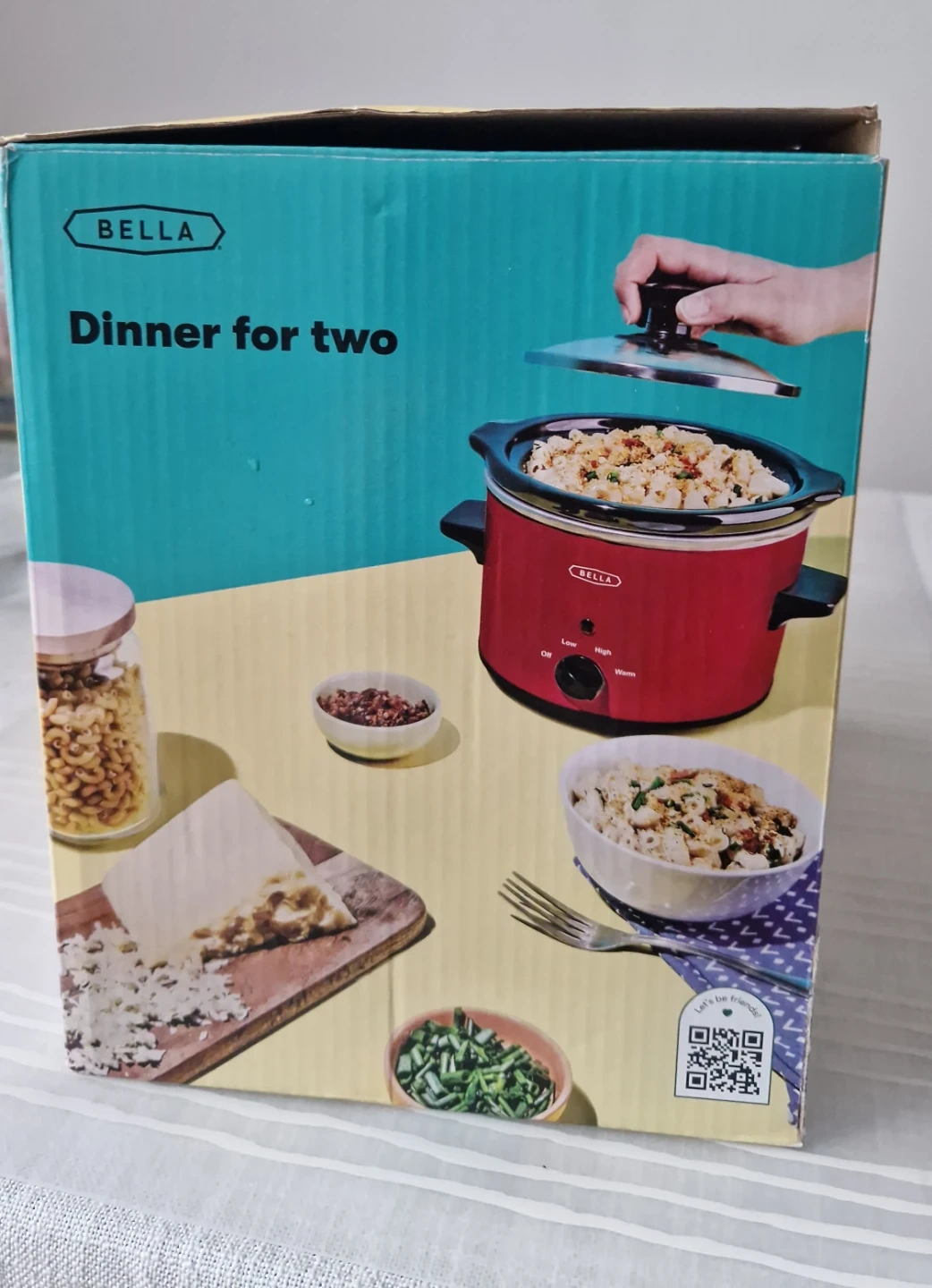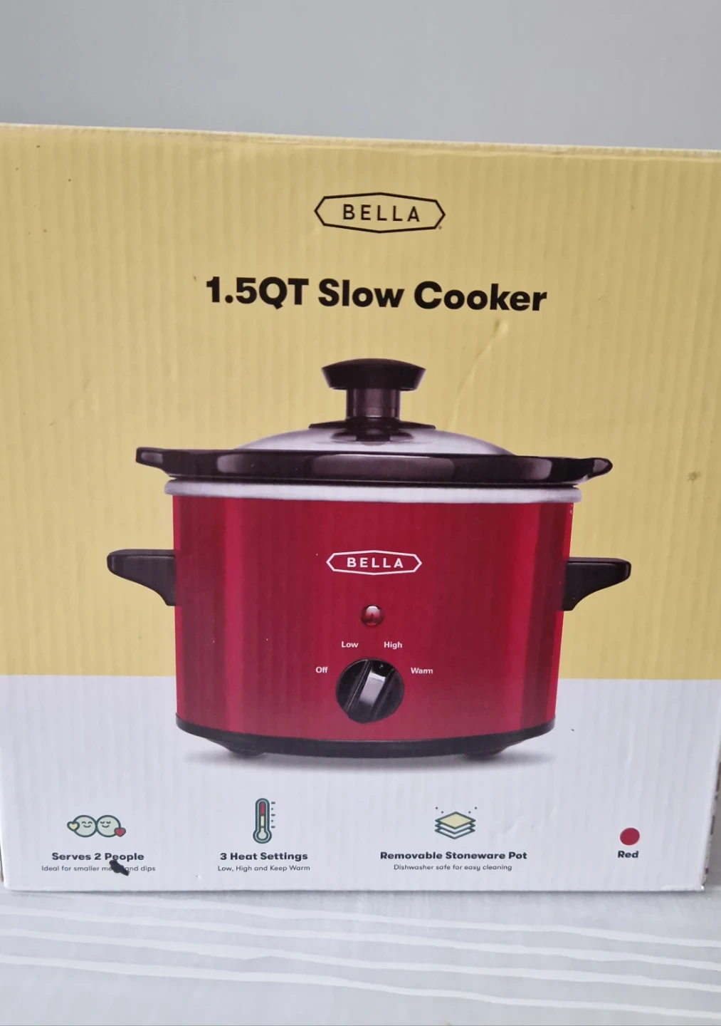 This is a BELLA 1.5QT slow cooker in red. It features a tempered glass lid with cool touch knob and a removable stoneware pot that's dishwasher safe. It has 3 heat settings: Low, High, and Keep Warm. Serves up to 2 people.