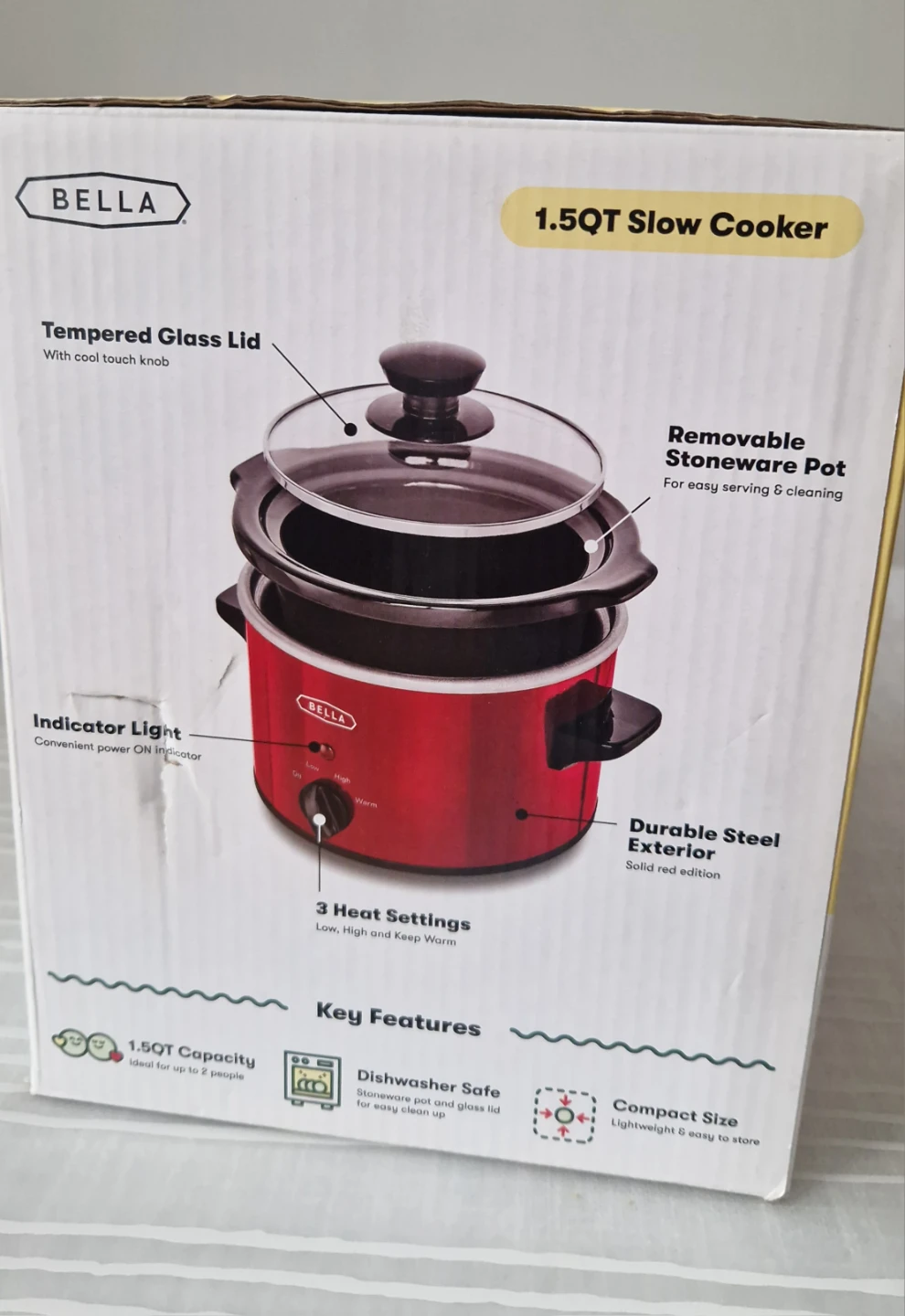 This is a BELLA 1.5QT slow cooker in red. It features a tempered glass lid with cool touch knob and a removable stoneware pot that's dishwasher safe. It has 3 heat settings: Low, High, and Keep Warm. Serves up to 2 people.