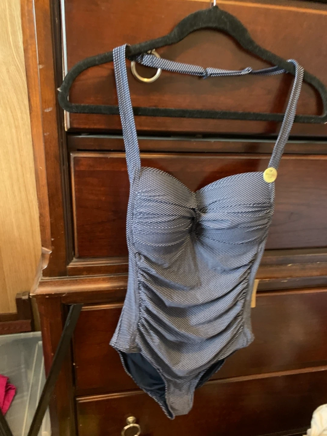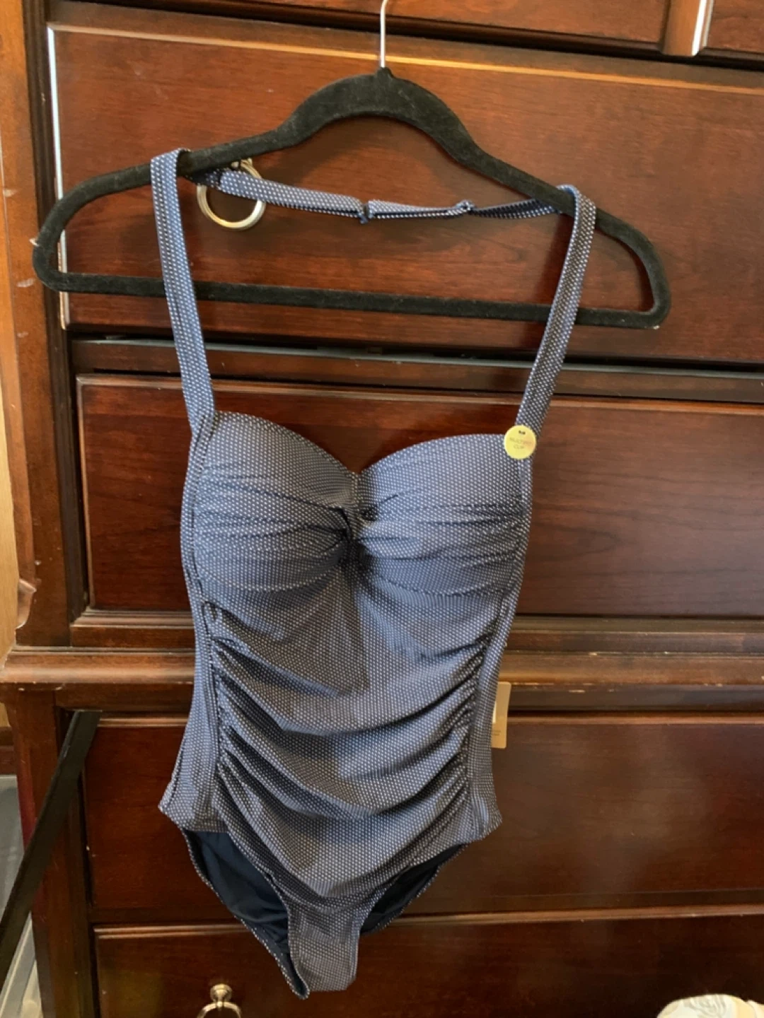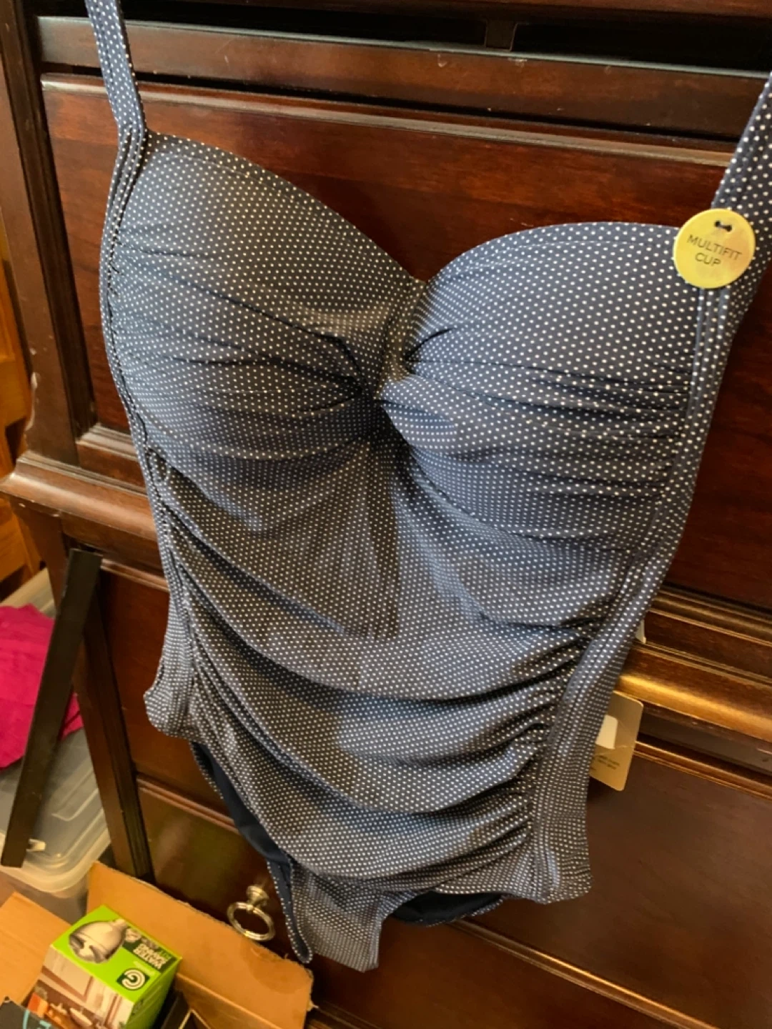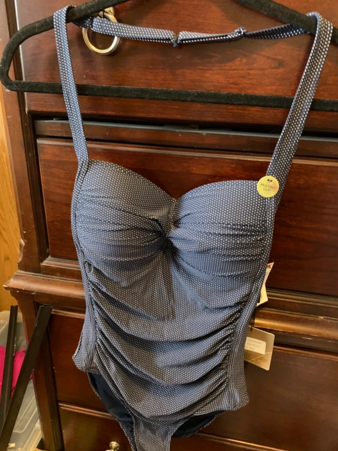 This is a navy blue polka dot swimsuit from Profile by Nip tuck. It has a multi-fit cup and a stylish design, perfect for your next swim! The material is comfortable and flattering.
