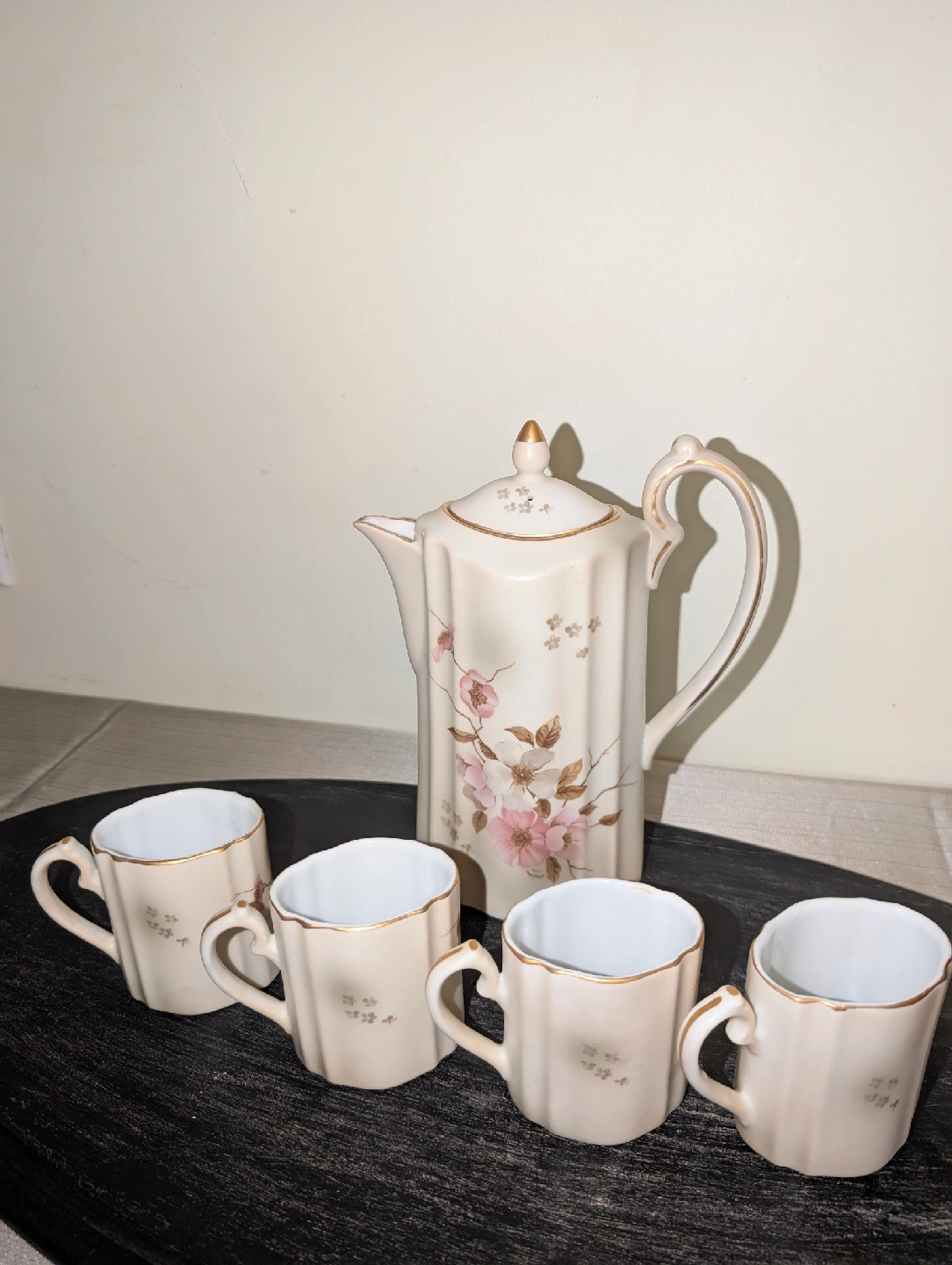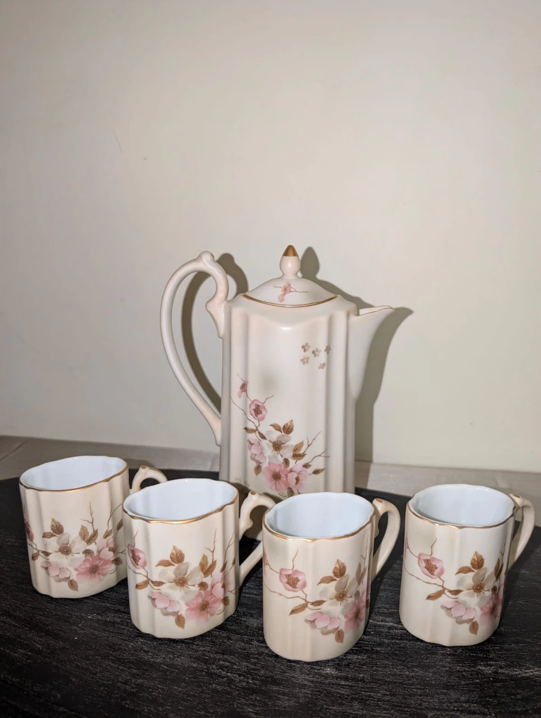 Selling a beautiful vintage chocolate set! It includes a pitcher and four matching mugs, all adorned with a delicate floral pattern. Perfect for adding a touch of elegance to your tea time or as a lovely display piece