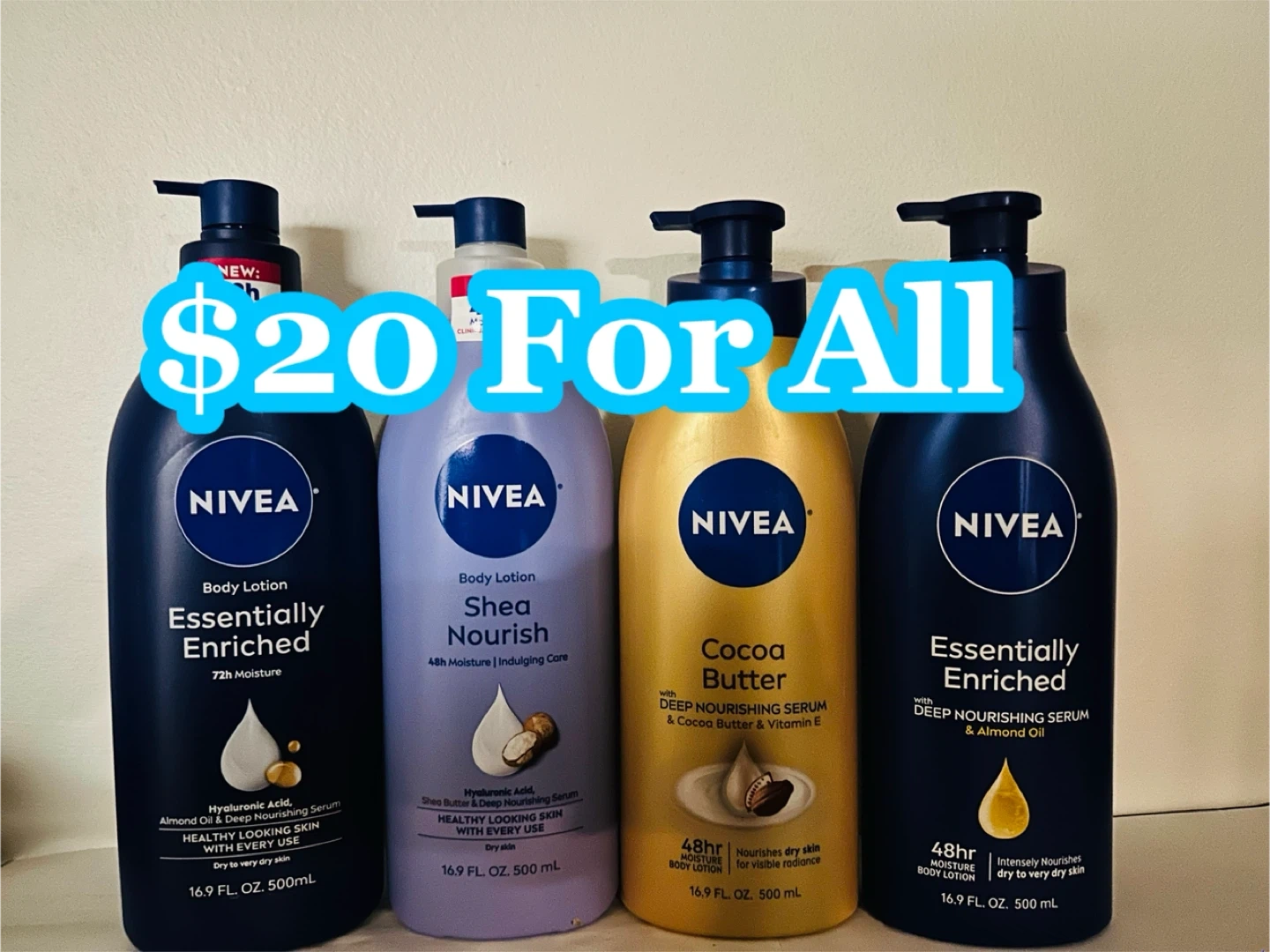 60Selling a set of Nivea body lotions for $20! You'll get: - Essentially Enriched (72h Moisture) - Shea Nourish (48h Moisture) - Cocoa Butter (with Deep Nourishing Serum & Cocoa Butter & Vitamin E) - Essentially Enriched (with Deep Nourishing Serum & Almond Oil) Each bottle contains 16.9 FL OZ (500mL) Solo Hablo español y solo se acepta Efectivo Me Ubico en park City!