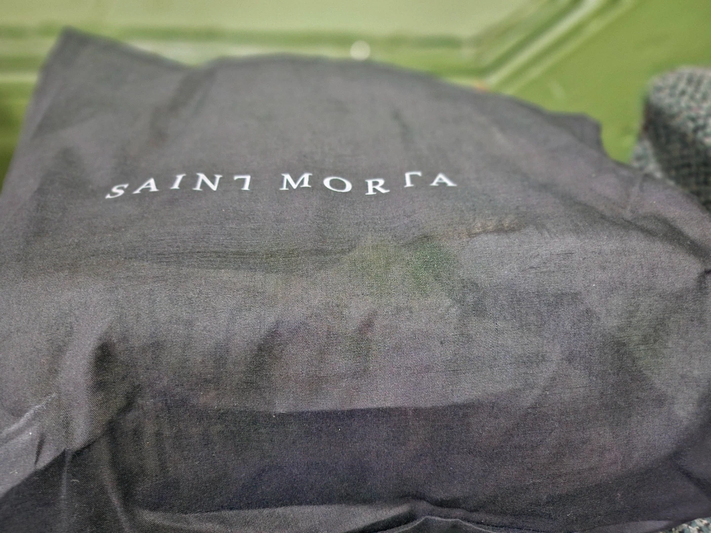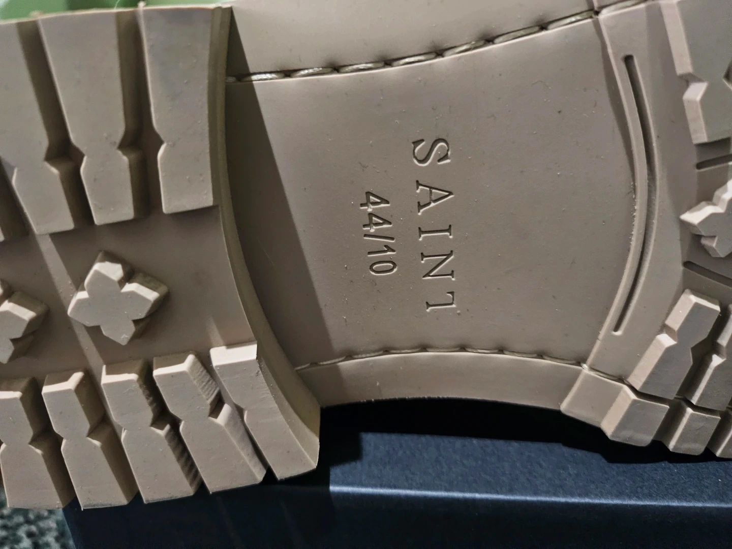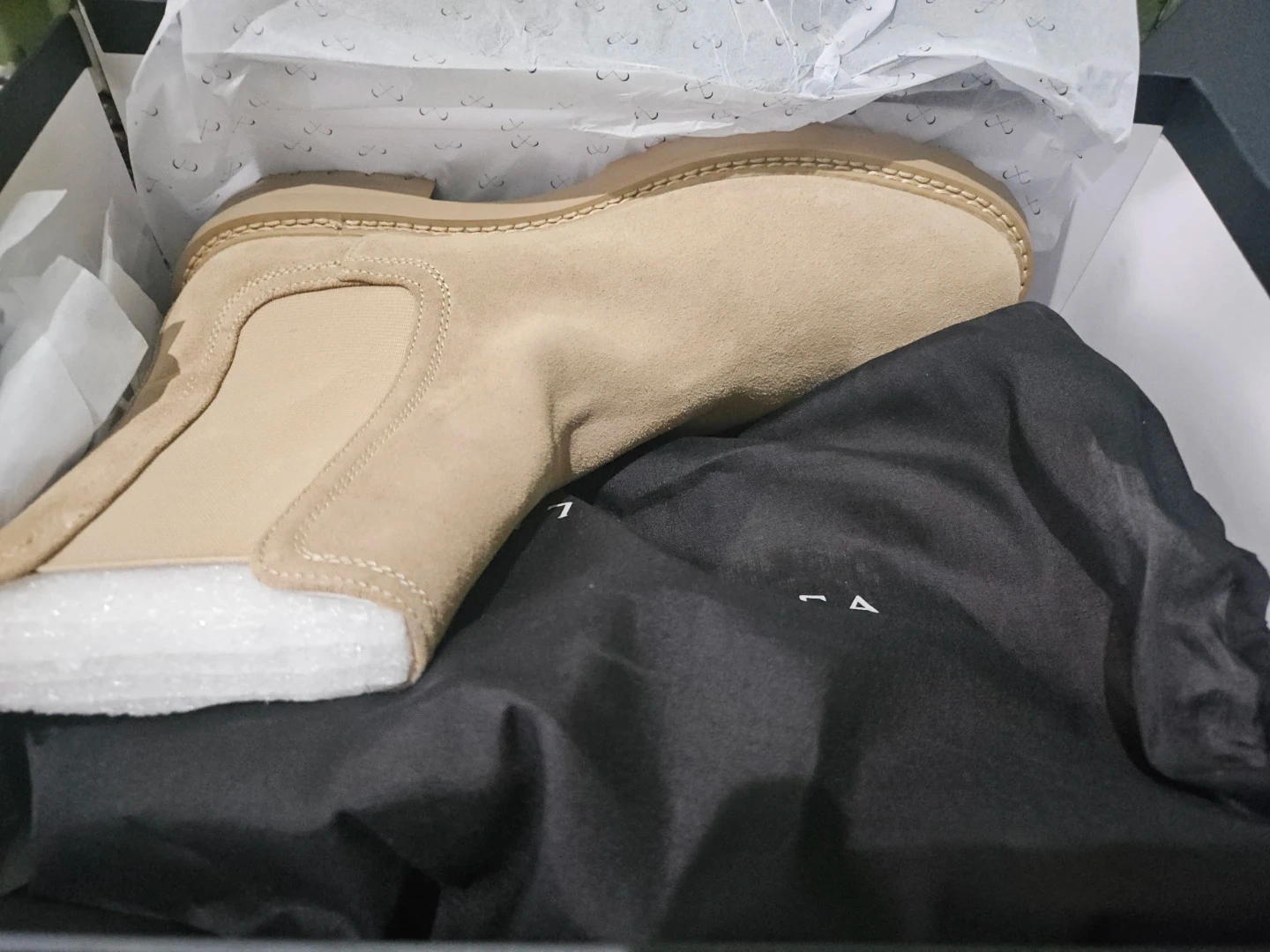 These are tan suede Chelsea boots from Saint Morta. They feature elastic side panels and a lug sole. Comes with a dust bag and original box.