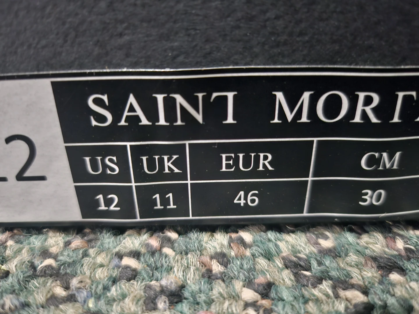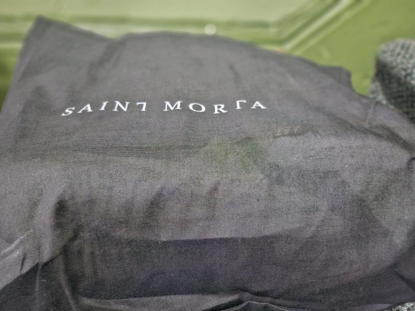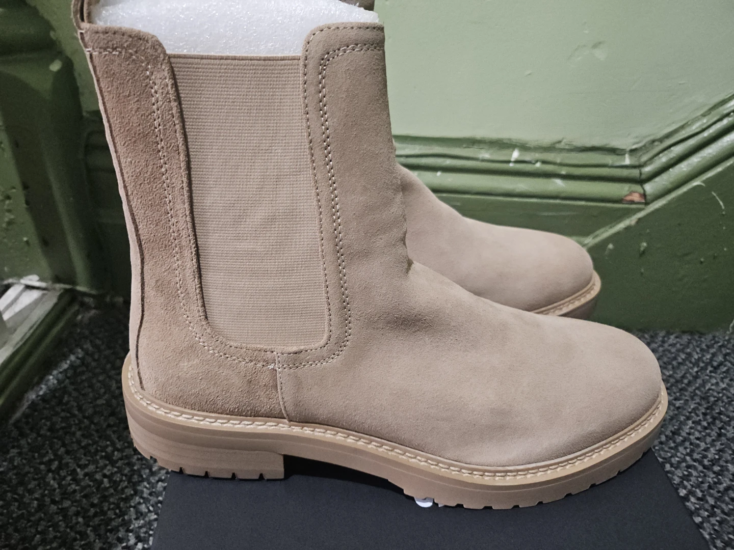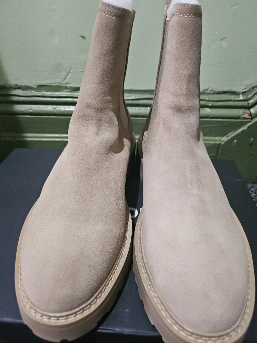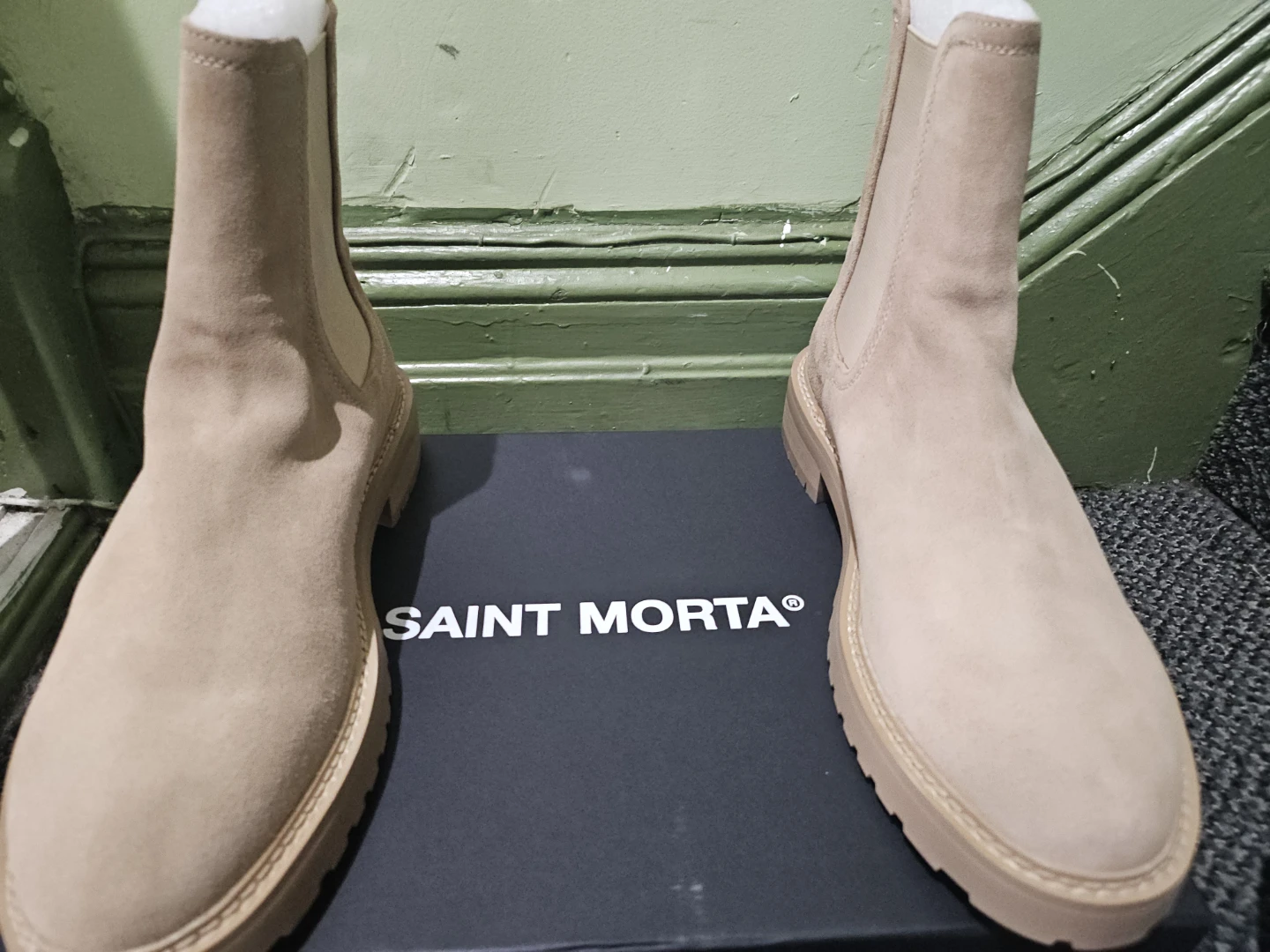 These are tan suede Chelsea boots from Saint Morta. They feature elastic side panels and a lug sole. Comes with a dust bag and original box.