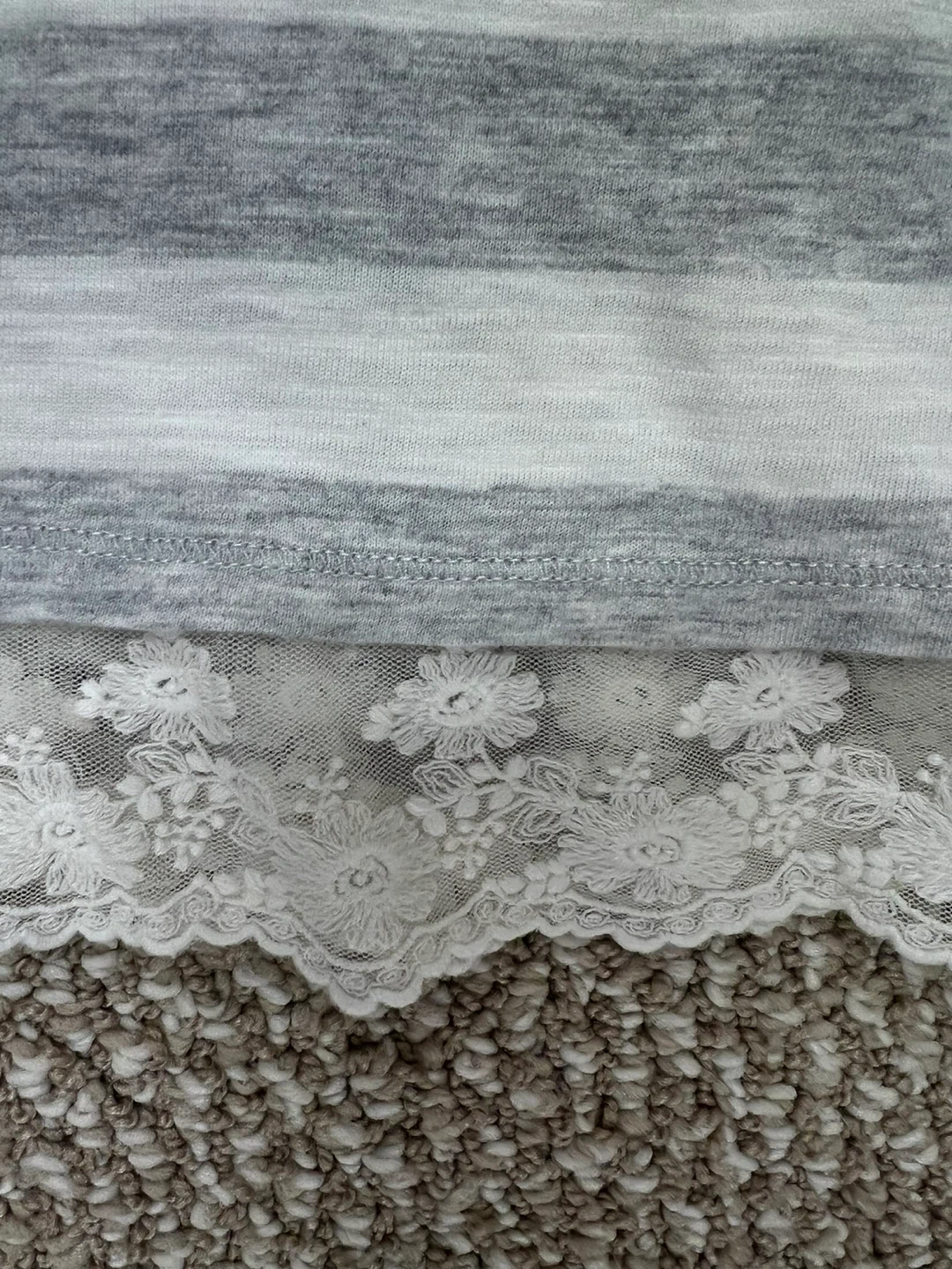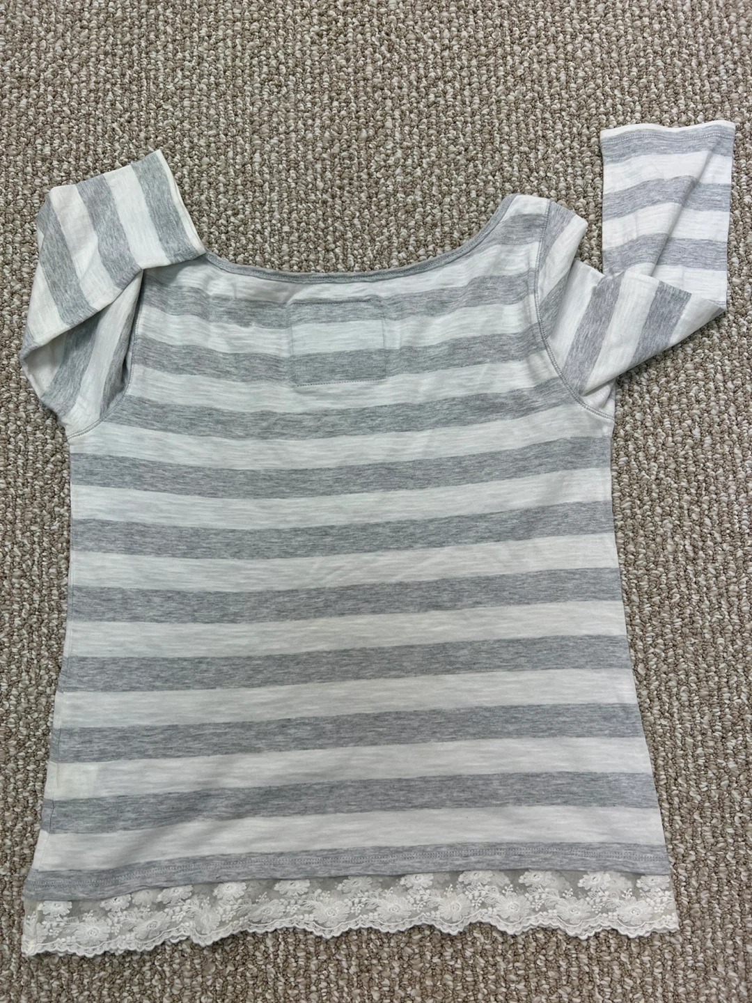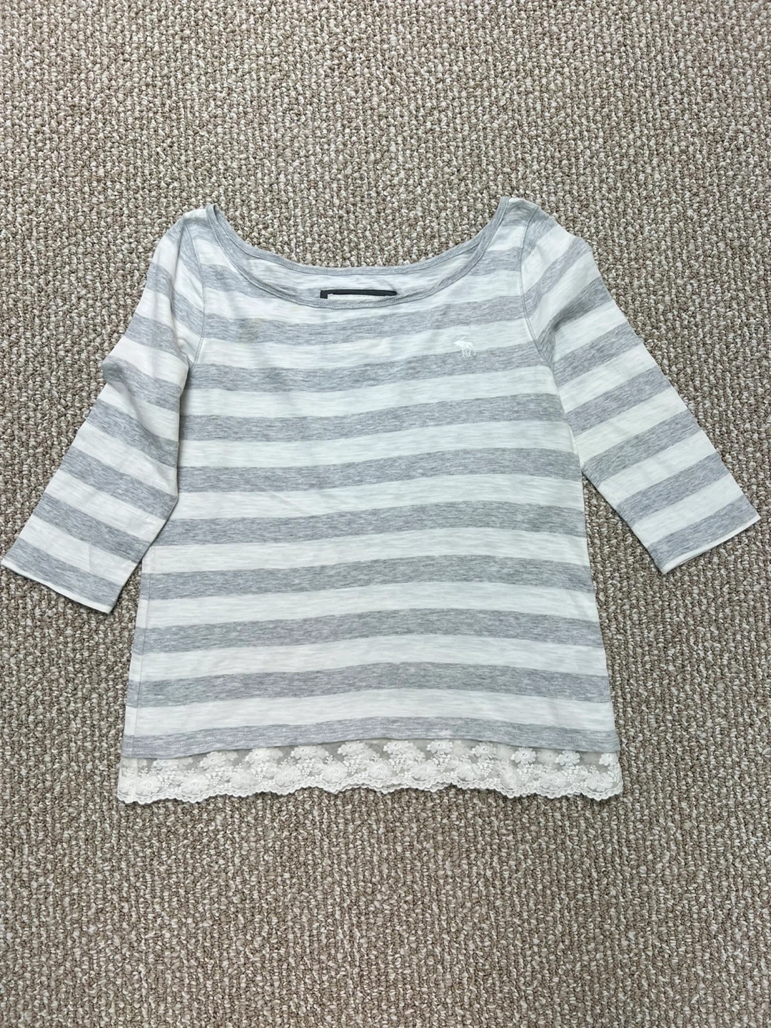 Abercrombie & Fitch women's top. Gray and white stripes with white lace trim at the hem. Size L with quarter sleeves. Made in Vietnam. Comfortable, casual piece.