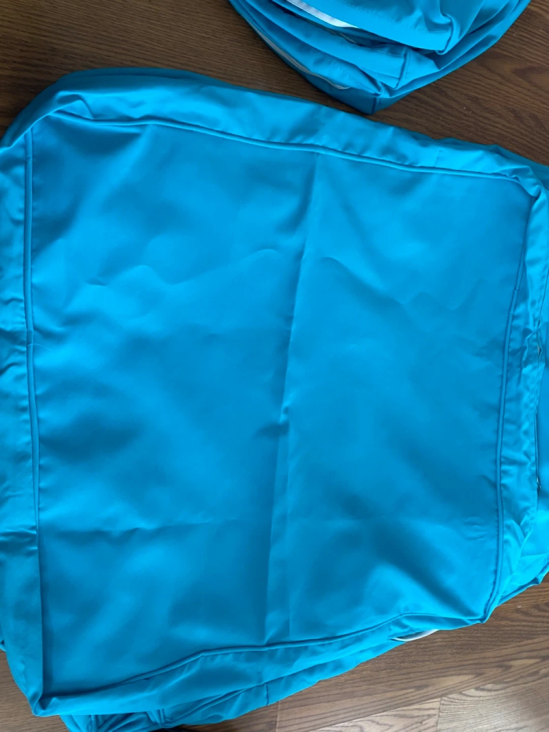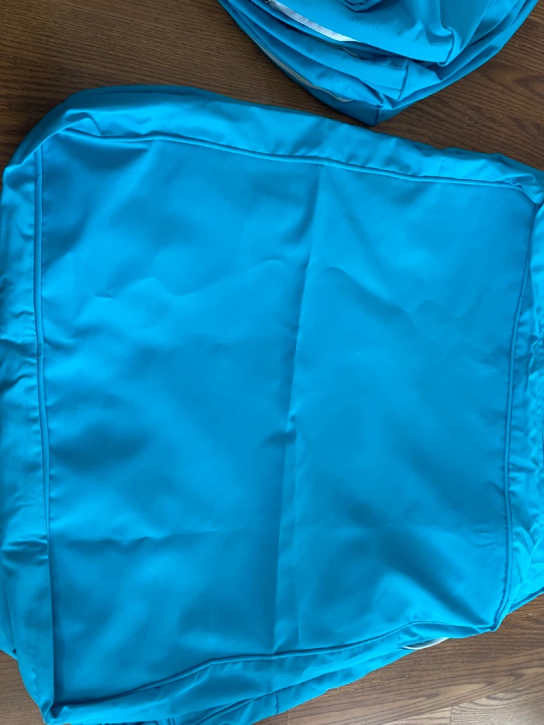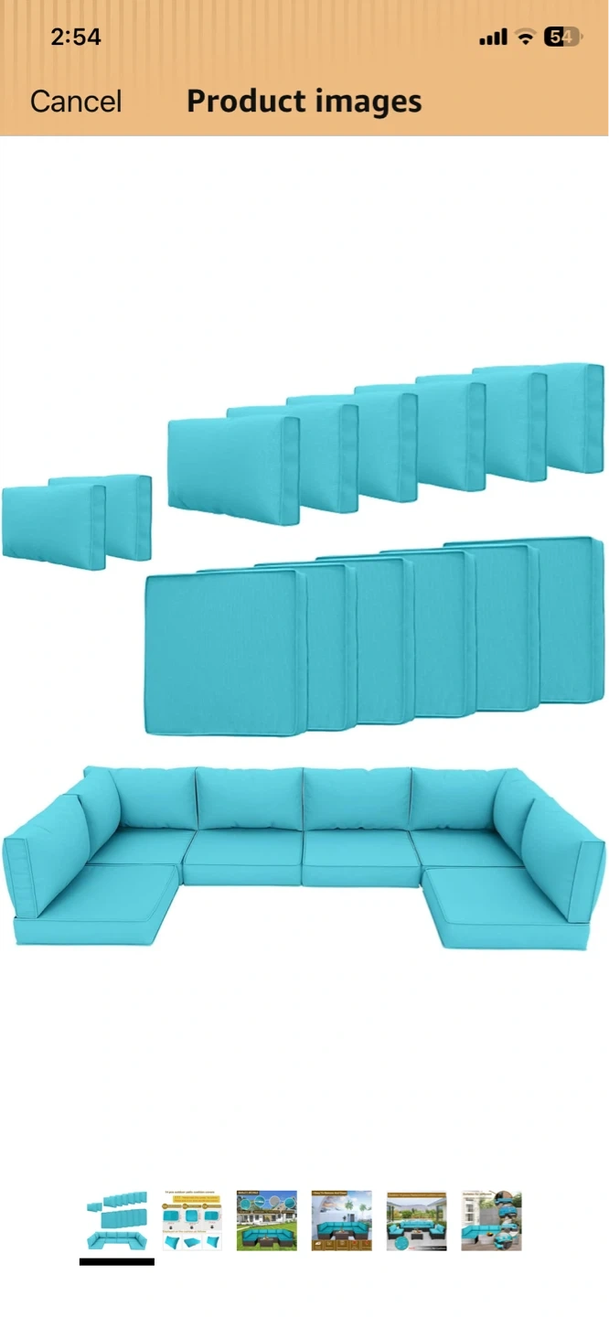 Teal outdoor furniture cushion set for a U-shaped sectional sofa. Includes seat and back cushions. Dimensions of seat cushions are approximately 25 inches by 25 inches, and back cushions are approximately 25 inches by 16 inches. These cushions are made of durable, water-resistant fabric.