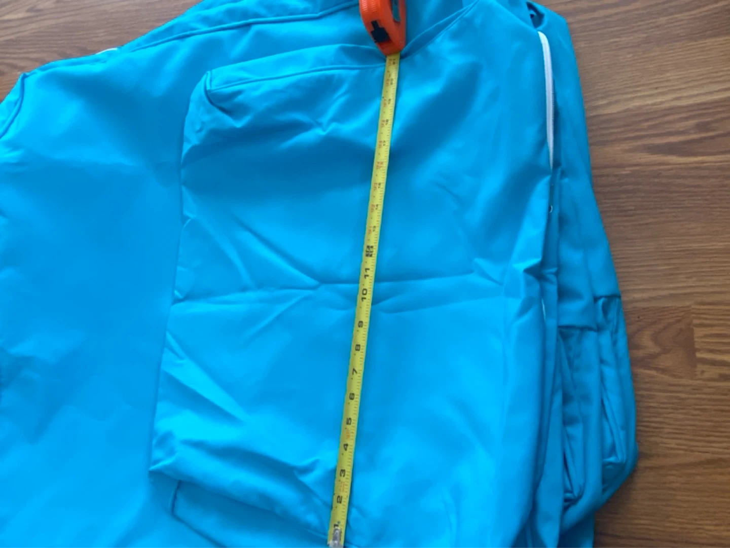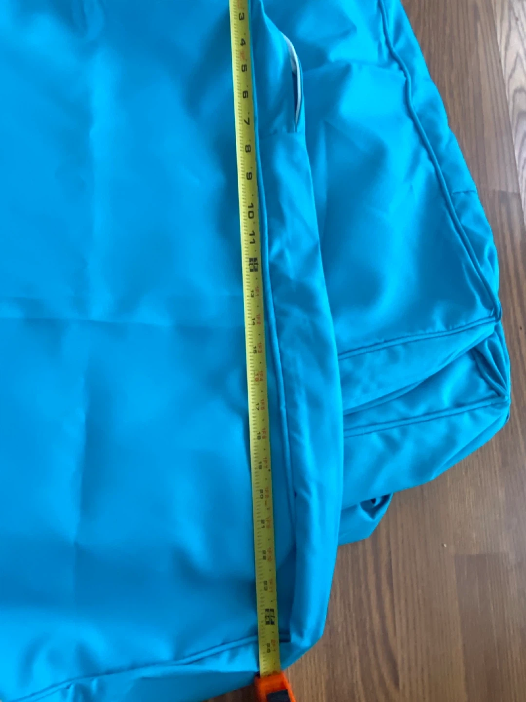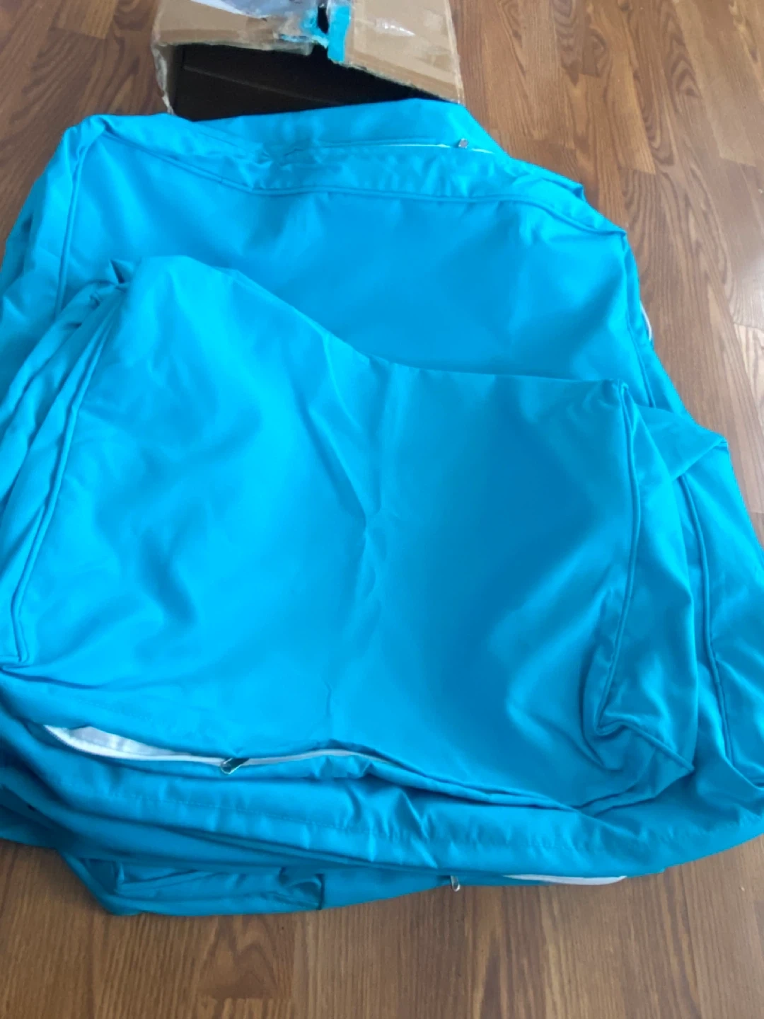 Teal outdoor furniture cushion set for a U-shaped sectional sofa. Includes seat and back cushions. Dimensions of seat cushions are approximately 25 inches by 25 inches, and back cushions are approximately 25 inches by 16 inches. These cushions are made of durable, water-resistant fabric.