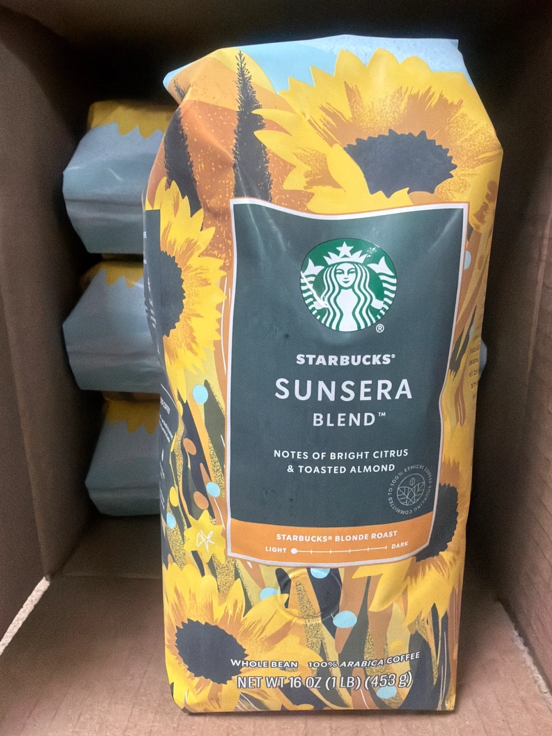 This is Starbucks Sunsera Blend whole bean coffee. It's a 16 oz bag of 100% Arabica coffee. The roast is blonde with notes of bright citrus and toasted almond.