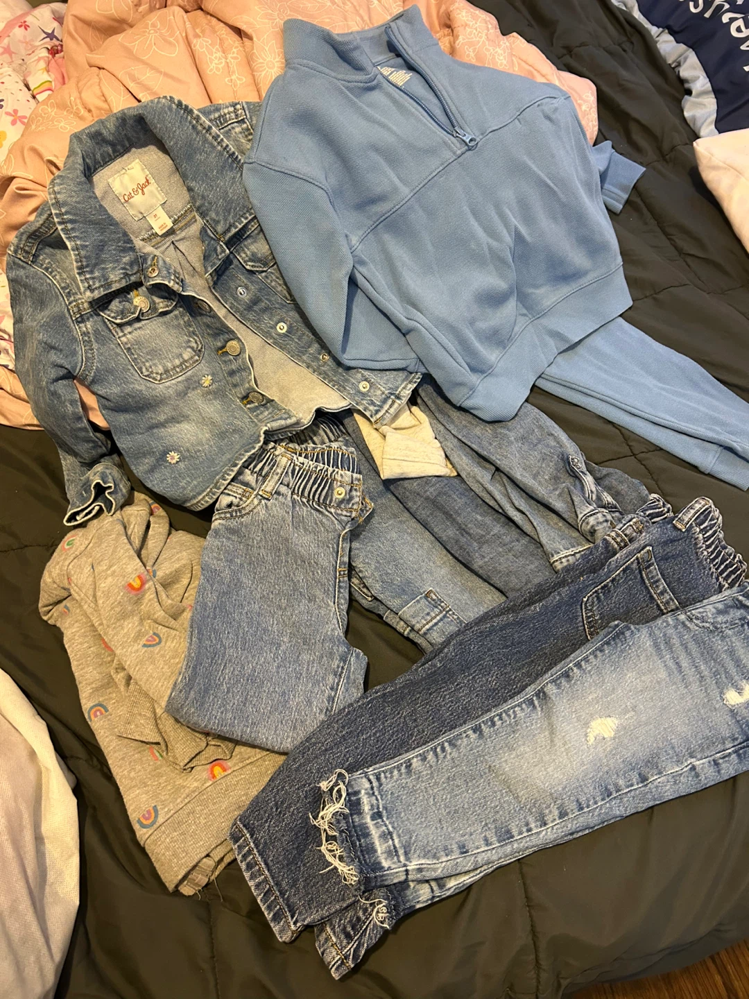 This is a girls' denim jacket from Cat & Jack, size 3T. It also includes a pair of light wash jeans with elastic waistband. Perfect for everyday wear! I have boy jeans as well 4T.