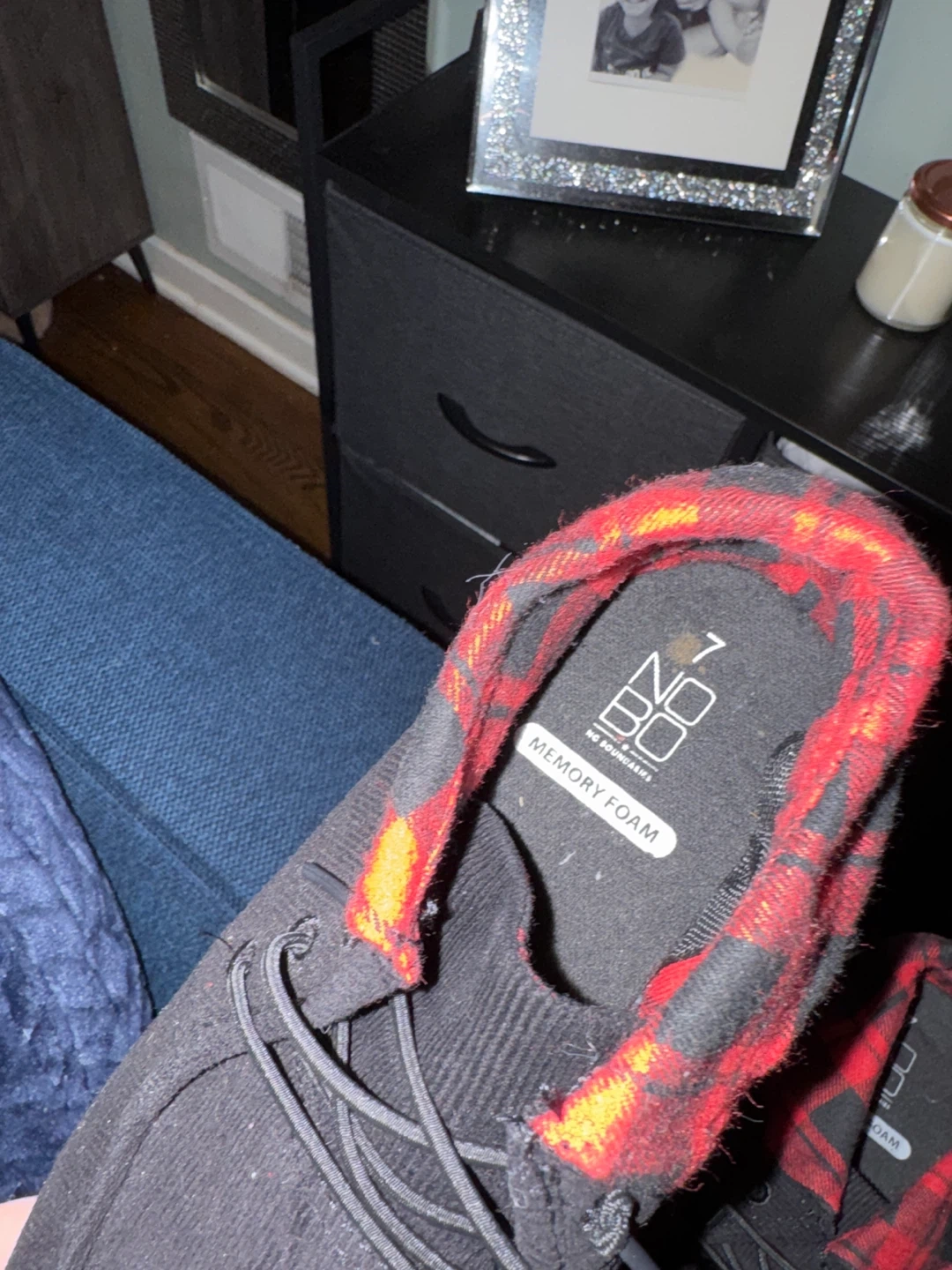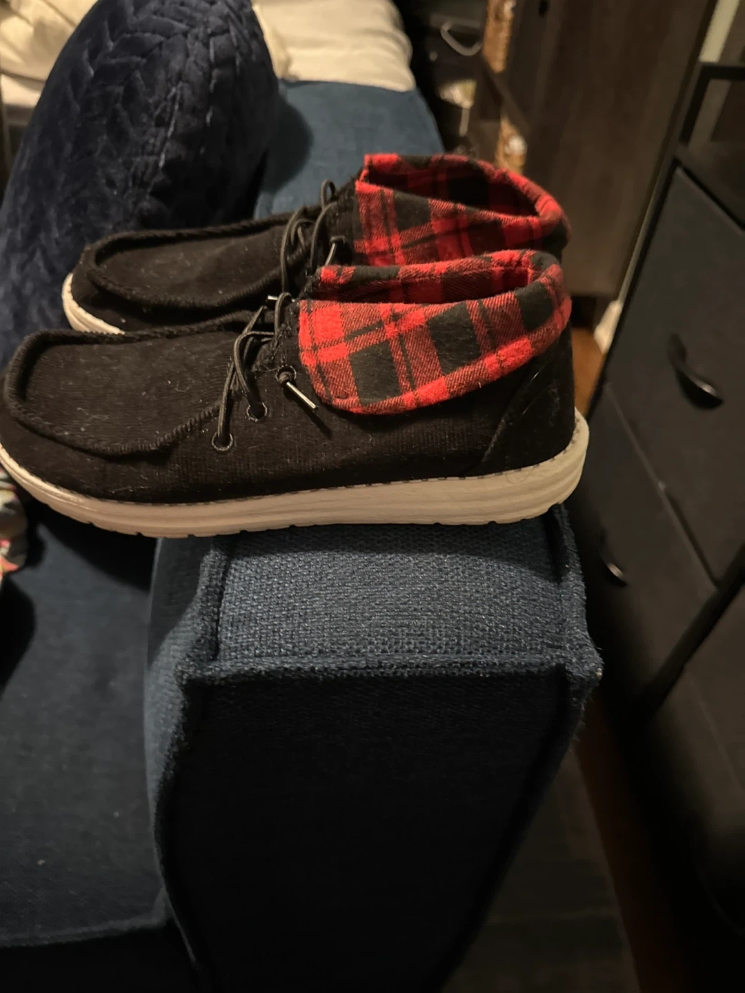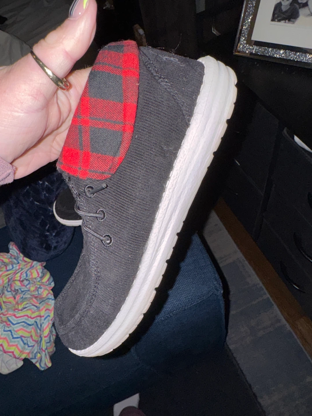 69Selling a pair of No Boundaries black loafers in size 7. They feature a red and black plaid accent. Comfortable memory foam inside!