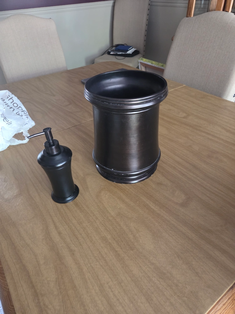 Selling a bathroom set in black. Includes a soap dispenser and a container. Perfect for adding a touch of elegance to your bathroom!