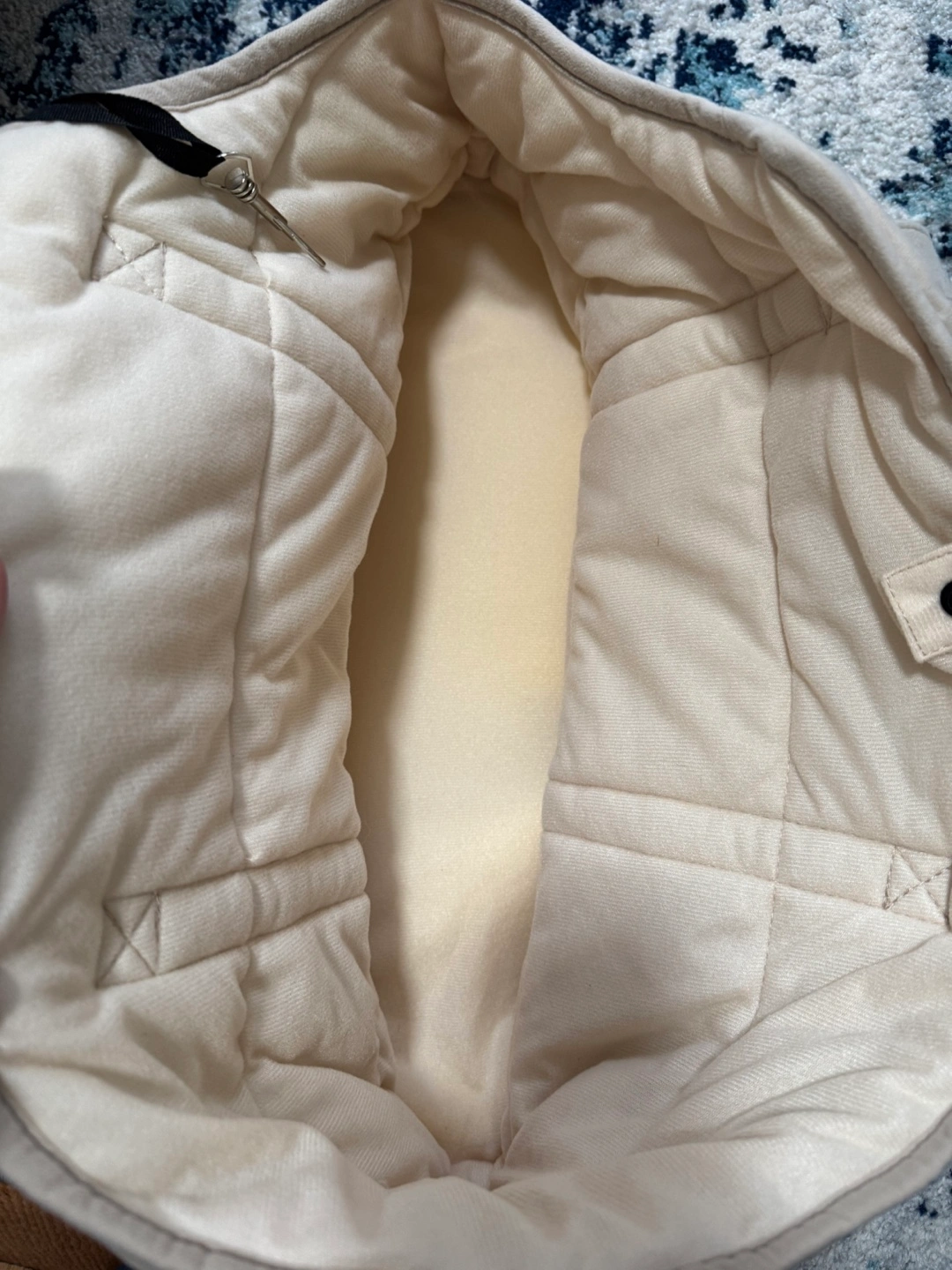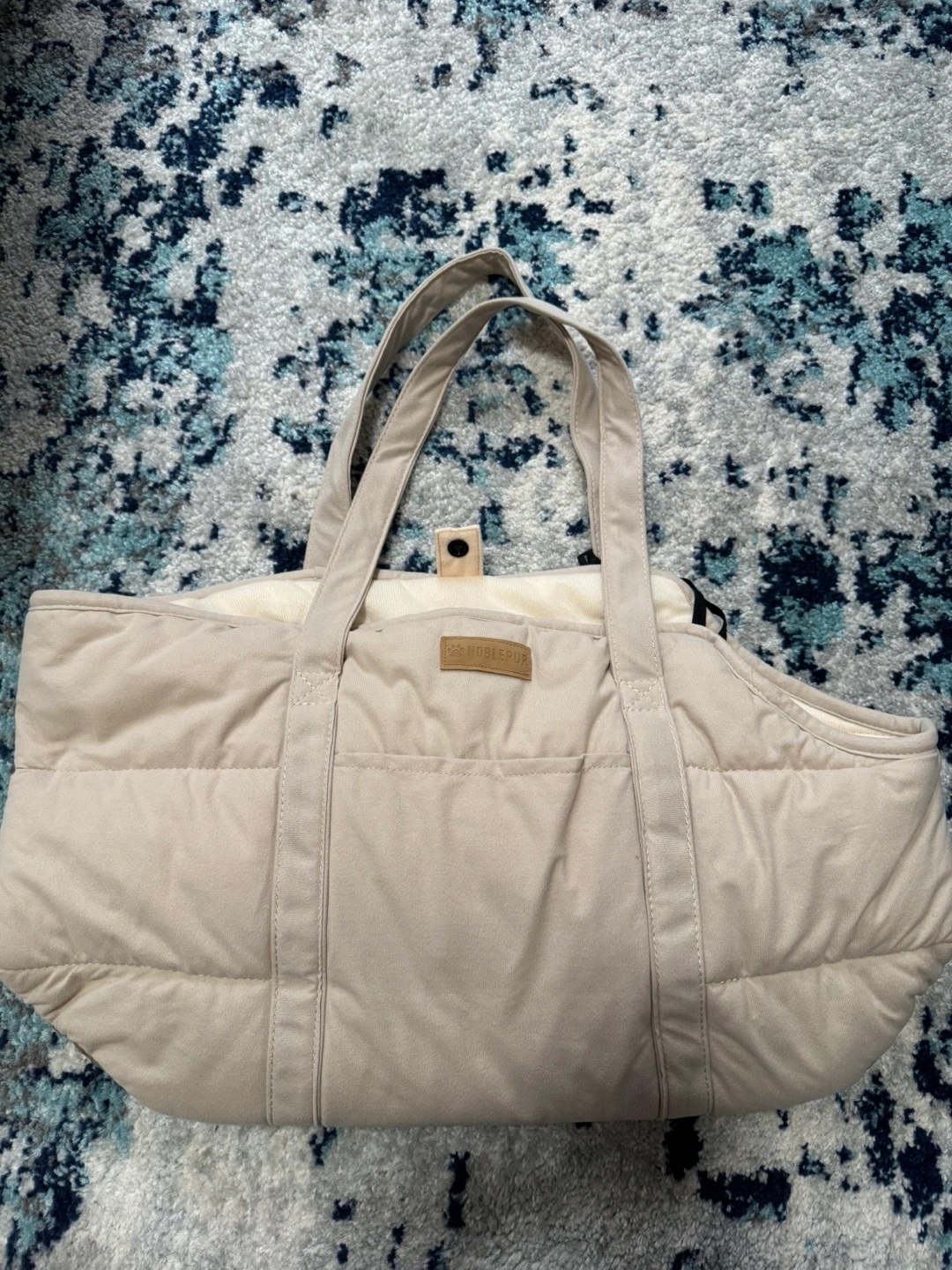 Selling a gently used Noble Pup pet carrier in beige. It's in good condition and ready for your furry friend's adventures! The carrier has a soft, quilted design and sturdy handles for comfortable carrying.