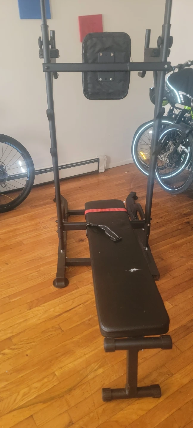 This workout station includes a pull-up bar, dip station, and an adjustable bench. It's designed for a variety of exercises like pull-ups, chin-ups, dips, and bench presses. Great for home workouts. Bench cushion has a small torn. Will be boxed for purchase. Please text for meet up and sell.