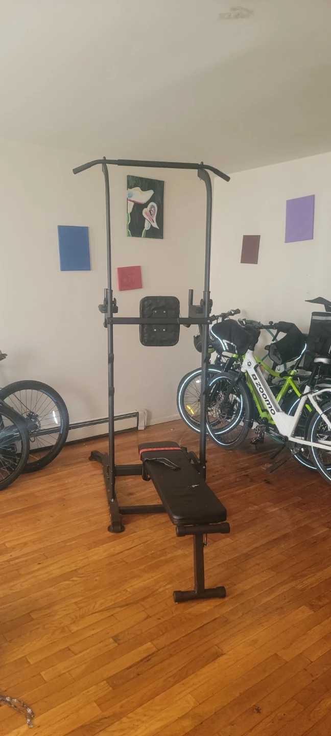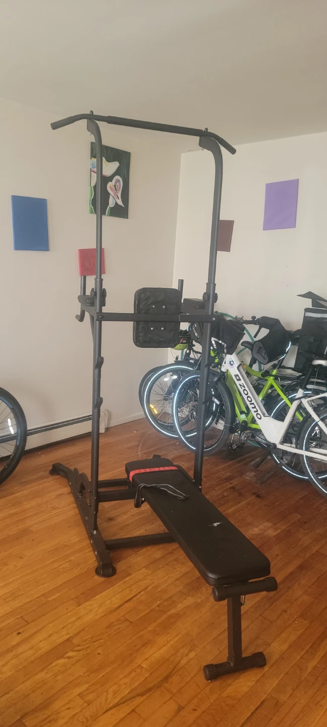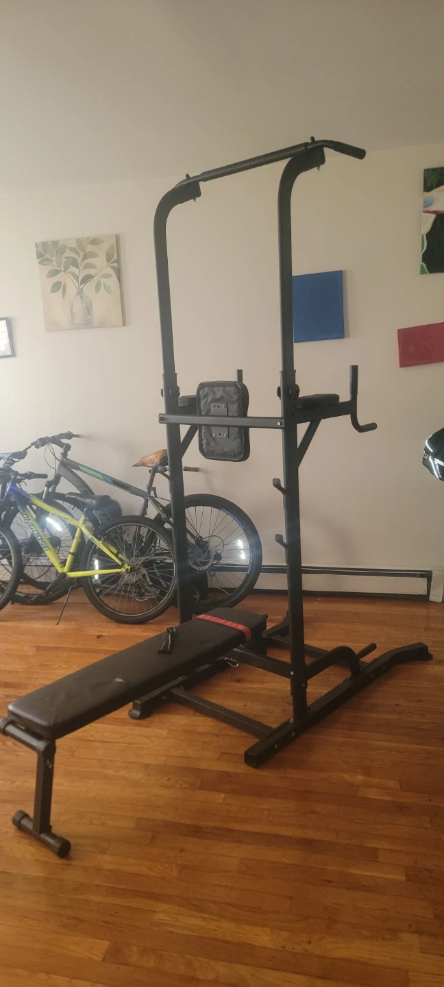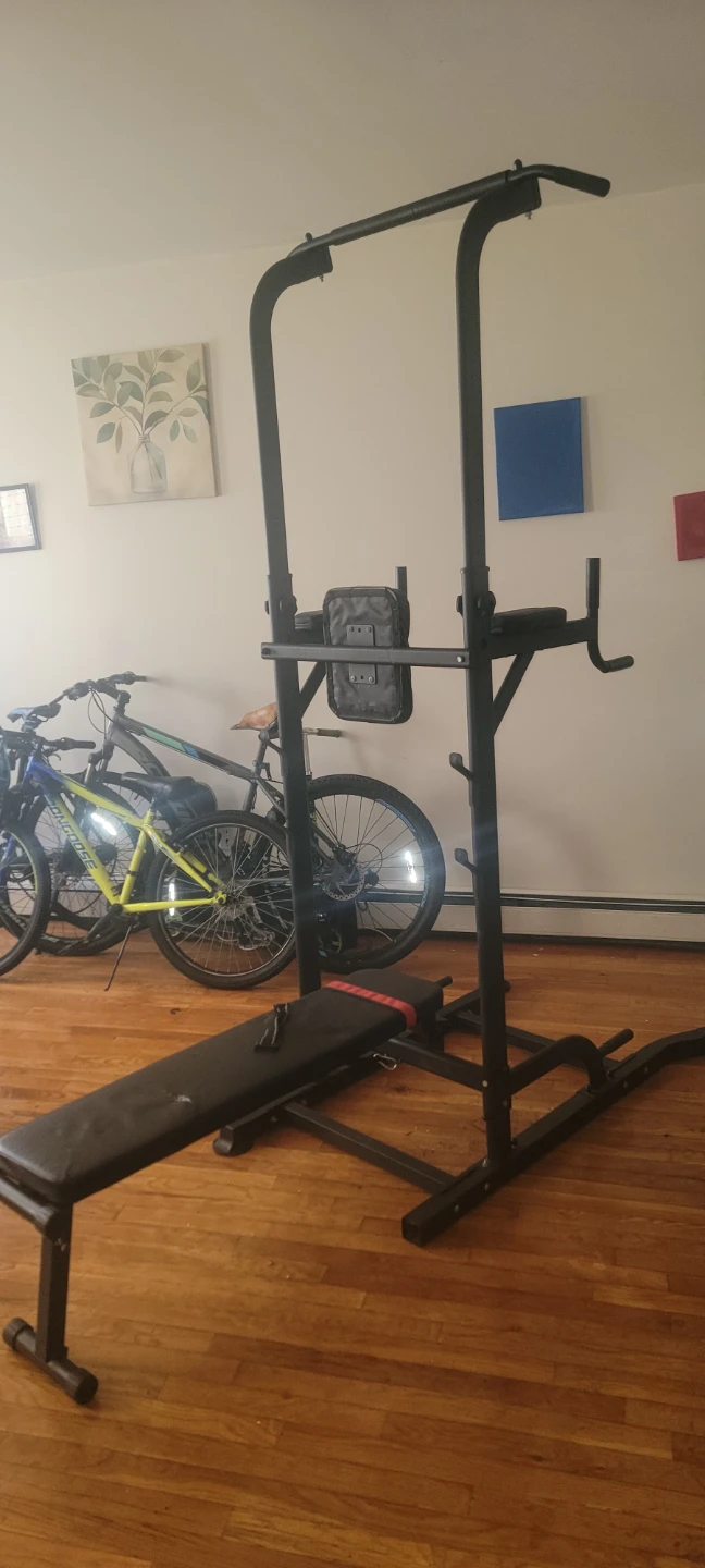 This workout station includes a pull-up bar, dip station, and an adjustable bench. It's designed for a variety of exercises like pull-ups, chin-ups, dips, and bench presses. Great for home workouts. Bench cushion has a small torn. Will be boxed for purchase. Please text for meet up and sell.