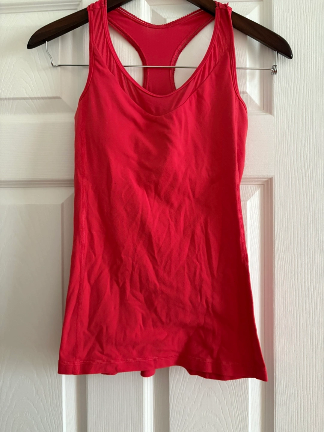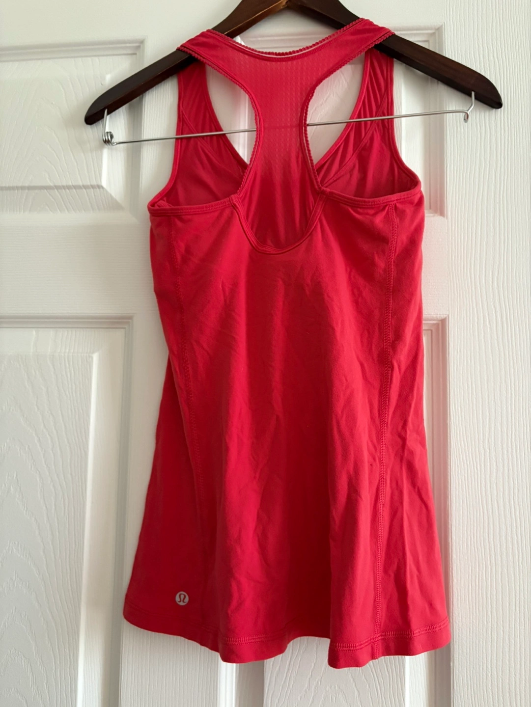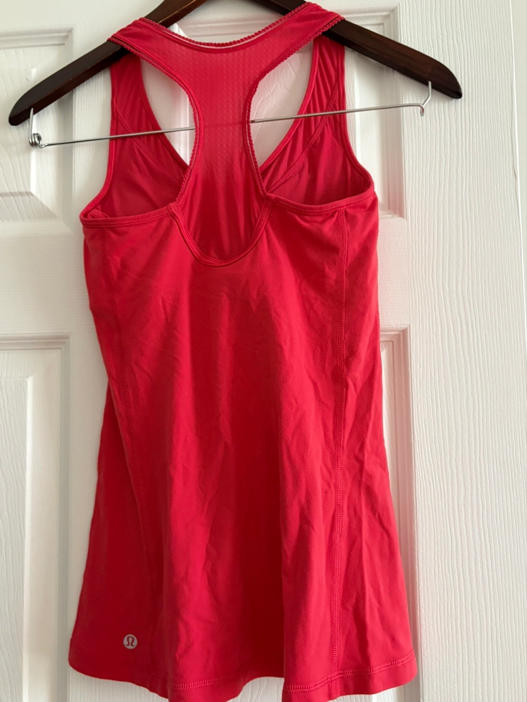 Selling a gently used Lululemon tank top in a vibrant red color! It's in great condition and perfect for workouts or casual wear. Features the Lululemon logo and a comfortable design.