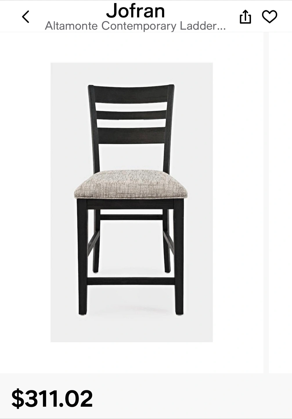 Selling a set of two barstools from jofran Inc. They feature a black wood frame and gray upholstered seat. The chairs are made in Vietnam with all new material consisting of 100% polyurethane foam pad. These chairs are in great condition and would look great in any kitchen. Paid for them $400 feom Ashley furniture collection.