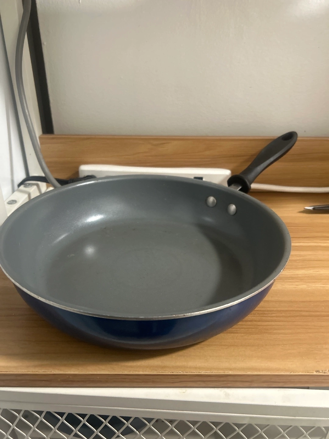 Selling a frying pan. It's blue on the outside and grey on the inside. Perfect for cooking, used once. I do not need it because it is too large and I have a smaller one