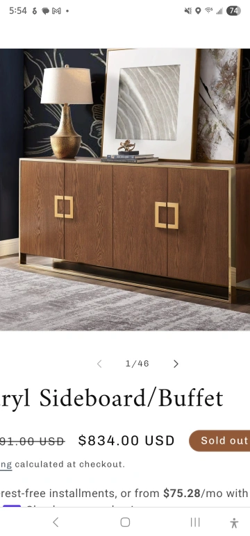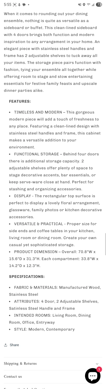 10BRAND NEW UNOPENED BOX This clean-lined sideboard with 4 doors brings both function and modern inspiration to any arrangement in your home. It features a timeless and modern design that will add a touch of freshness to any place. Behind four doors there is additional storage capacity with 2 adjustable shelves offering plenty of space. - Dimensions: 70.8"W x 15.6"D x 31.3"H - Each compartment: 33.8"W x 14.2"D x 12.3"H - Materials: Manufactured Wood, Stainless Steel - Style: Modern, Contemporary
