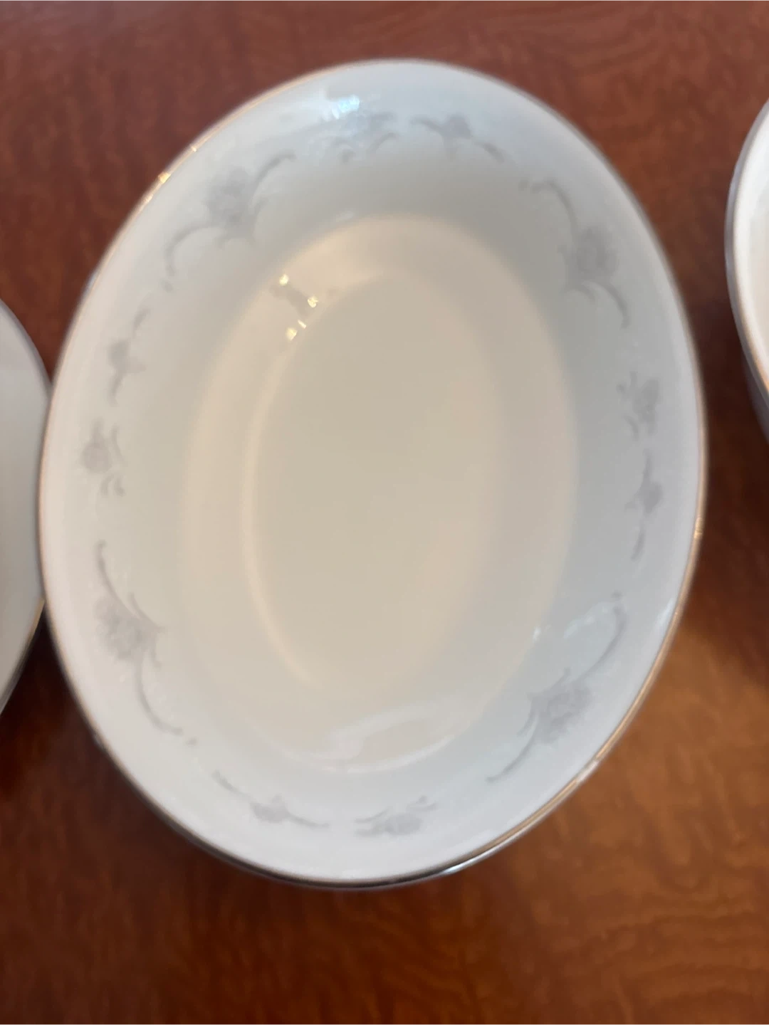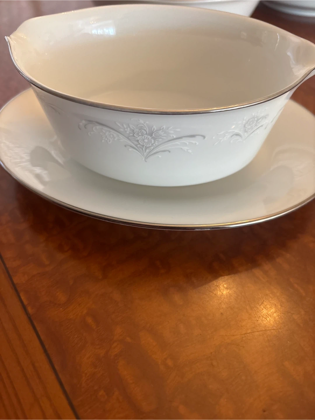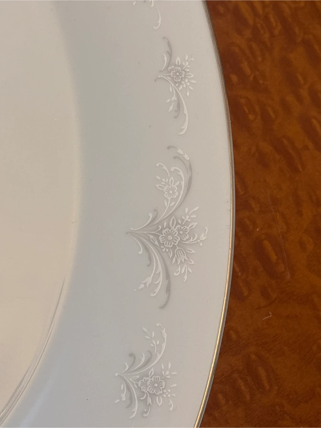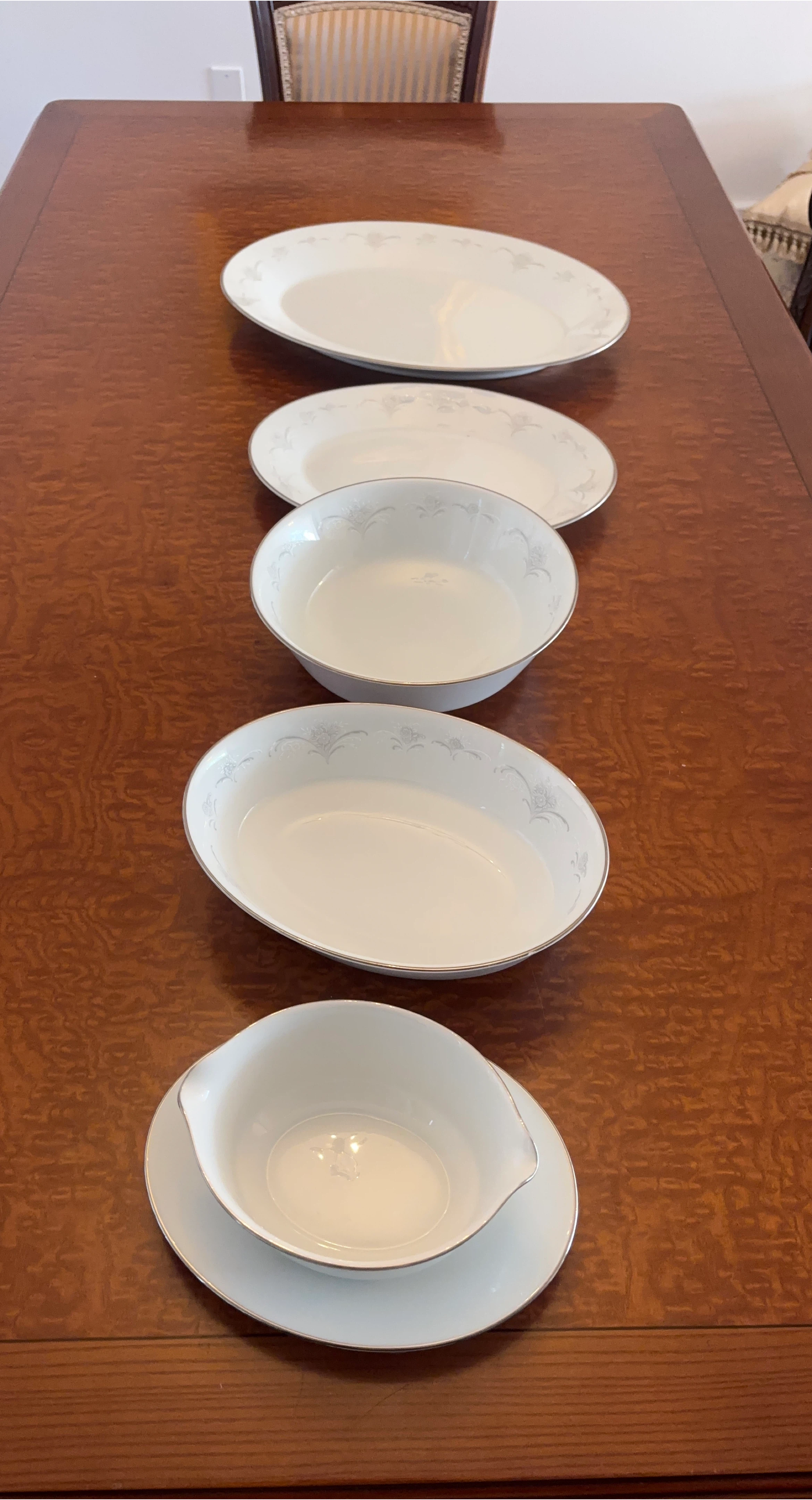 401Selling a beautiful Noritake Casablanca china set. It includes a variety of pieces, perfect for special occasions or everyday use. The set features a delicate floral pattern with a silver trim, adding a touch of elegance to your table setting
