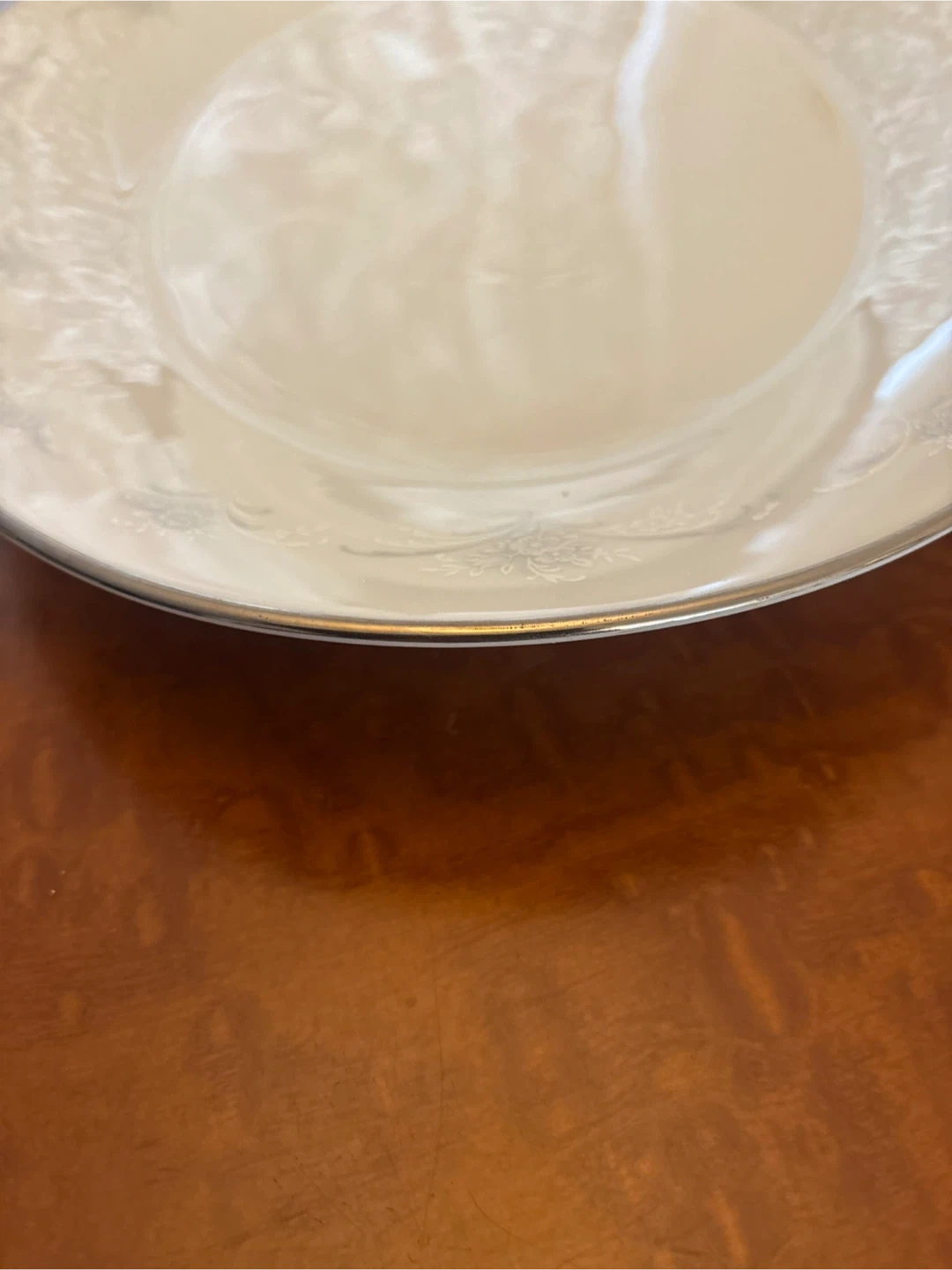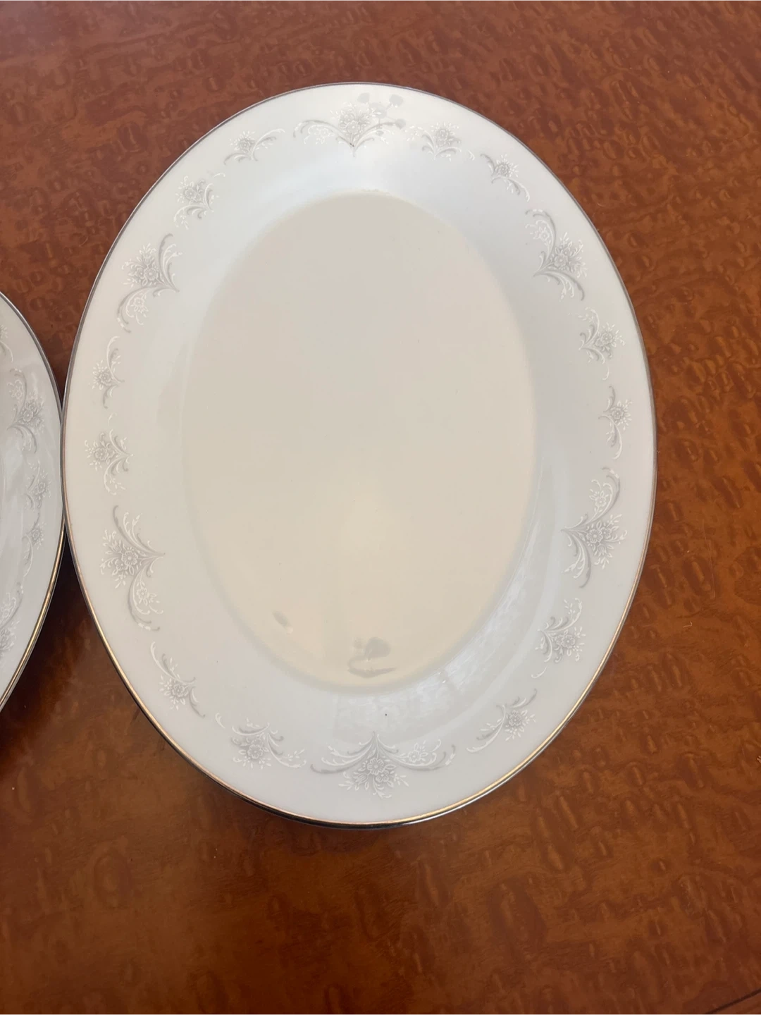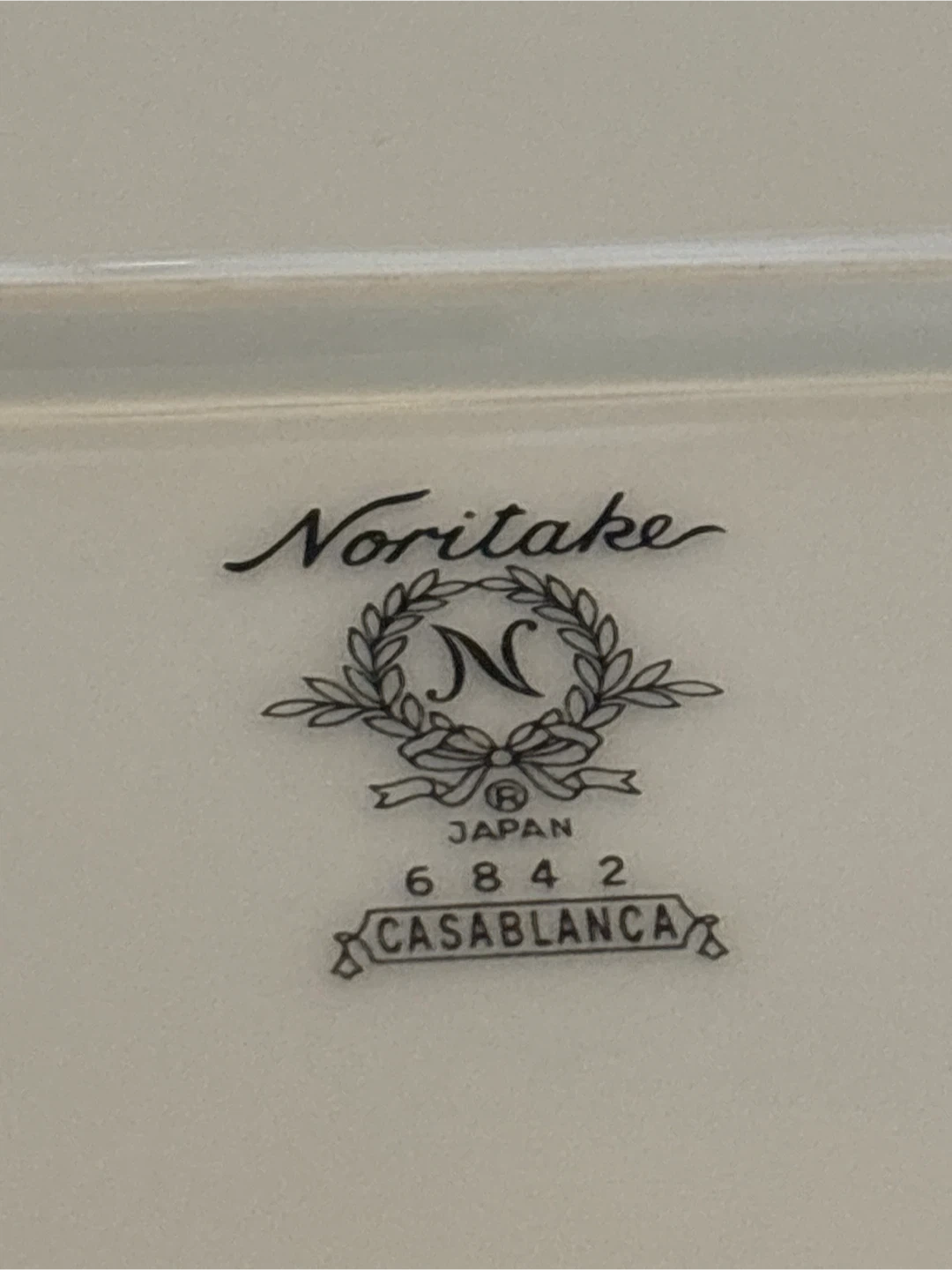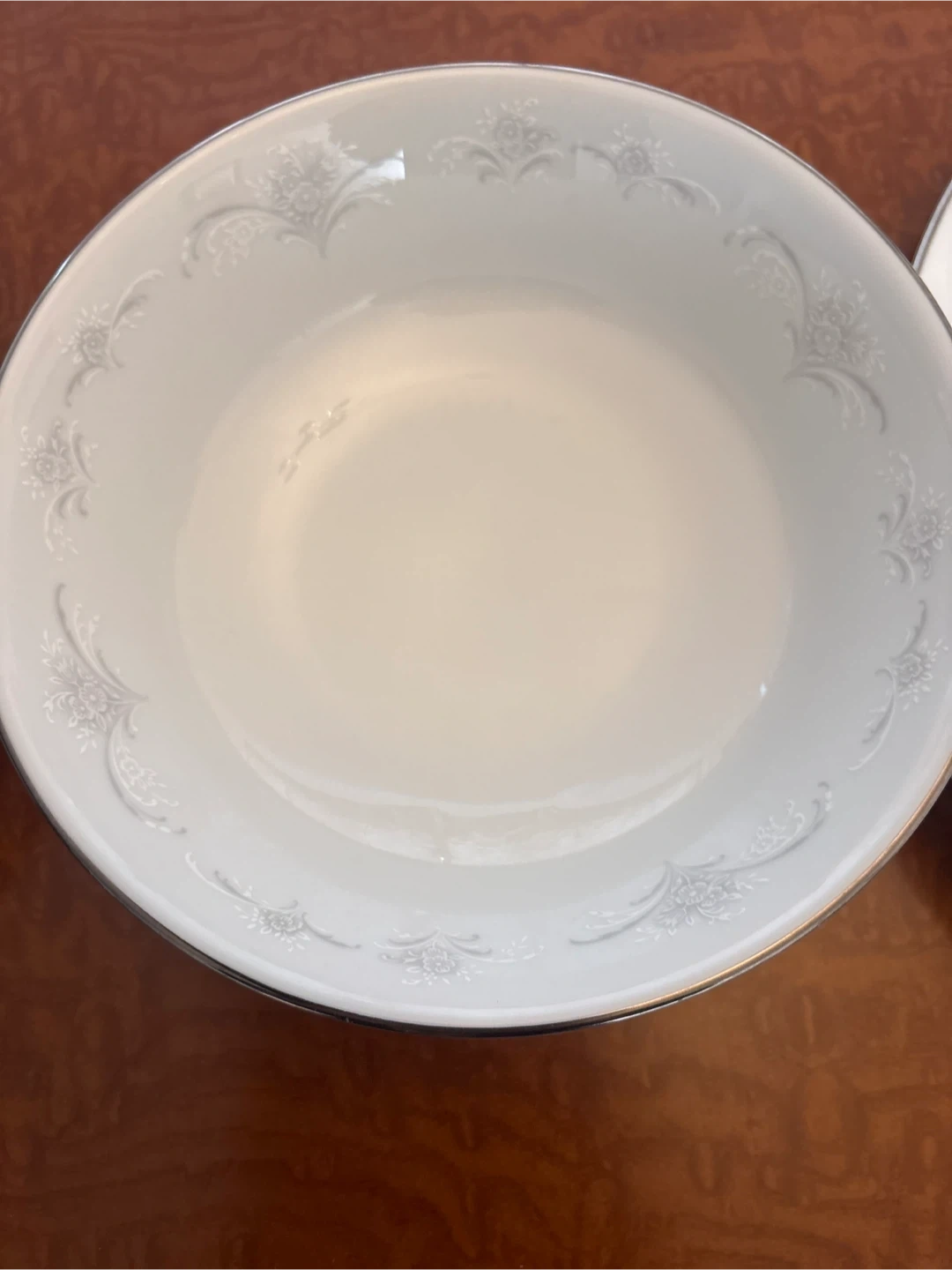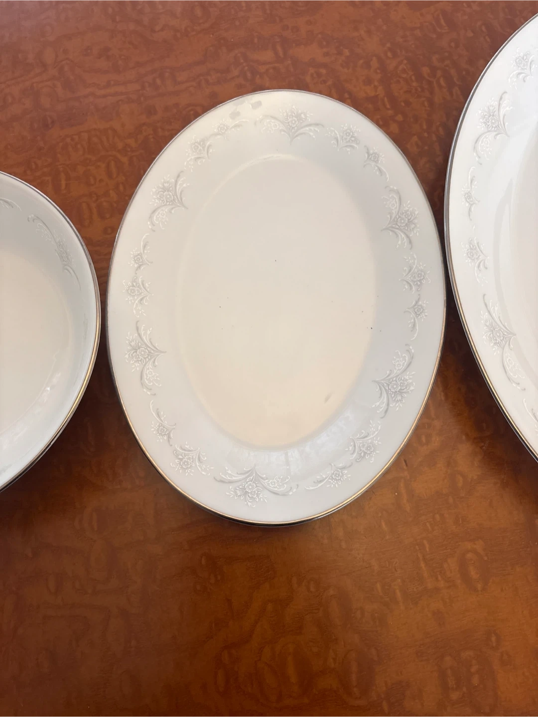 401Selling a beautiful Noritake Casablanca china set. It includes a variety of pieces, perfect for special occasions or everyday use. The set features a delicate floral pattern with a silver trim, adding a touch of elegance to your table setting