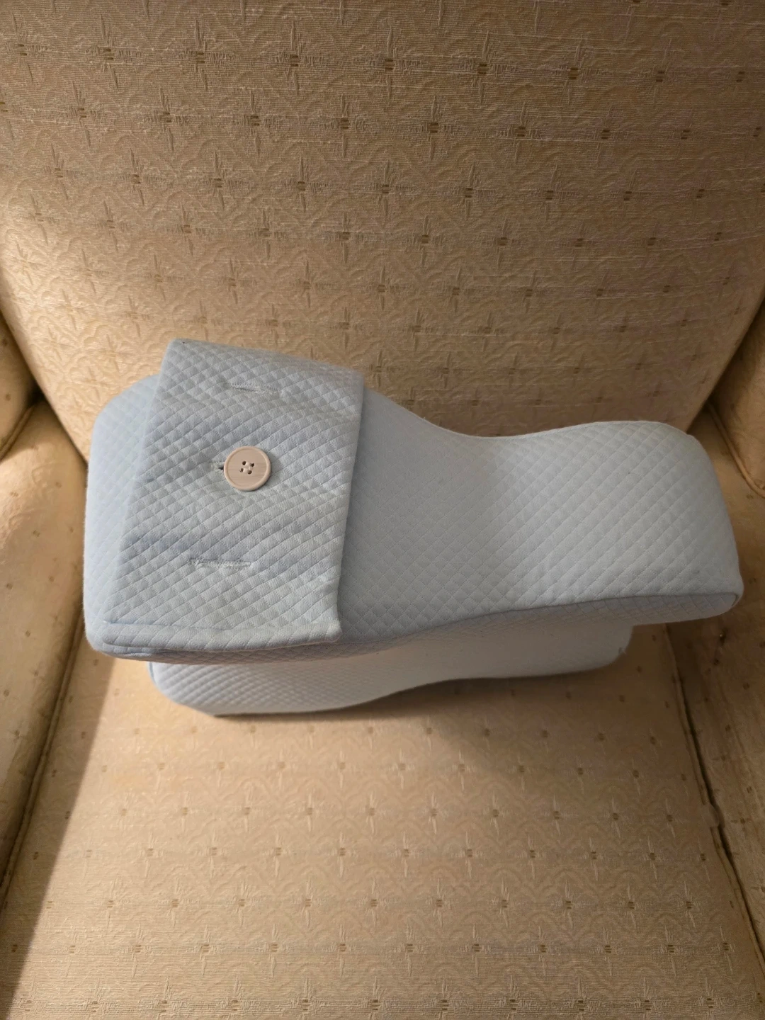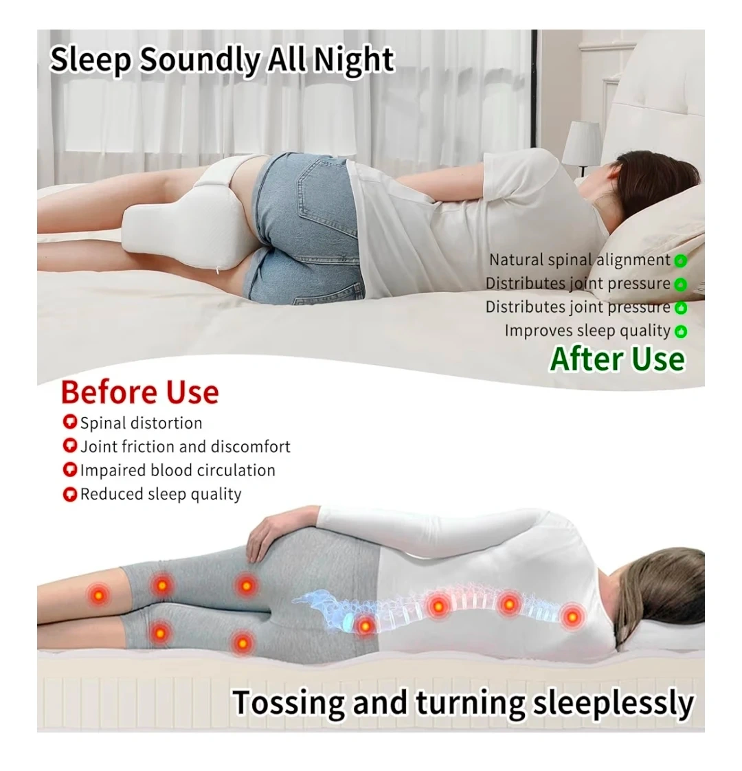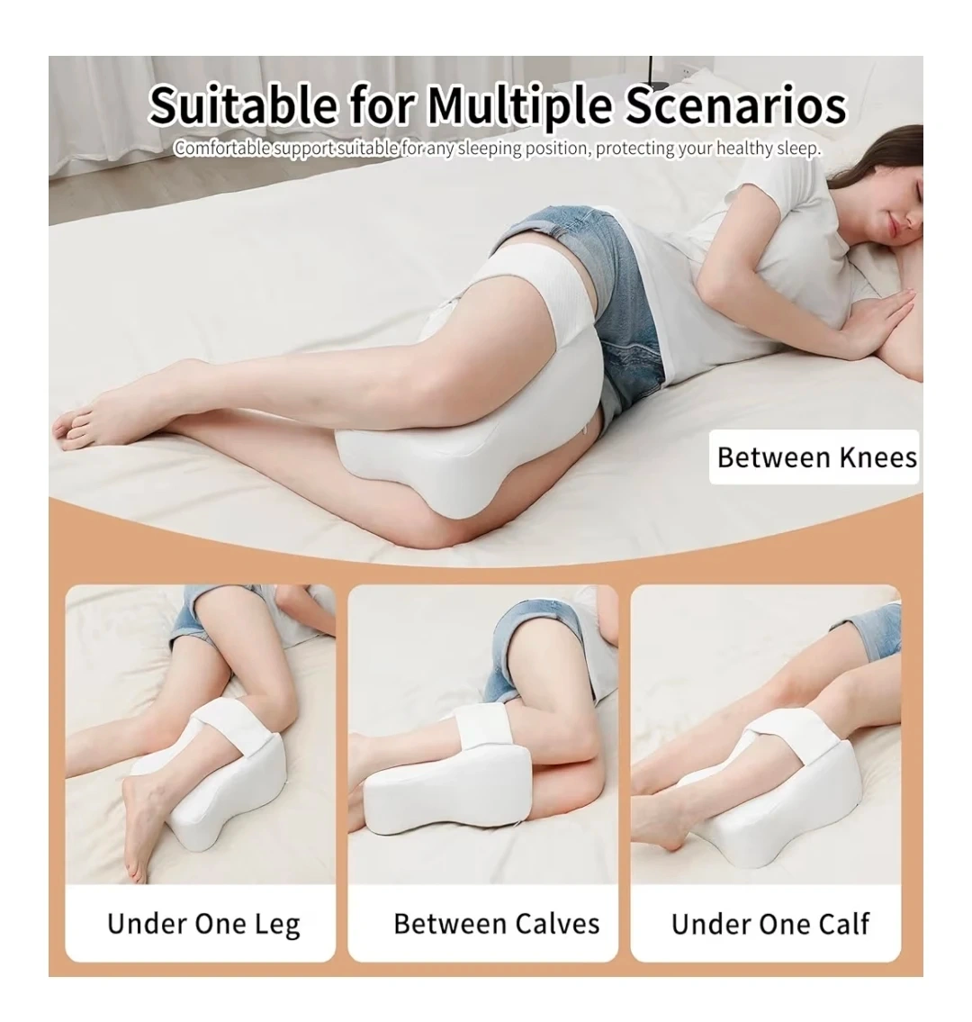 This blue contoured knee pillow provides comfort for side sleepers. It features an adjustable button closure and a 4-inch wide adjustable strap for a secure fit. The pillow's design helps distribute joint pressure and improve sleep quality.