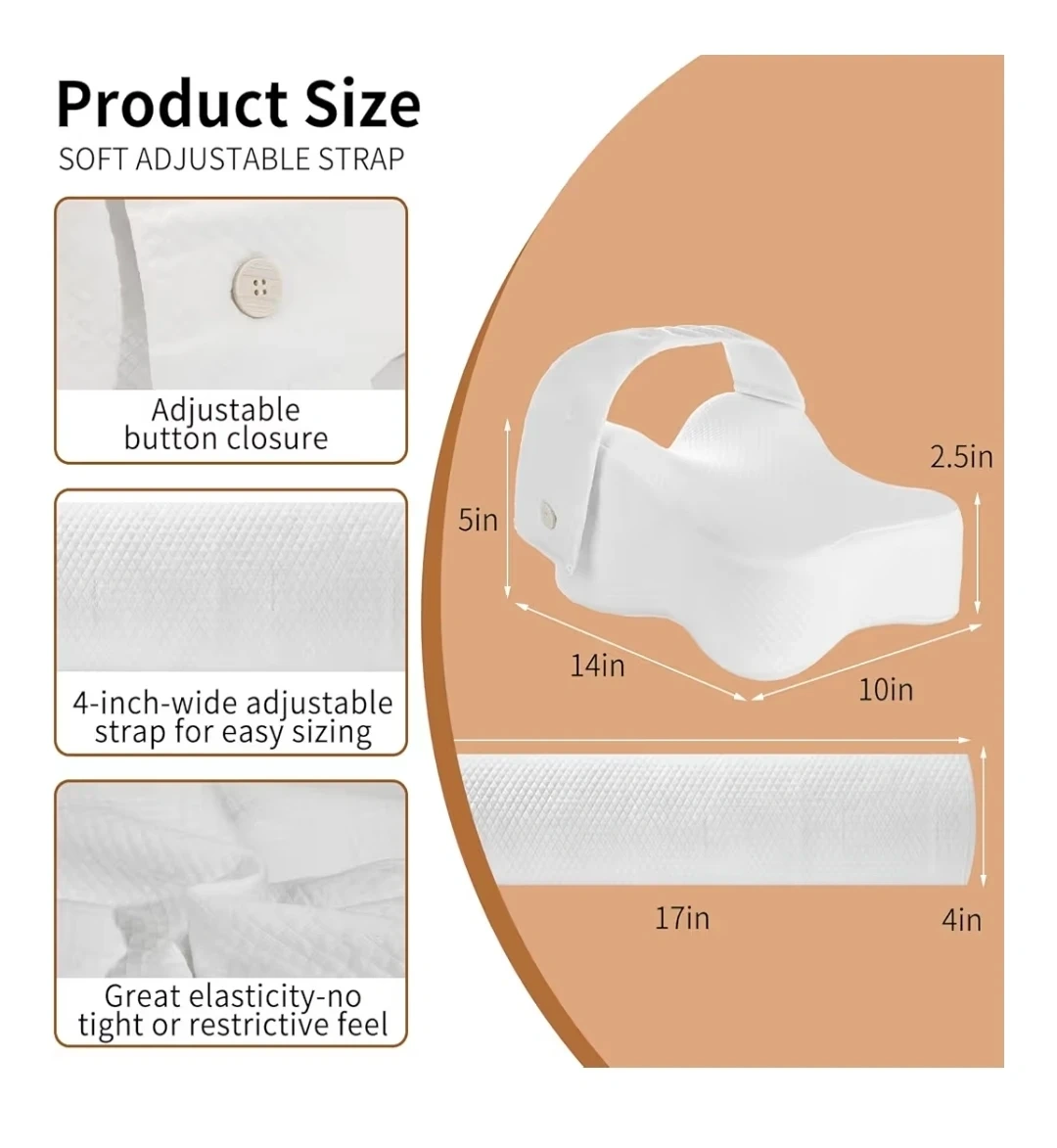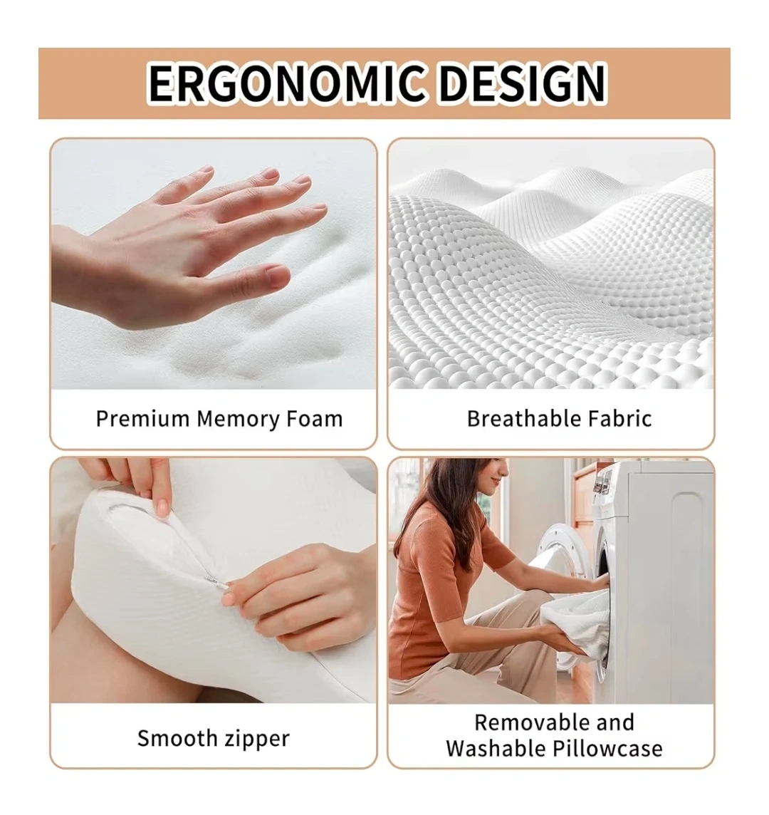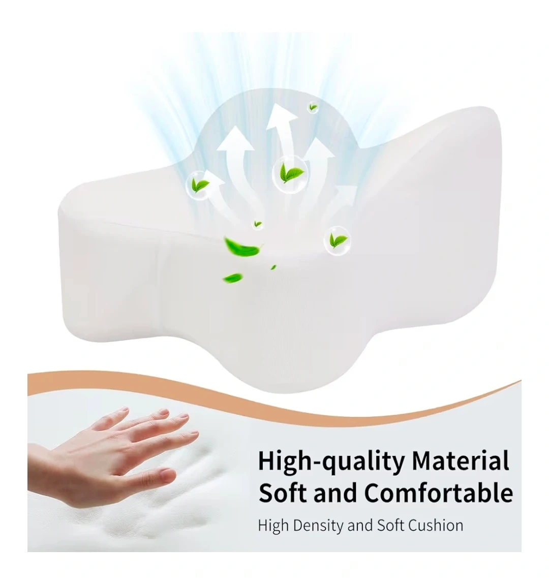 This blue contoured knee pillow provides comfort for side sleepers. It features an adjustable button closure and a 4-inch wide adjustable strap for a secure fit. The pillow's design helps distribute joint pressure and improve sleep quality.