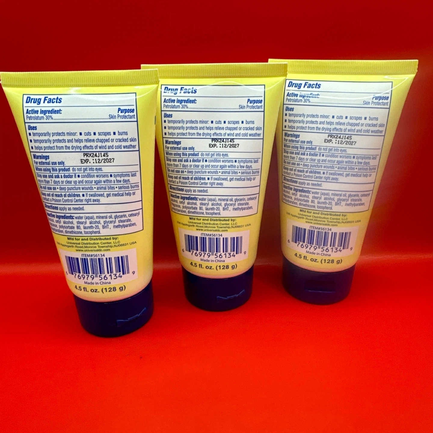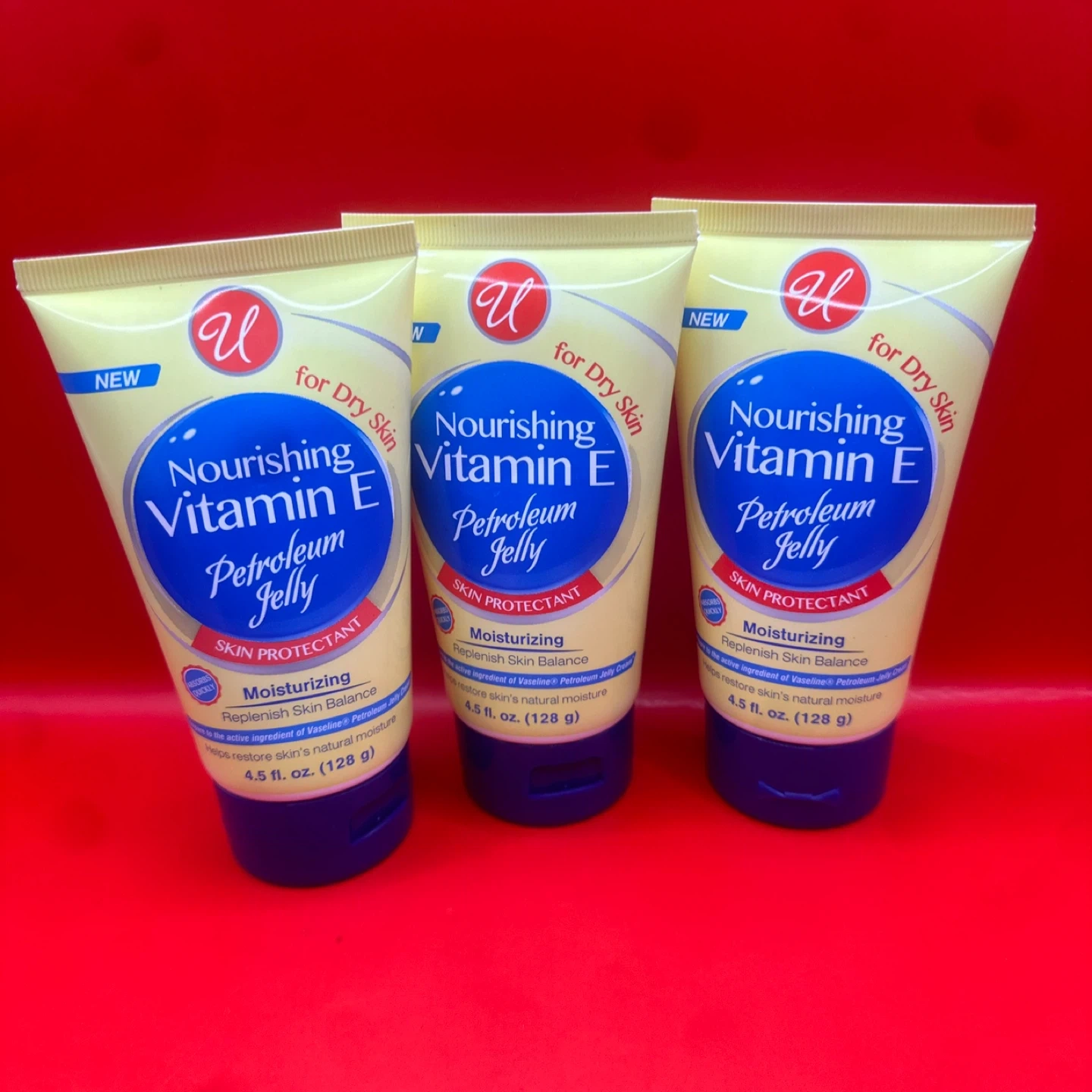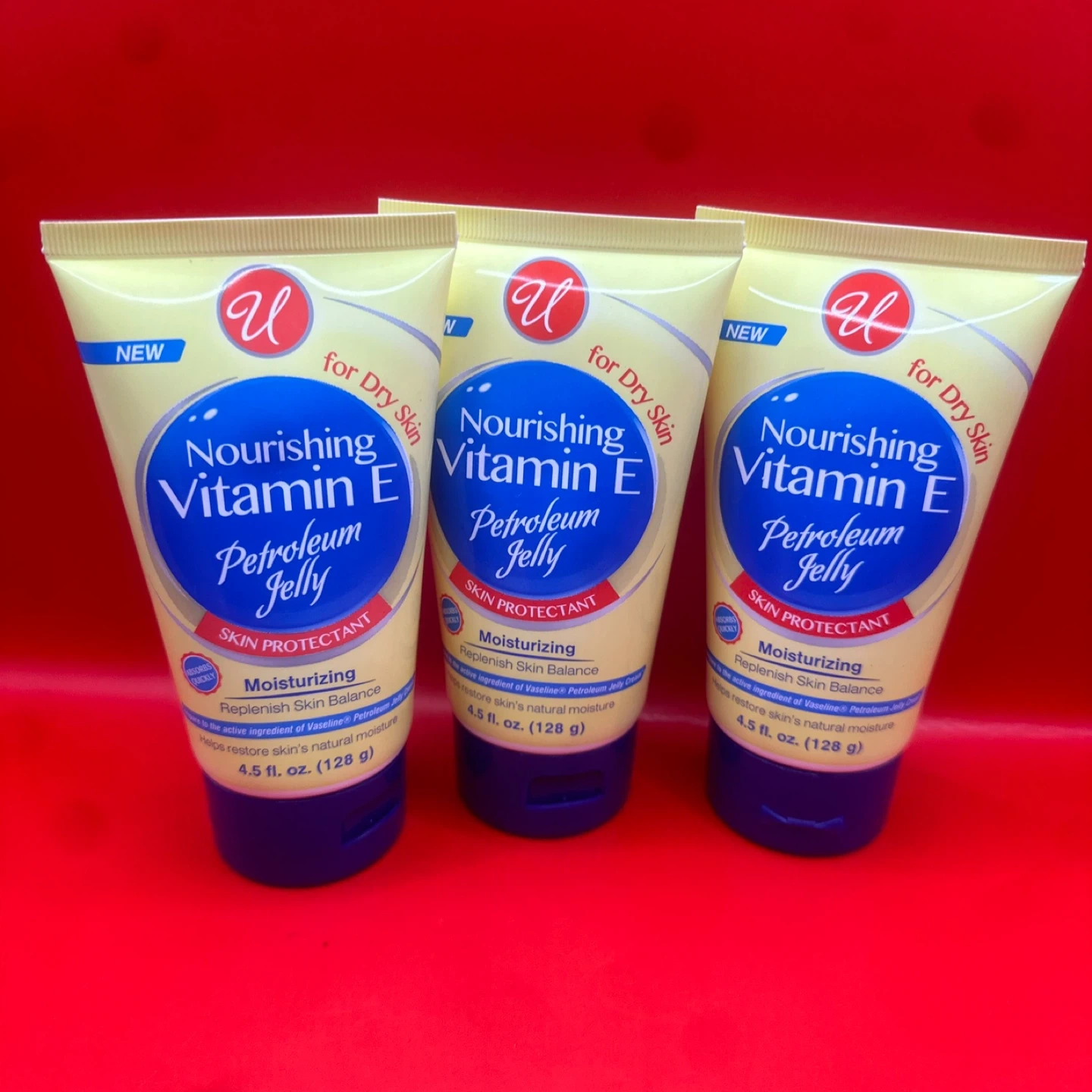 I have Nourishing Vitamin E Petroleum Jelly for dry skin. It's a skin protectant that moisturizes and helps replenish your skin's natural balance. Each tube contains 4.5 fl oz (128 g). The expiration date is November 2027