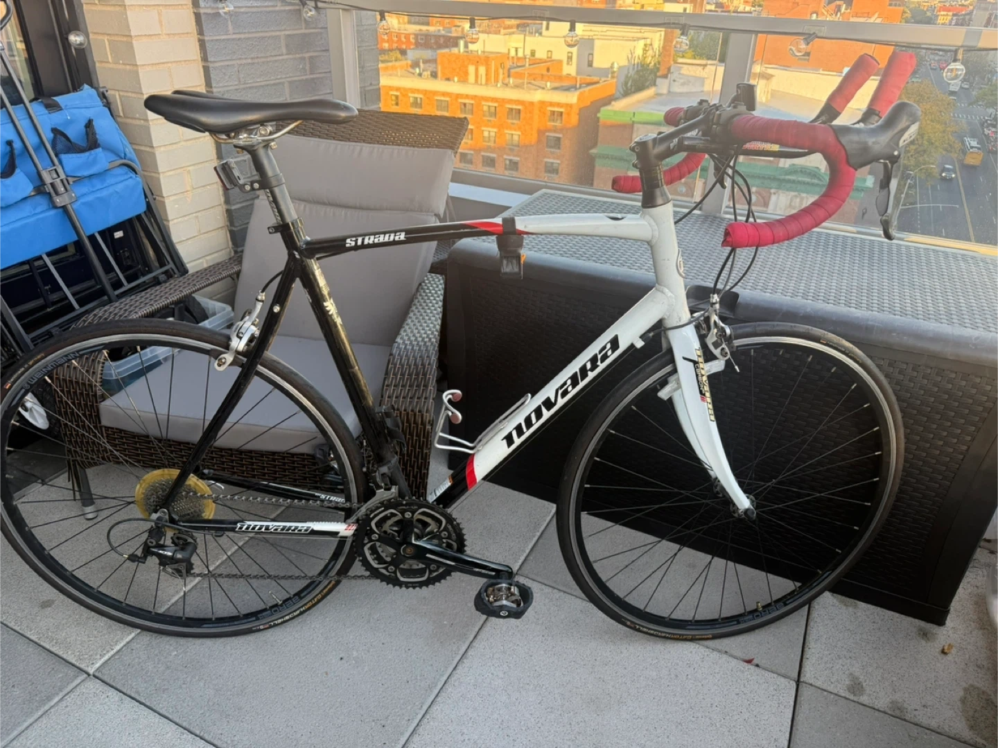 Selling a Novara Strada road bike. It's a sleek black and white color combo. The red handlebar tape adds a nice pop of color. Perfect for getting around town or enjoying a leisurely ride!