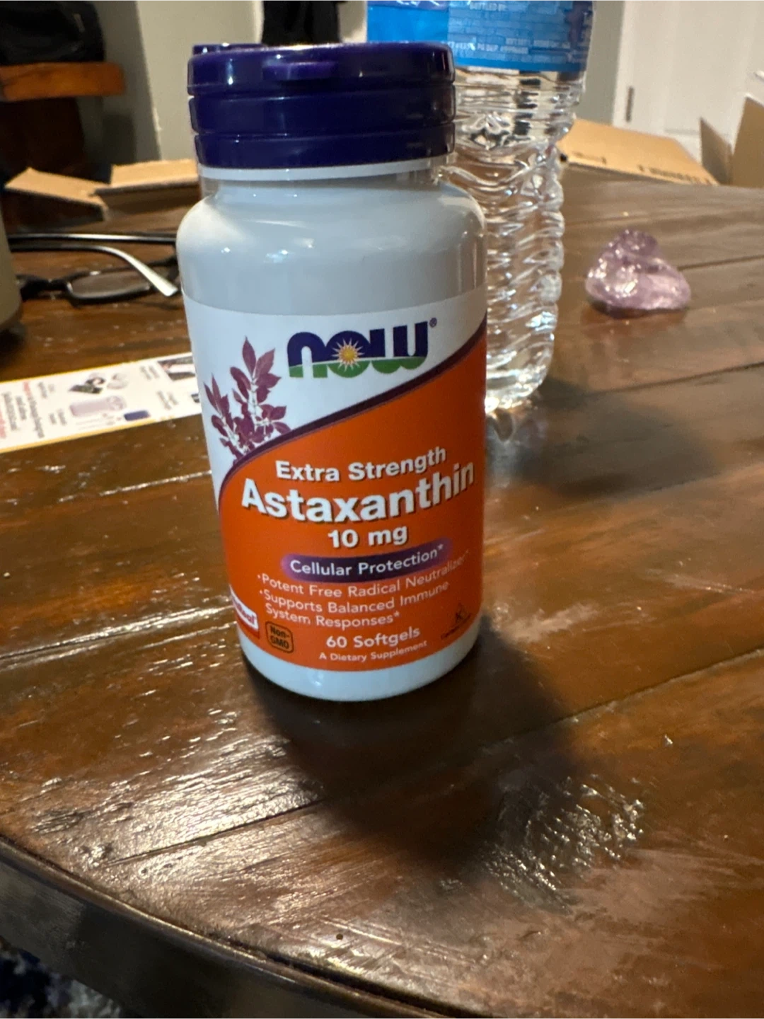 Selling a bottle of NOW Astaxanthin, extra strength, 10mg, with 60 softgels. It offers cellular protection and supports a balanced immune system response. A dietary supplement.