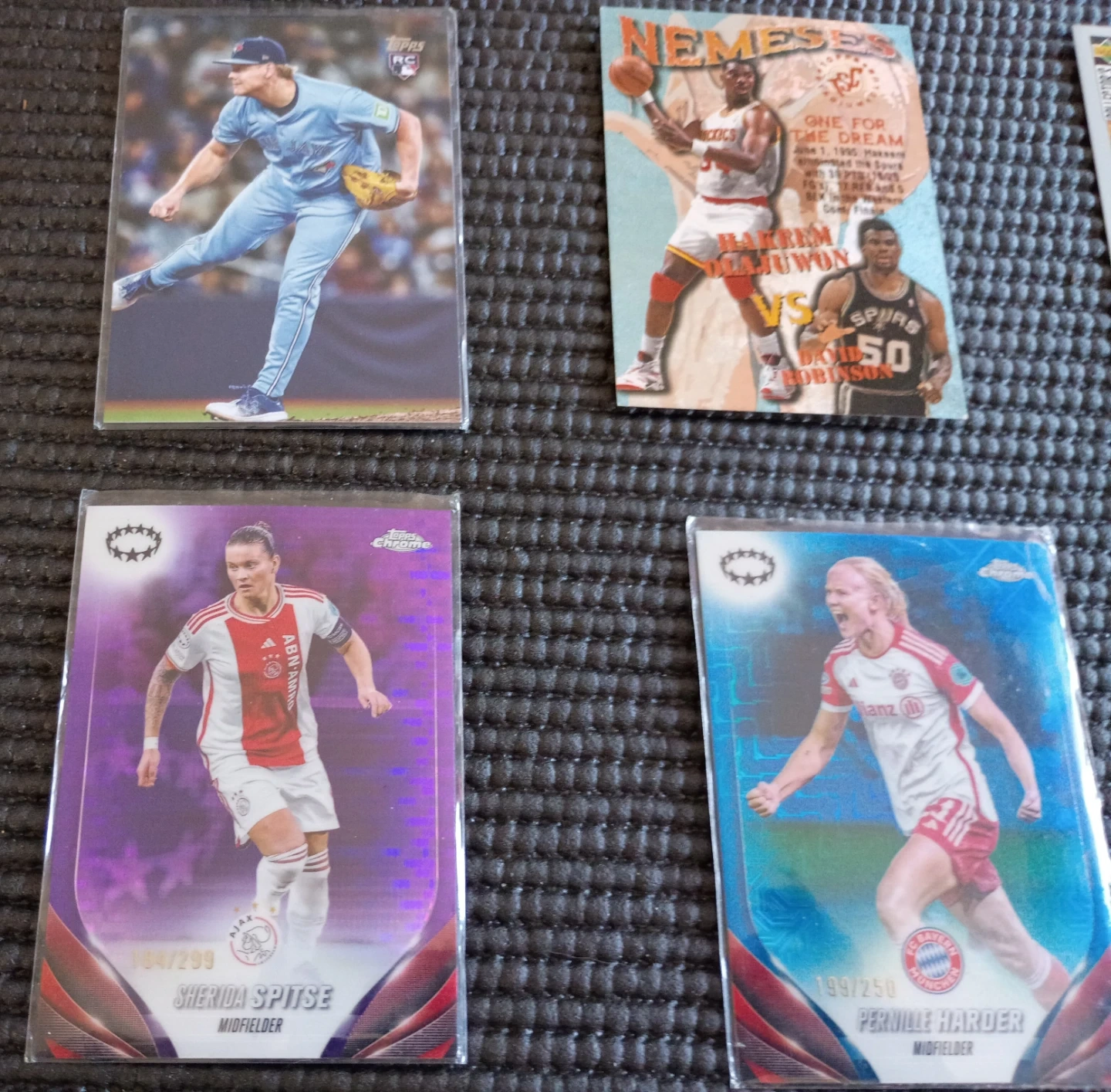 This lot includes a Topps RC baseball card and two Topps Chrome soccer cards: Sherida Spitse (164/299) and Pernille Harder (199/250). It also features a vintage basketball card with Hakeem Olajuwon vs. David Robinson.