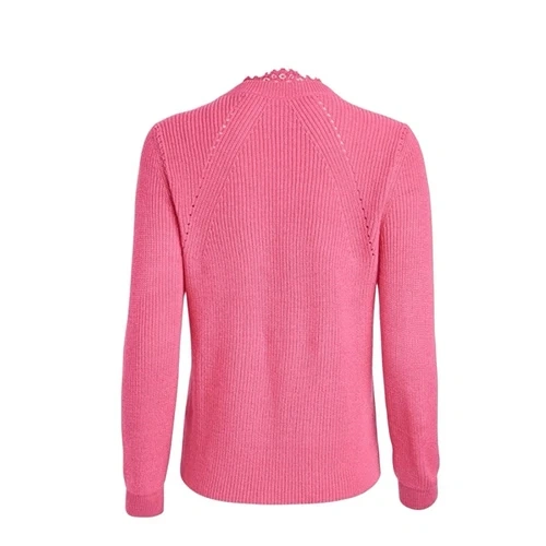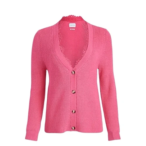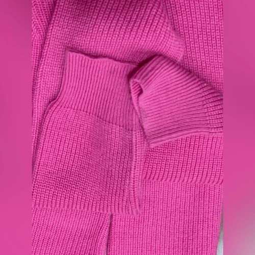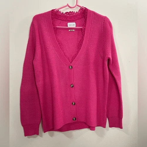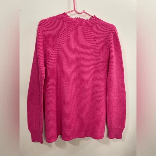 Hot pink color, button down. Mid-weight knit V neck with chantilly lace trim, Button placket Long sleeves. Light stain near pit area, & on cuffs, barely visible as seen on last photo. Approx measurements: •Shoulder: 16" •Bust: 19" •Waist: 17.5" •Sleeve: 23" •Length: 24"