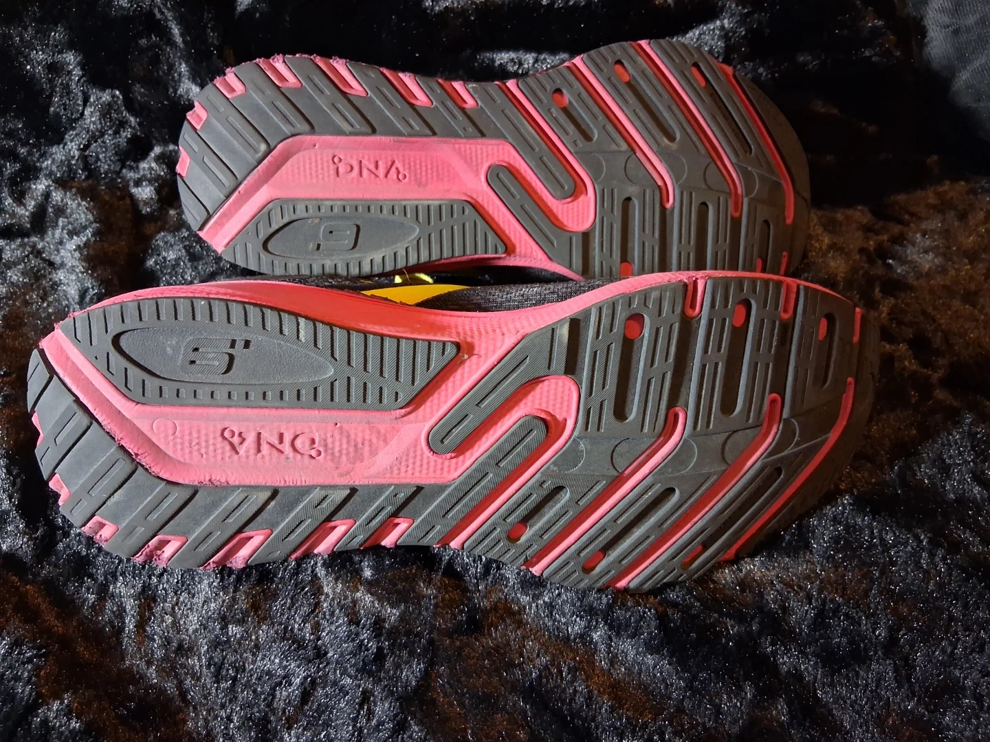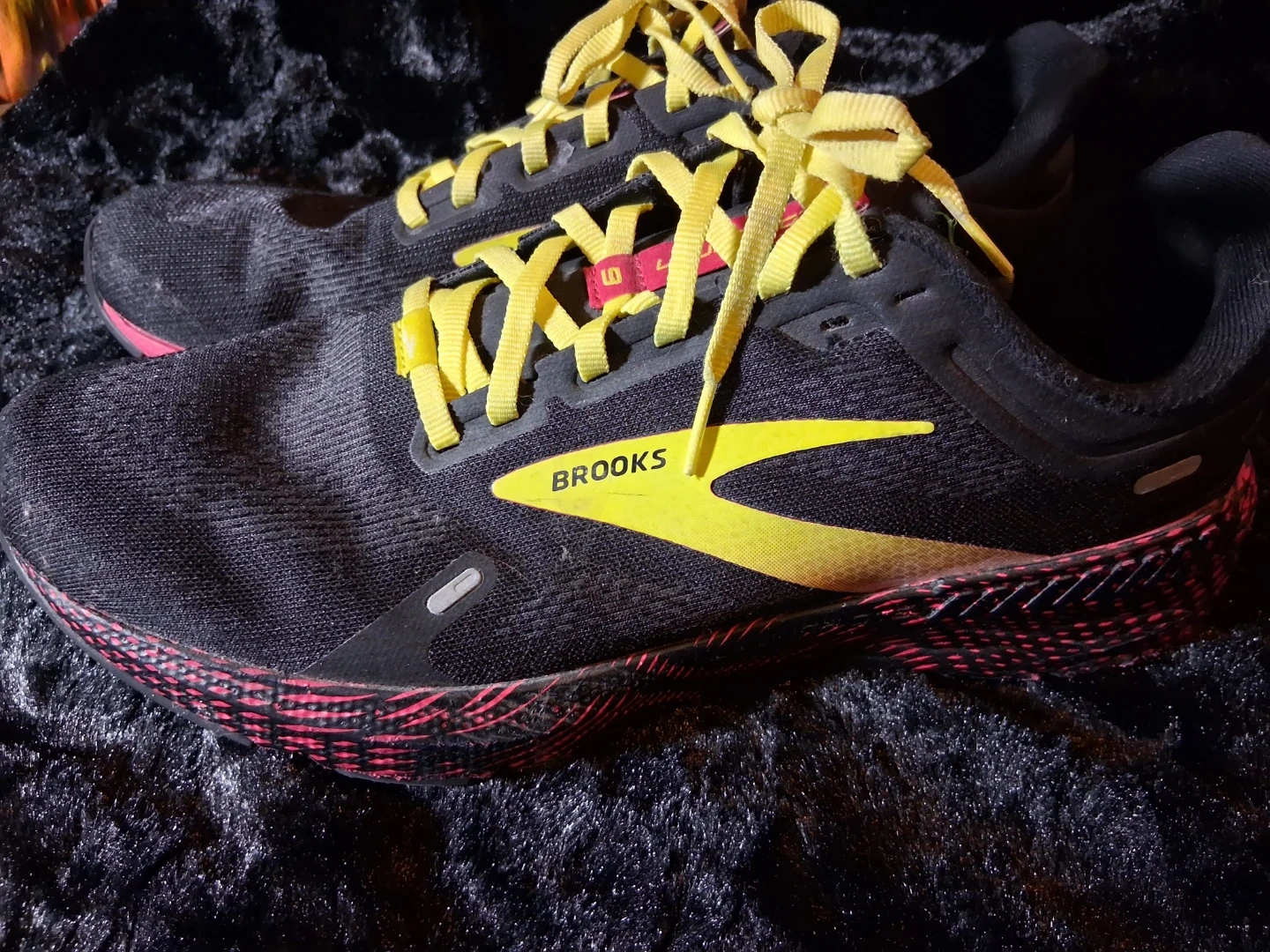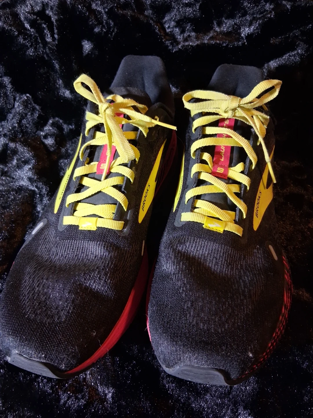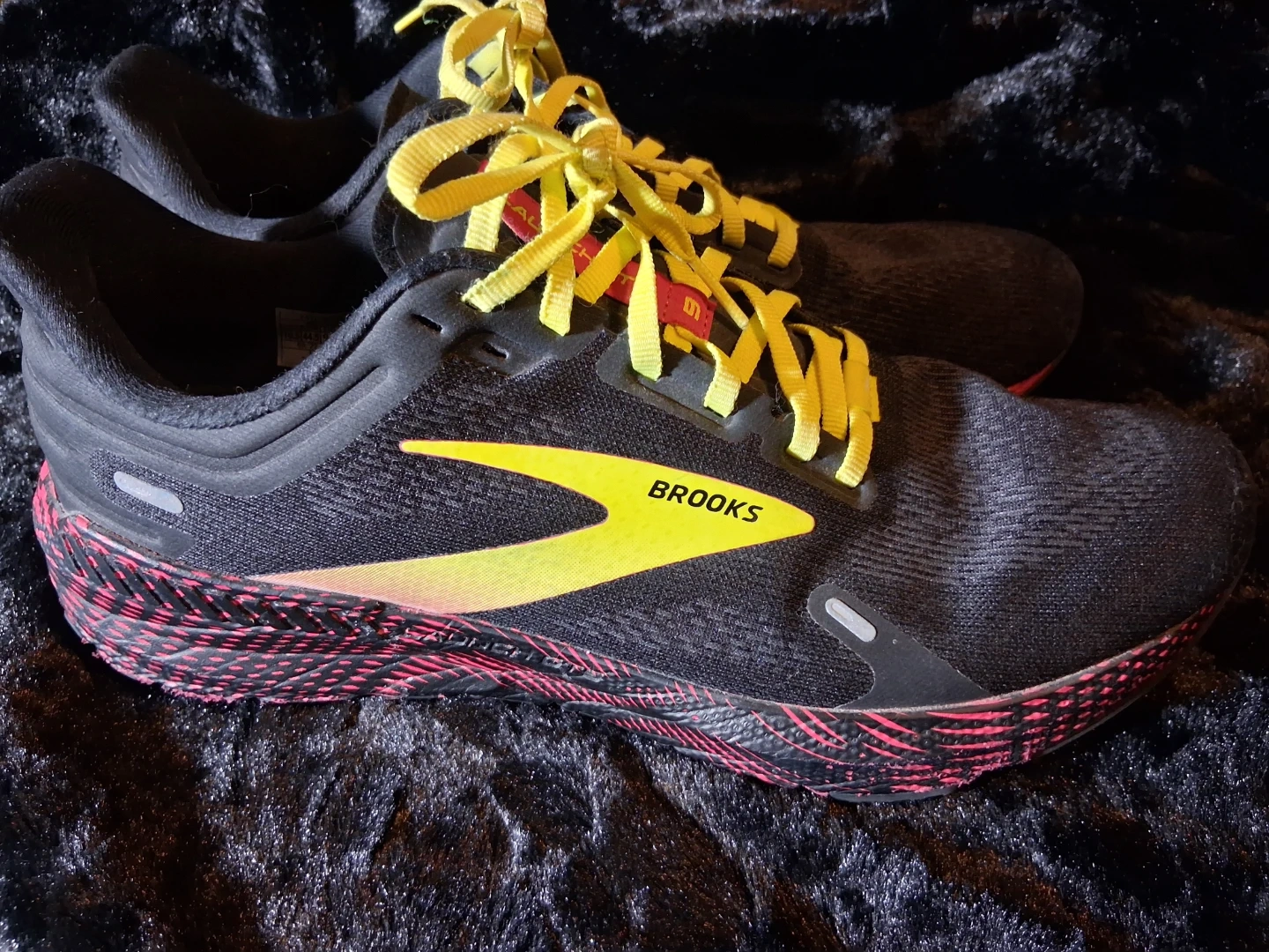 Black and yellow Brooks Ghost 15 running shoes. These shoes are designed for comfort and performance during runs. Features a durable sole and breathable upper for a great fit.