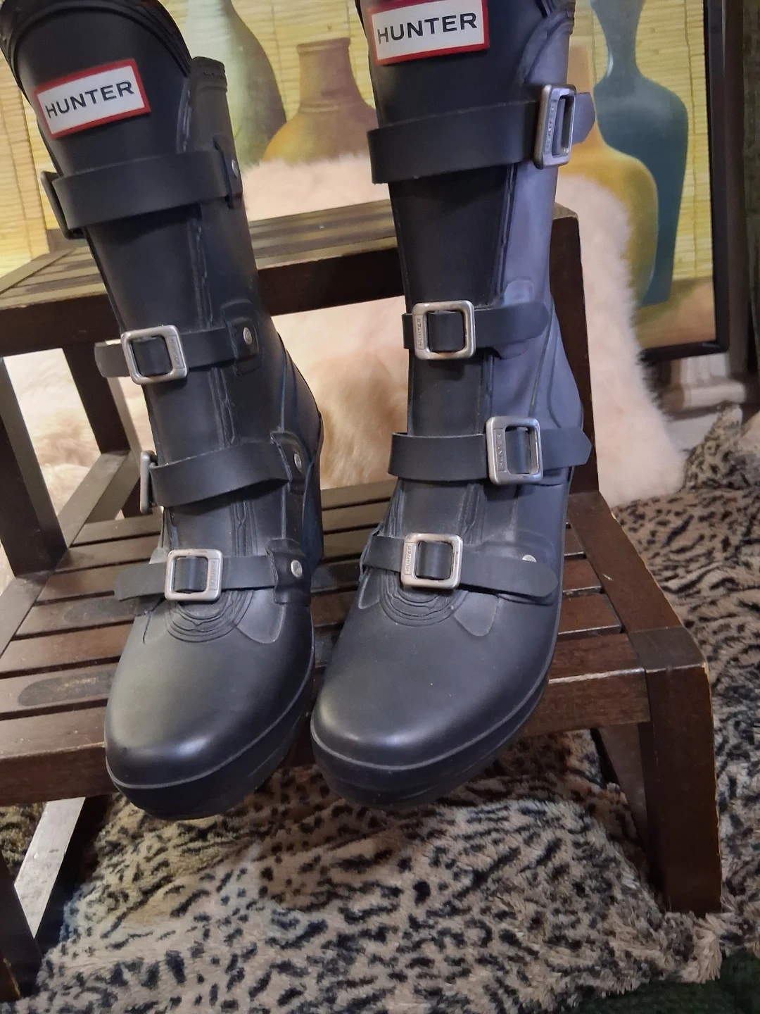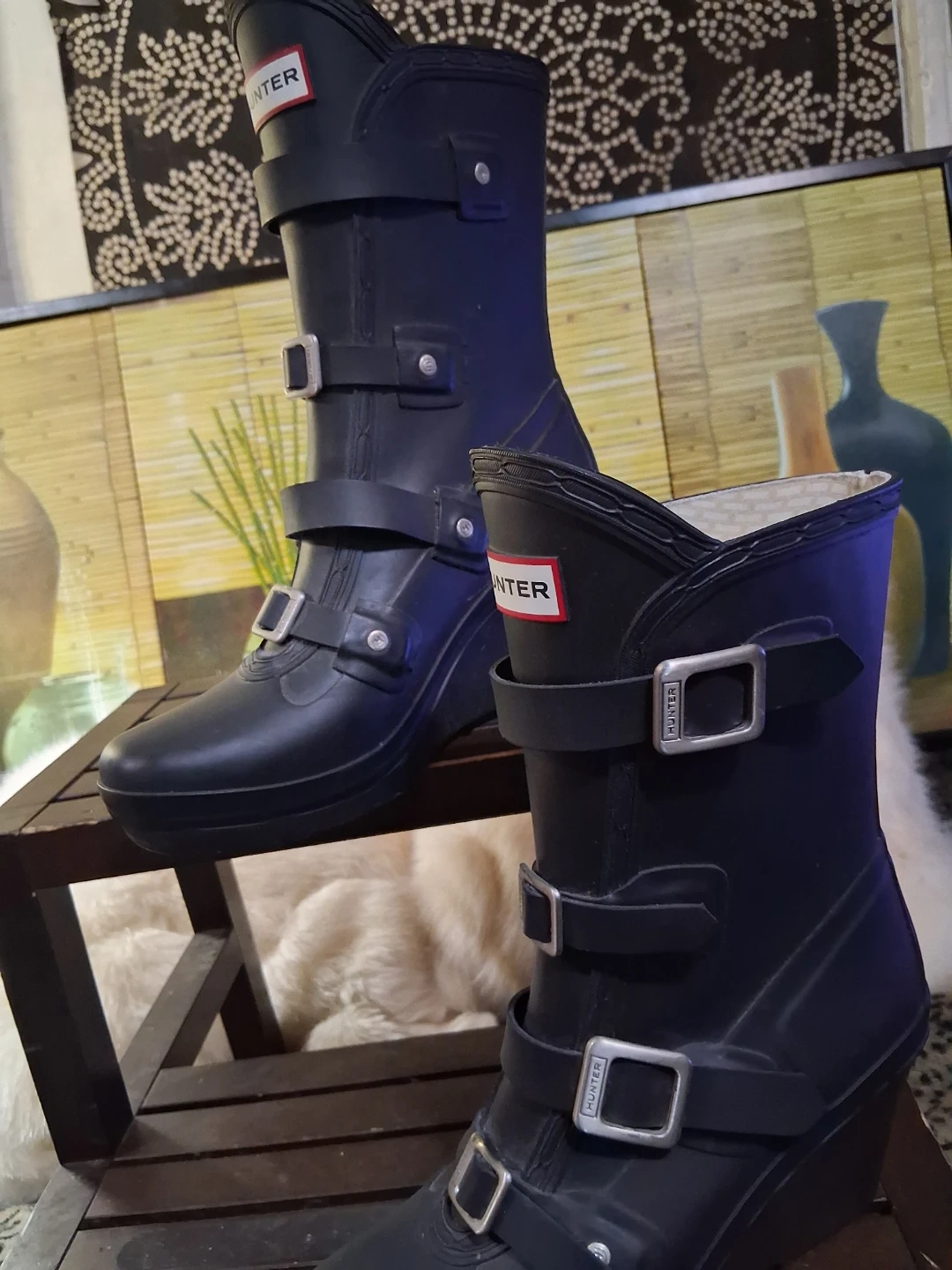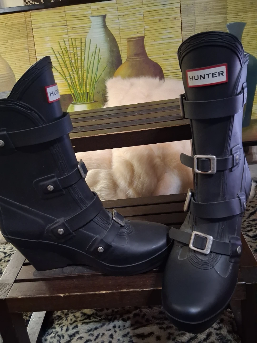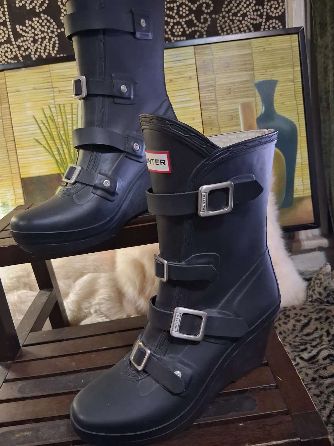 Selling a pair of Hunter black rubber wedge boots. They feature buckle detailing and are a US size 7. These stylish boots are perfect for rainy days and add a fashionable touch to any outfit!