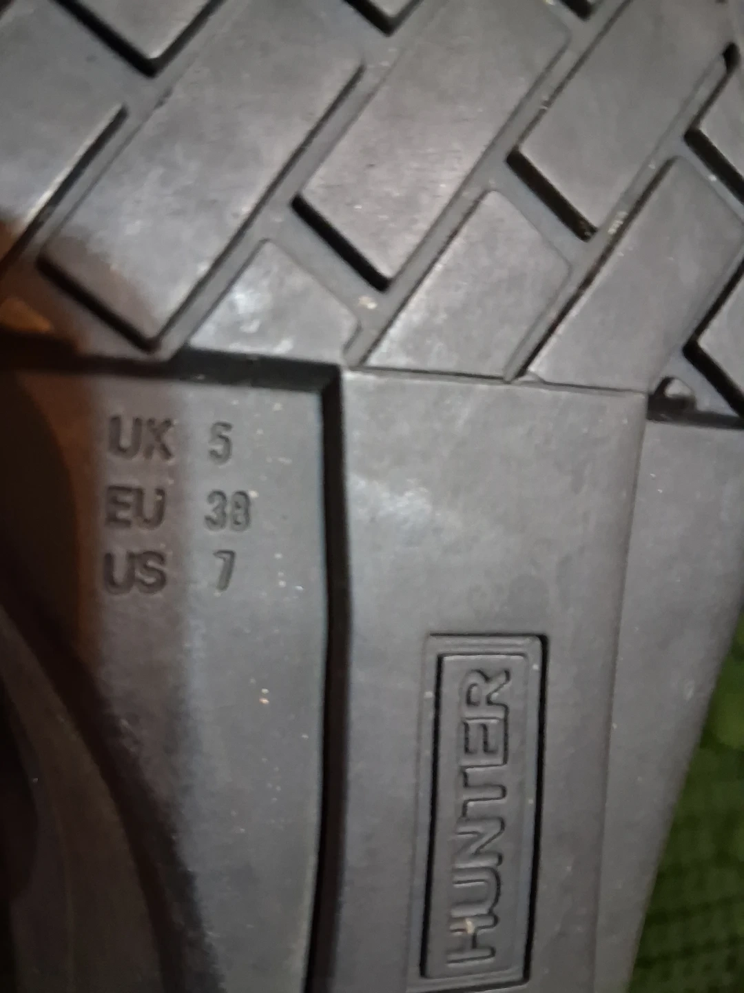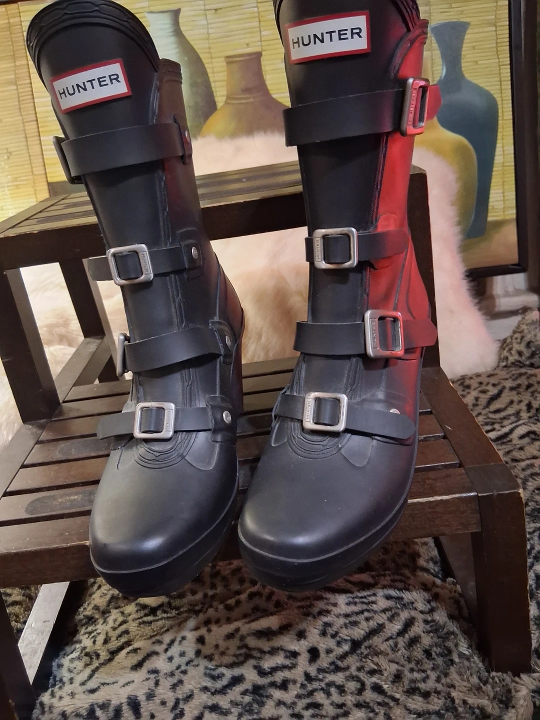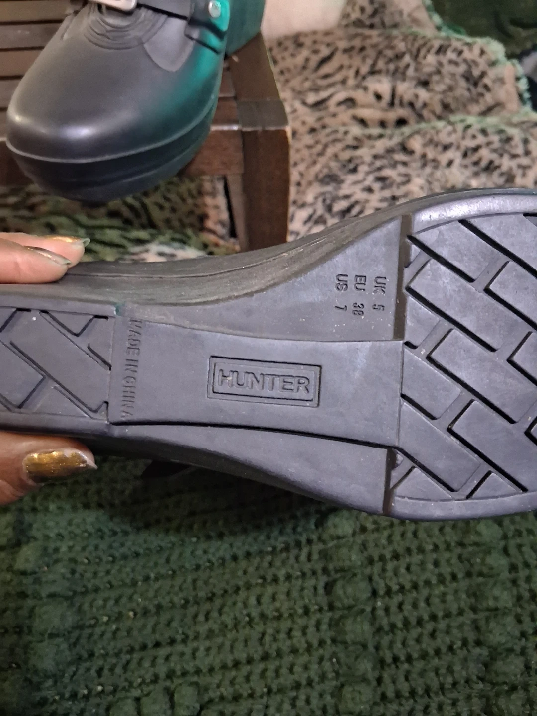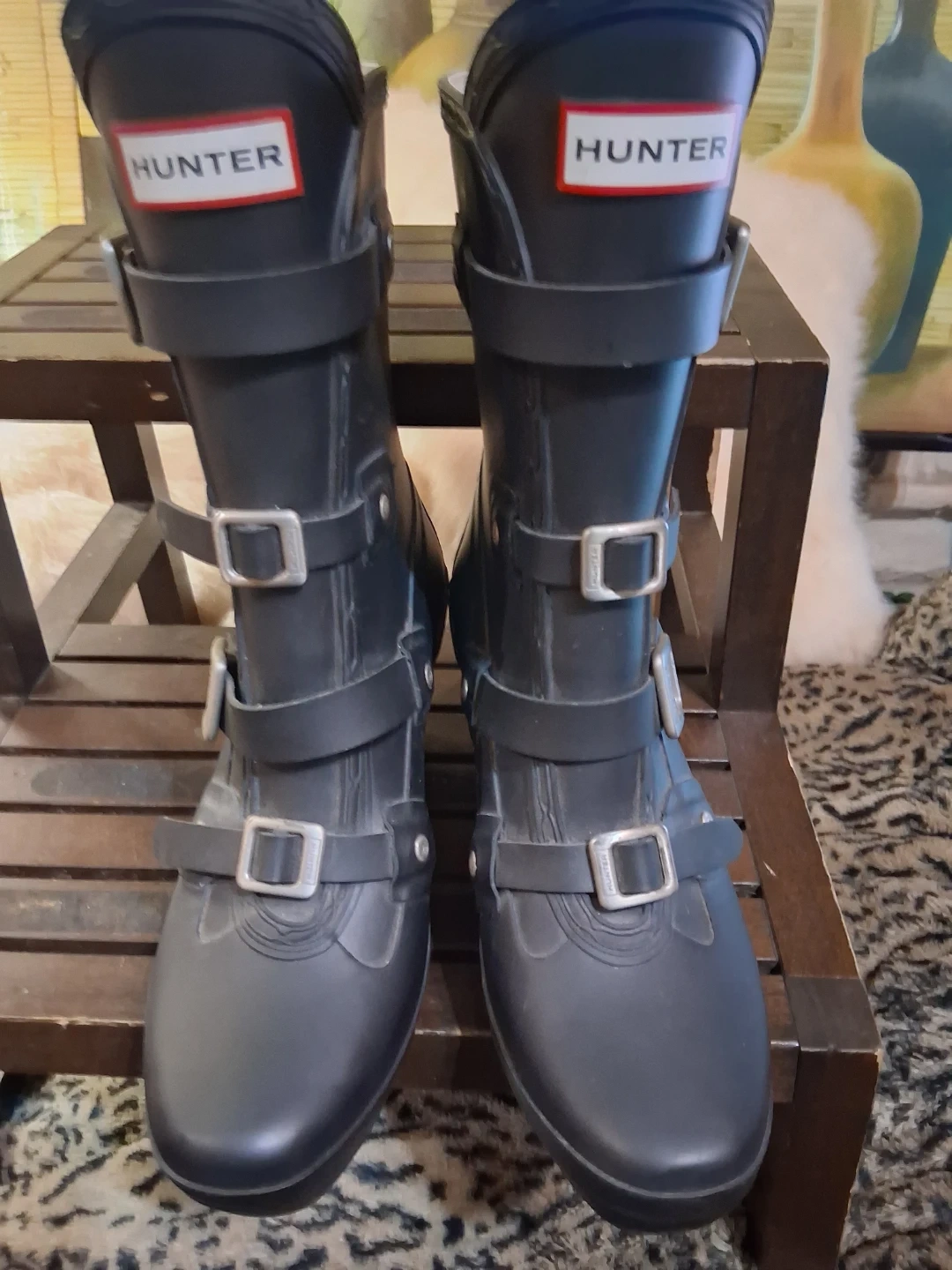 Selling a pair of Hunter black rubber wedge boots. They feature buckle detailing and are a US size 7. These stylish boots are perfect for rainy days and add a fashionable touch to any outfit!