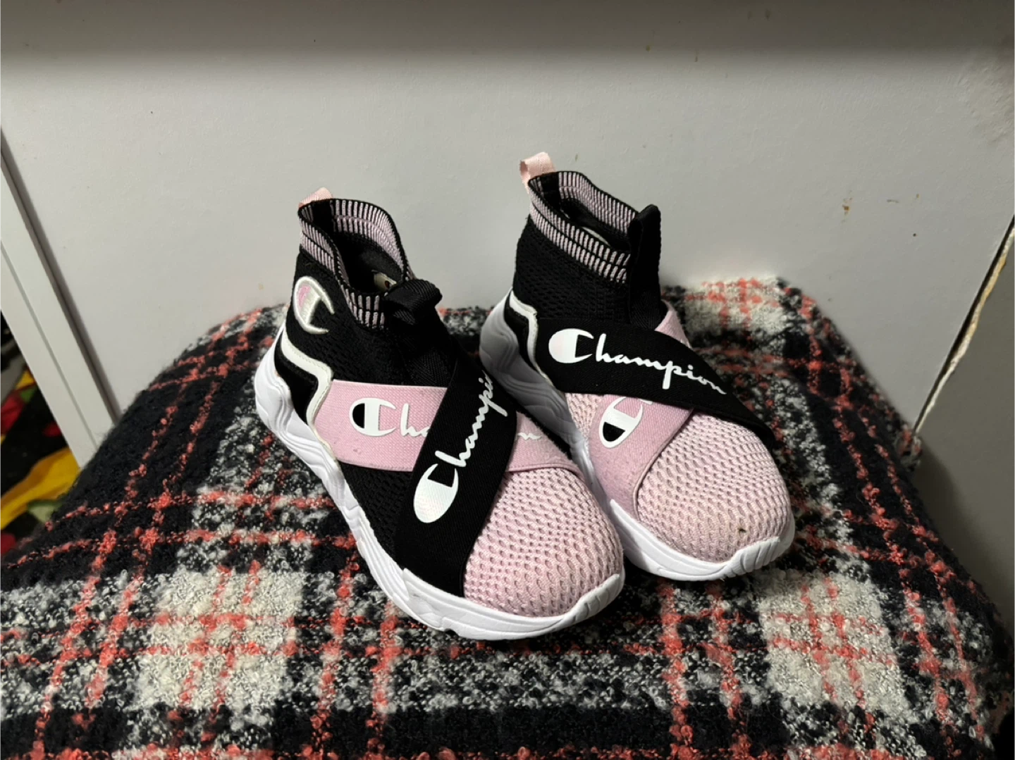 These Champion sneakers feature a sock-fit design for comfort and support. They have a black and pink color scheme with white accents. The elastic strap across the front provides a secure fit.