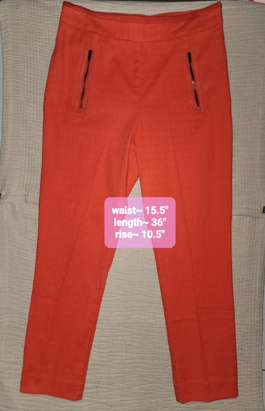 Stylish straight leg pants by #Cartonnier. Vibrant orange color. picture brightens the color of the orange a bit. measurements in pictures. Features zippered pockets. #new #nwt #anthro #charlie #ankle #straight #zipperedpockets #orange #rust #tailored #slim #highrise #trouser #classic #preppy #boho #bohemian #tom-boy #eclecticgrandpa #midcenturymodern #preppymodern #softgirl #scandiminimal #casual #businesscasual #office #work #professional #collegiate #college #professor #teacher #festival #festive #y2k #darkacademia #oldmoney #mobwife #maximalism #softgirl #fairy #spring #easter #resort #travel